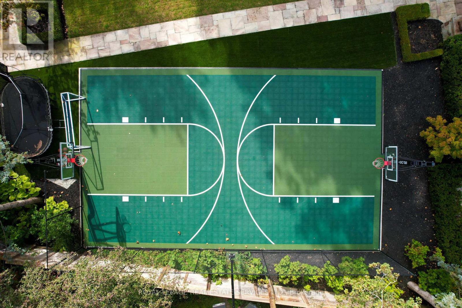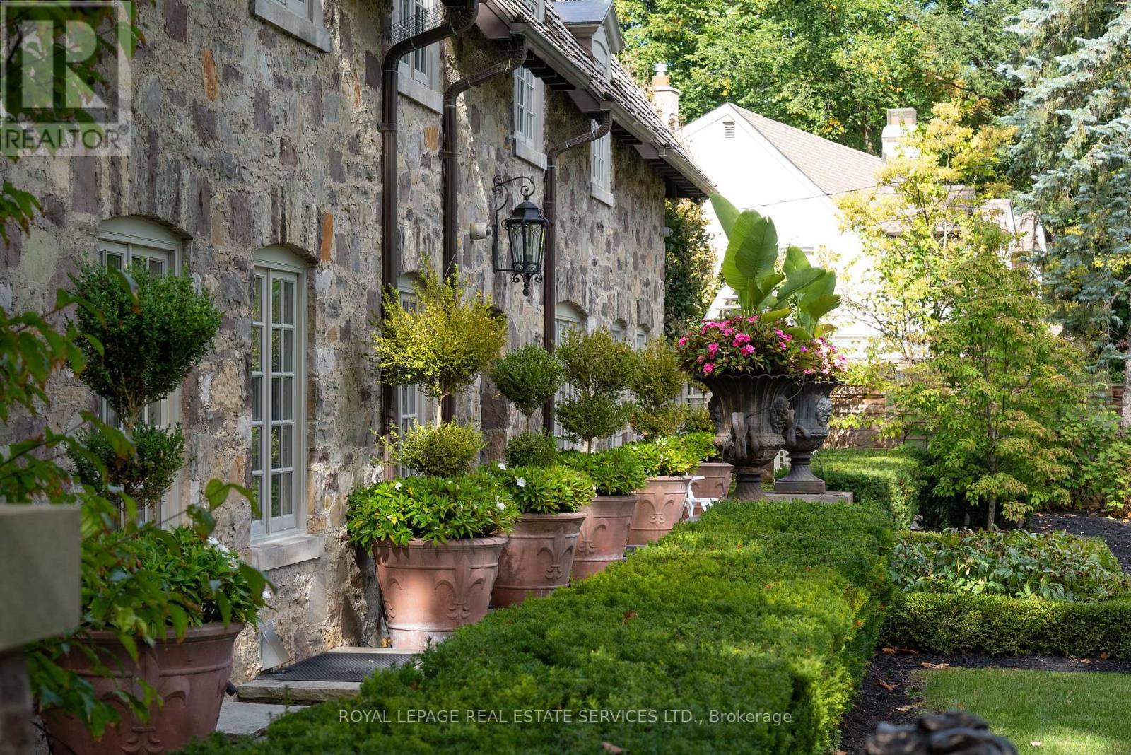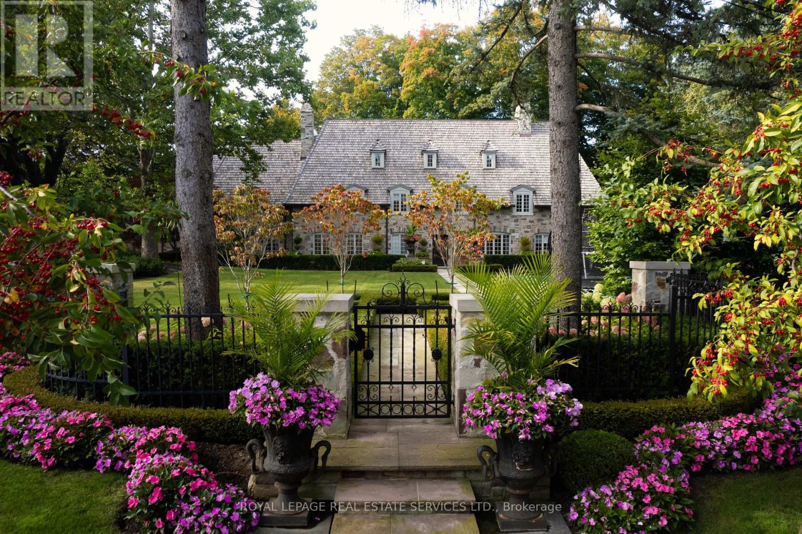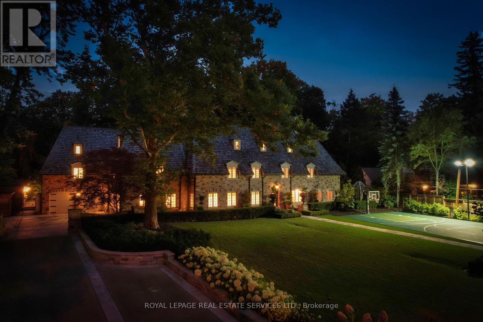 As one of Toronto's original landmark estates, the 'Rosewood Estate' sets the bar for uncompromising luxury in the city. Tucked discreetly at the end of a quiet cul-de-sac, the residence rests on a sprawling 1.12 acre private ravine lot. Reimagined in 2019 by acclaimed architect Lorne Rose, with interiors by Dvira Interiors, and built to exacting standards by JTF Custom Homes, the home is a masterclass in vision, craftsmanship, and enduring design. The approach is cinematic: a stone and wrought iron fence opens to manicured gardens, mature maple trees, and imported European planters that frame the limestone façade and cedar roofline. A heated drive and walkways lead to grounds designed for both grandeur and privacy, where an elegant saltwater pool, cabana, outdoor kitchen, fireplace, and a full sports court are seamlessly woven into the landscape. The gardens dissolve into a lush ravine backdrop, offering rare tranquility within the city. Inside, nearly 12,000 square feet of living space unfolds with quiet confidence. Timeless custom crown moulding and wainscoting, hand-carved marble fireplace mantels, and imported European wallpaper and hardware create a layered, textural narrative throughout. Built-in cabinetry and vanities by Falcon Kitchens anchor the principal rooms, while marble counters, bespoke lighting, custom drapery, and automated blinds reflect meticulous attention to detail. The chef's kitchen is equipped with a suite of luxury appliances, including a La Cornue range, and flows effortlessly into both formal living spaces designed for modern family life. The upper levels offer five serene bedrooms, including a primary retreat with soaring vaulted ceilings, dual bespoke dressing rooms, and a lavish marble-clad ensuite. The lower level rivals a private club, complete with a state-of-the-art theatre, glass-enclosed gym, recreation spaces, a nanny suite, and a large laundry room. Rosewood Estate is not merely a residence, it is a legacy property. (id:65552)