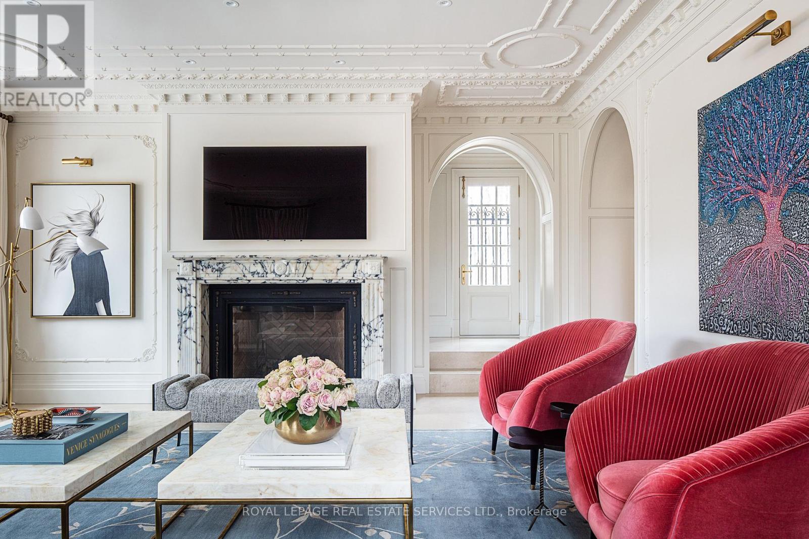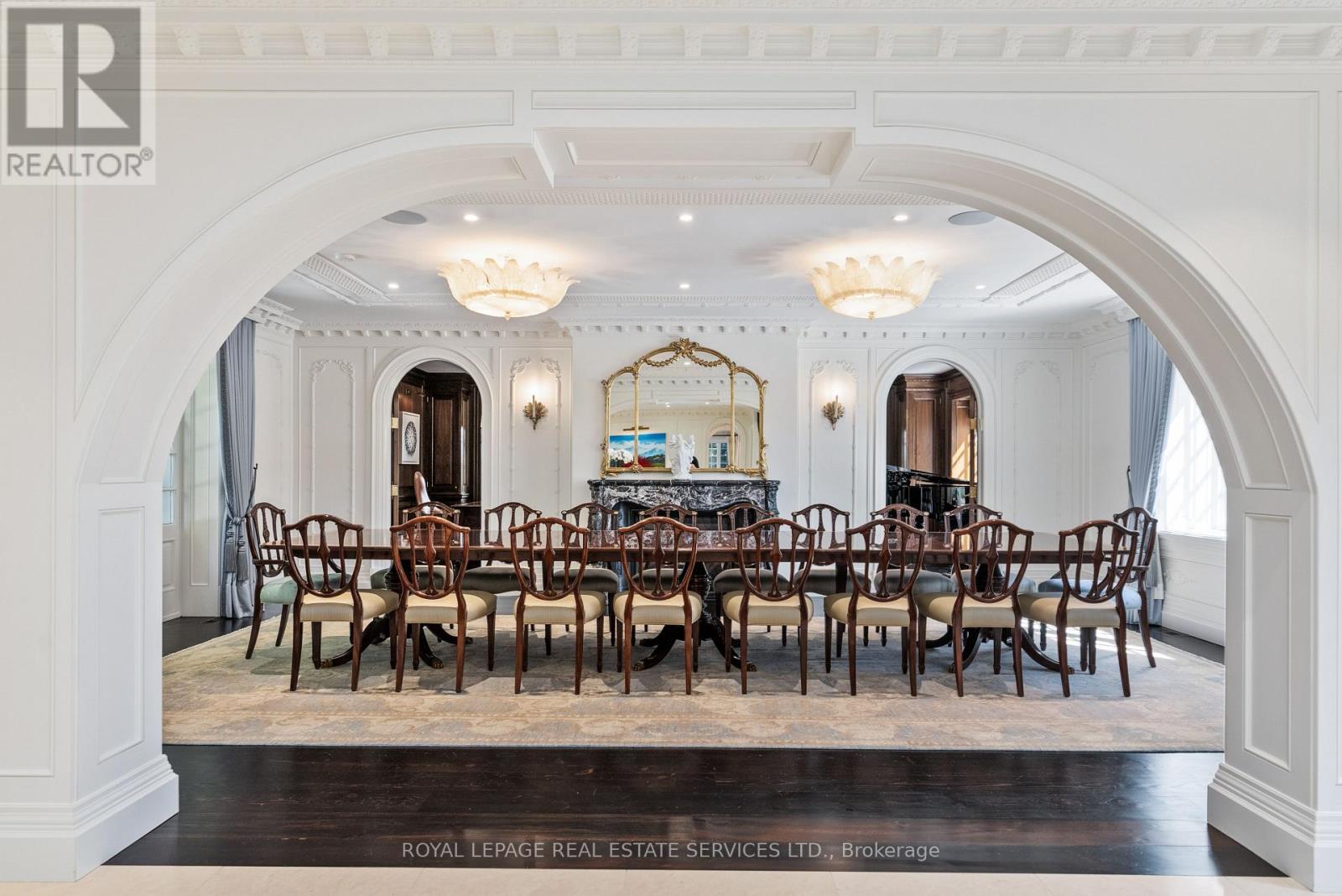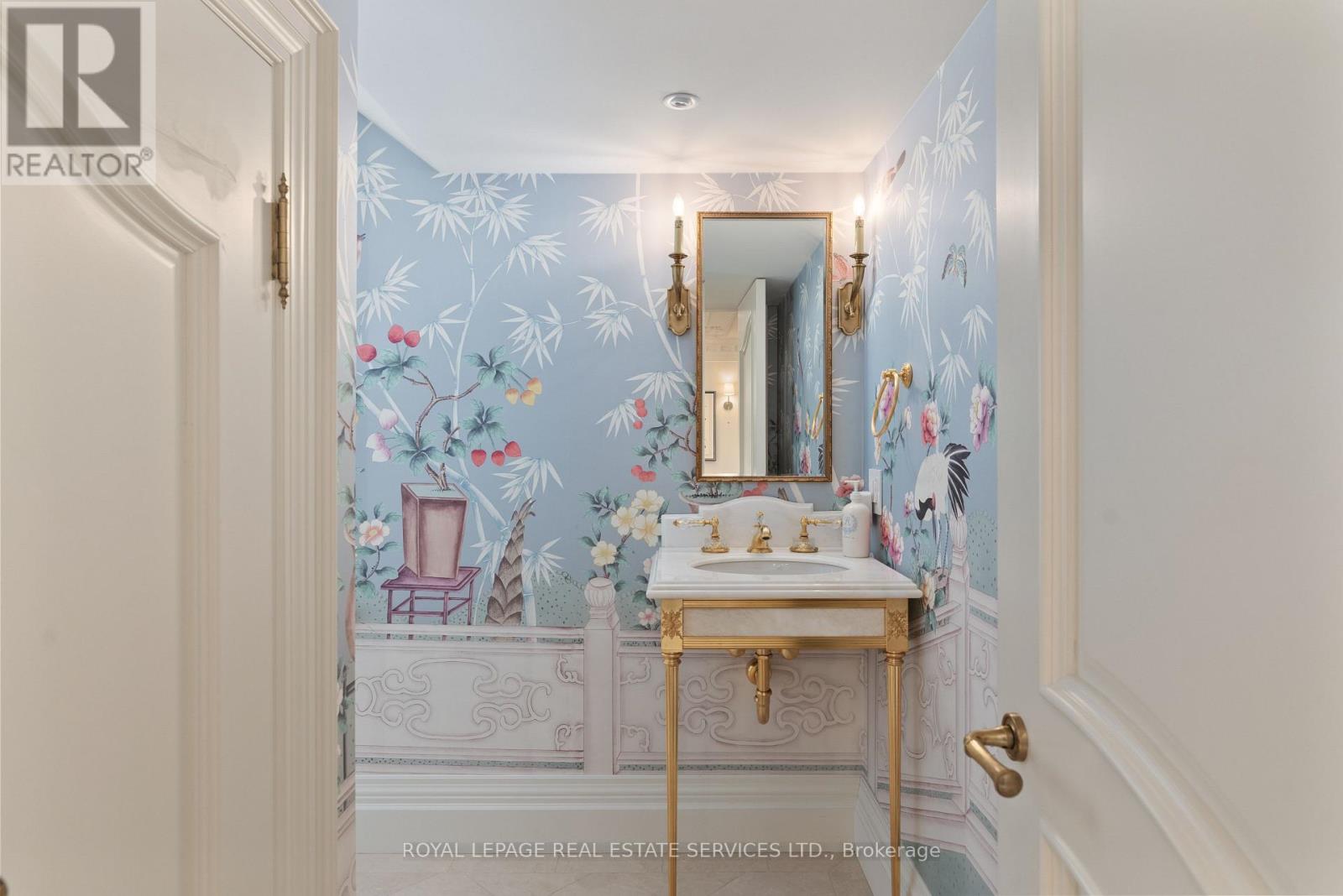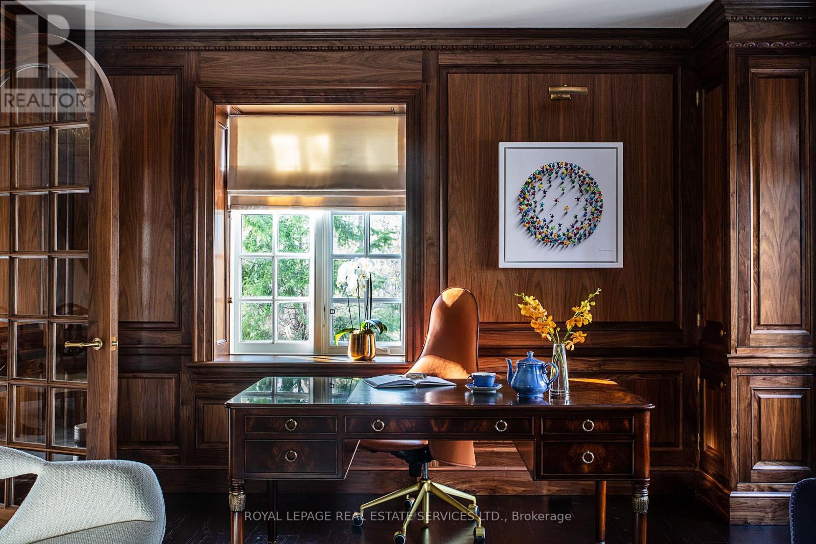 As one of Toronto's original landmark estates, the 'Rosewood Estate' sets the bar for uncompromising luxury in the city. Tucked discreetly at the end of a quiet cul-de-sac, the residence rests on a sprawling 1.12 acre private ravine lot. Reimagined in 2019 by acclaimed architect Lorne Rose, with interiors by Dvira Interiors, and built to exacting standards by JTF Custom Homes, the home is a masterclass in vision, craftsmanship, and enduring design. The approach is cinematic: a stone and wrought iron fence opens to manicured gardens, mature maple trees, and imported European planters that frame the limestone façade and cedar roofline. A heated drive and walkways lead to grounds designed for both grandeur and privacy, where an elegant saltwater pool, cabana, outdoor kitchen, fireplace, and a full sports court are seamlessly woven into the landscape. The gardens dissolve into a lush ravine backdrop, offering rare tranquility within the city. Inside, nearly 12,000 square feet of living space unfolds with quiet confidence. Timeless custom crown moulding and wainscoting, hand-carved marble fireplace mantels, and imported European wallpaper and hardware create a layered, textural narrative throughout. Built-in cabinetry and vanities by Falcon Kitchens anchor the principal rooms, while marble counters, bespoke lighting, custom drapery, and automated blinds reflect meticulous attention to detail. The chef's kitchen is equipped with a suite of luxury appliances, including a La Cornue range, and flows effortlessly into both formal living spaces designed for modern family life. The upper levels offer five serene bedrooms, including a primary retreat with soaring vaulted ceilings, dual bespoke dressing rooms, and a lavish marble-clad ensuite. The lower level rivals a private club, complete with a state-of-the-art theatre, glass-enclosed gym, recreation spaces, a nanny suite, and a large laundry room. Rosewood Estate is not merely a residence, it is a legacy property. (id:65552)