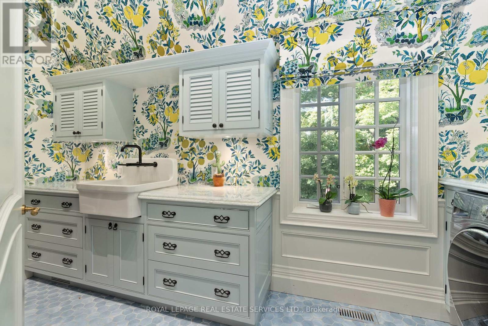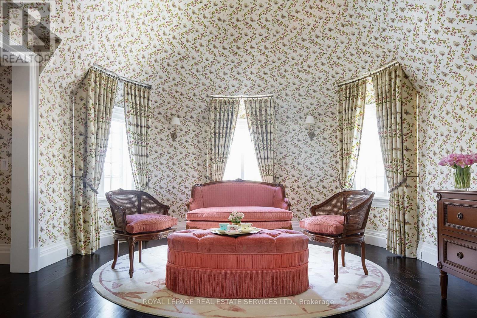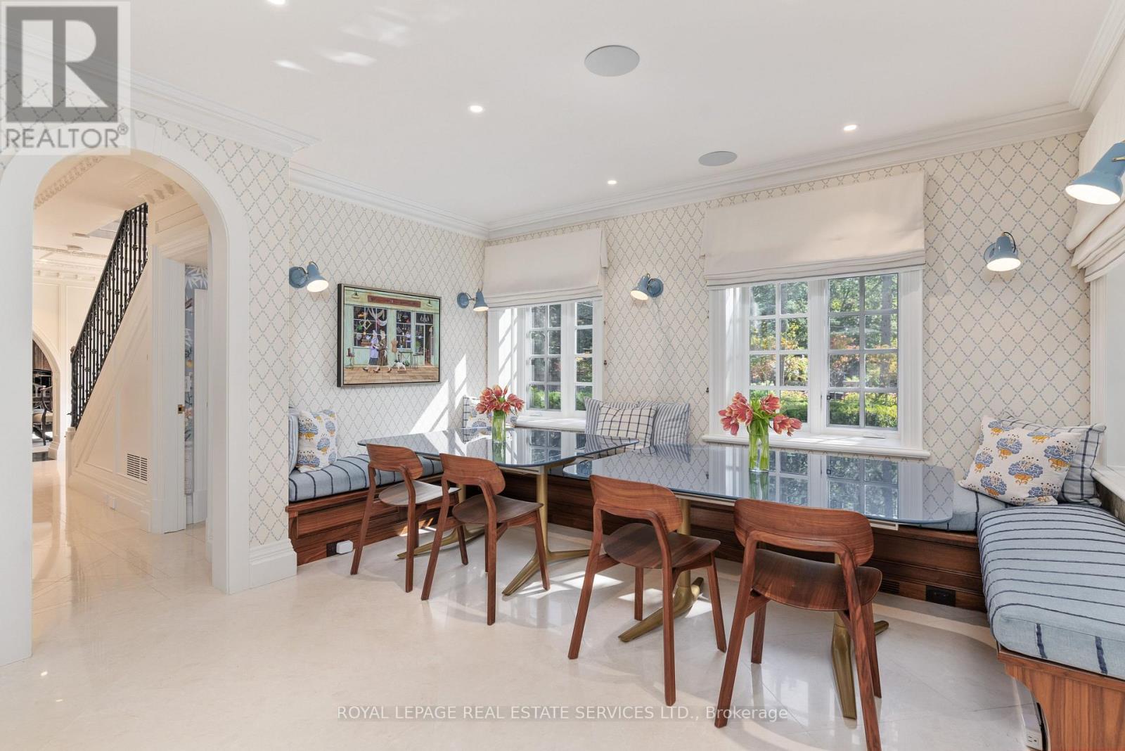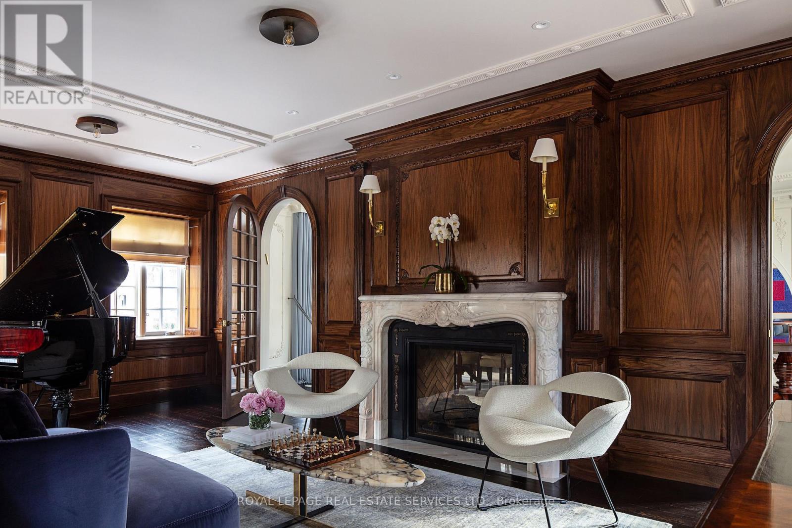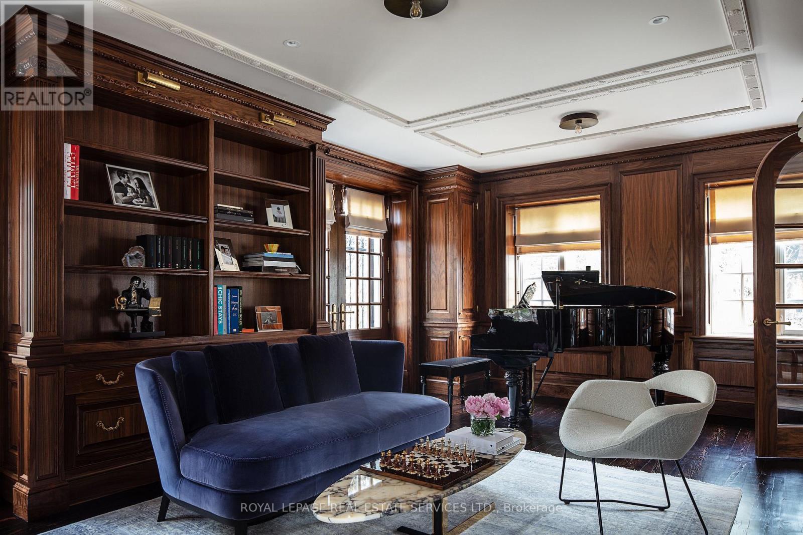 As one of Toronto's original landmark estates, the 'Rosewood Estate' sets the bar for uncompromising luxury in the city. Tucked discreetly at the end of a quiet cul-de-sac, the residence rests on a sprawling 1.12 acre private ravine lot. Reimagined in 2019 by acclaimed architect Lorne Rose, with interiors by Dvira Interiors, and built to exacting standards by JTF Custom Homes, the home is a masterclass in vision, craftsmanship, and enduring design. The approach is cinematic: a stone and wrought iron fence opens to manicured gardens, mature maple trees, and imported European planters that frame the limestone façade and cedar roofline. A heated drive and walkways lead to grounds designed for both grandeur and privacy, where an elegant saltwater pool, cabana, outdoor kitchen, fireplace, and a full sports court are seamlessly woven into the landscape. The gardens dissolve into a lush ravine backdrop, offering rare tranquility within the city. Inside, nearly 12,000 square feet of living space unfolds with quiet confidence. Timeless custom crown moulding and wainscoting, hand-carved marble fireplace mantels, and imported European wallpaper and hardware create a layered, textural narrative throughout. Built-in cabinetry and vanities by Falcon Kitchens anchor the principal rooms, while marble counters, bespoke lighting, custom drapery, and automated blinds reflect meticulous attention to detail. The chef's kitchen is equipped with a suite of luxury appliances, including a La Cornue range, and flows effortlessly into both formal living spaces designed for modern family life. The upper levels offer five serene bedrooms, including a primary retreat with soaring vaulted ceilings, dual bespoke dressing rooms, and a lavish marble-clad ensuite. The lower level rivals a private club, complete with a state-of-the-art theatre, glass-enclosed gym, recreation spaces, a nanny suite, and a large laundry room. Rosewood Estate is not merely a residence, it is a legacy property. (id:65552)