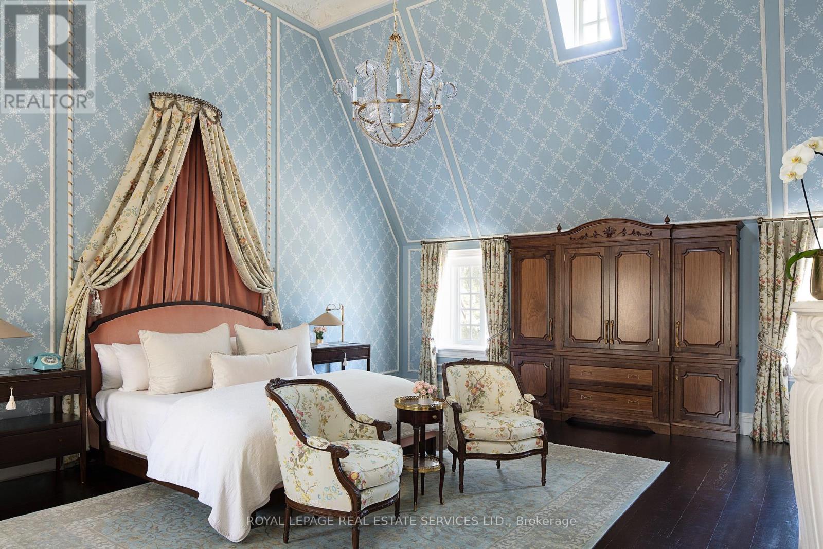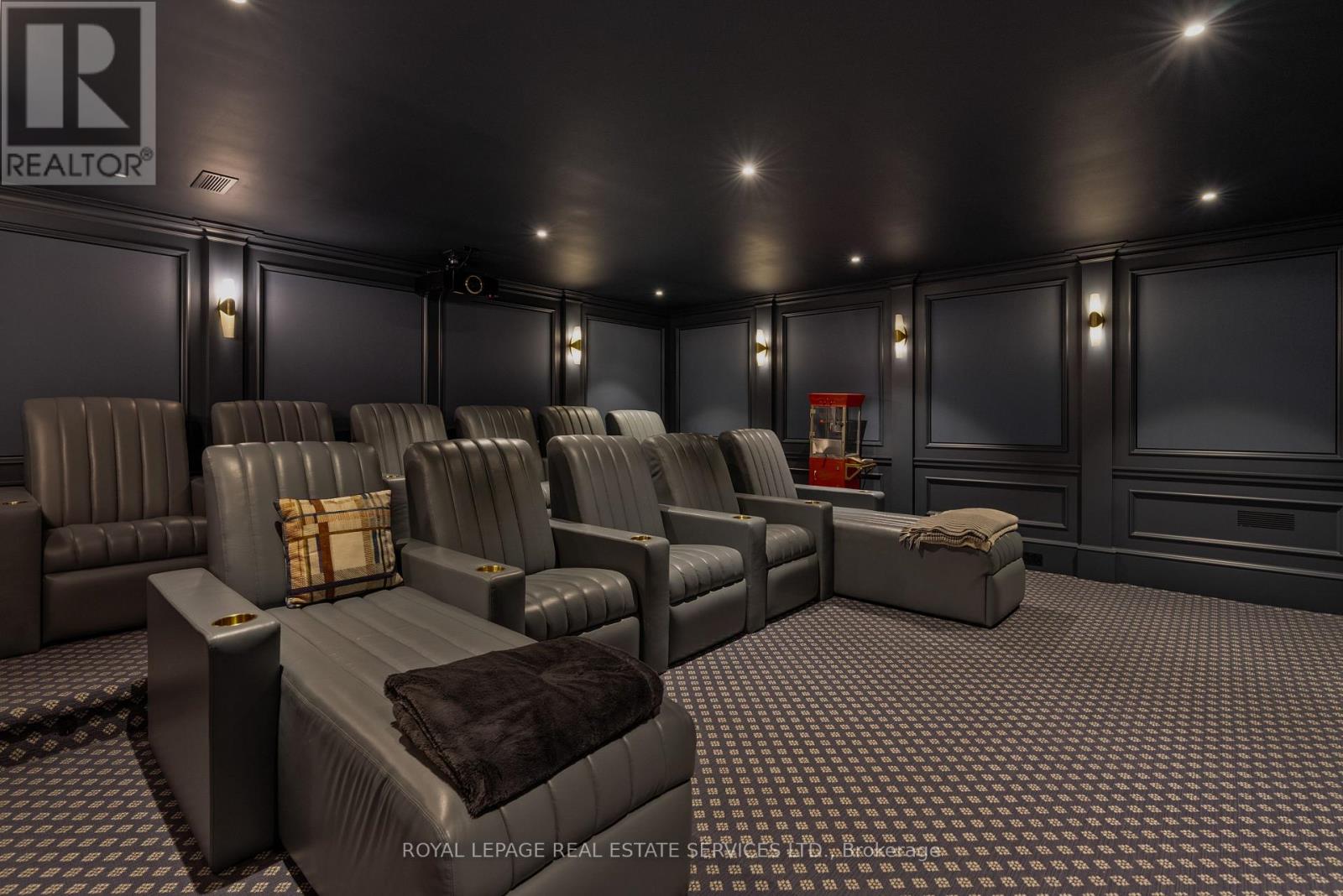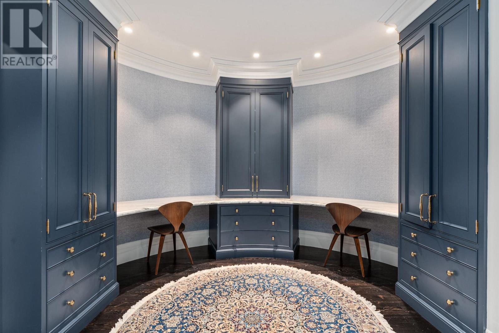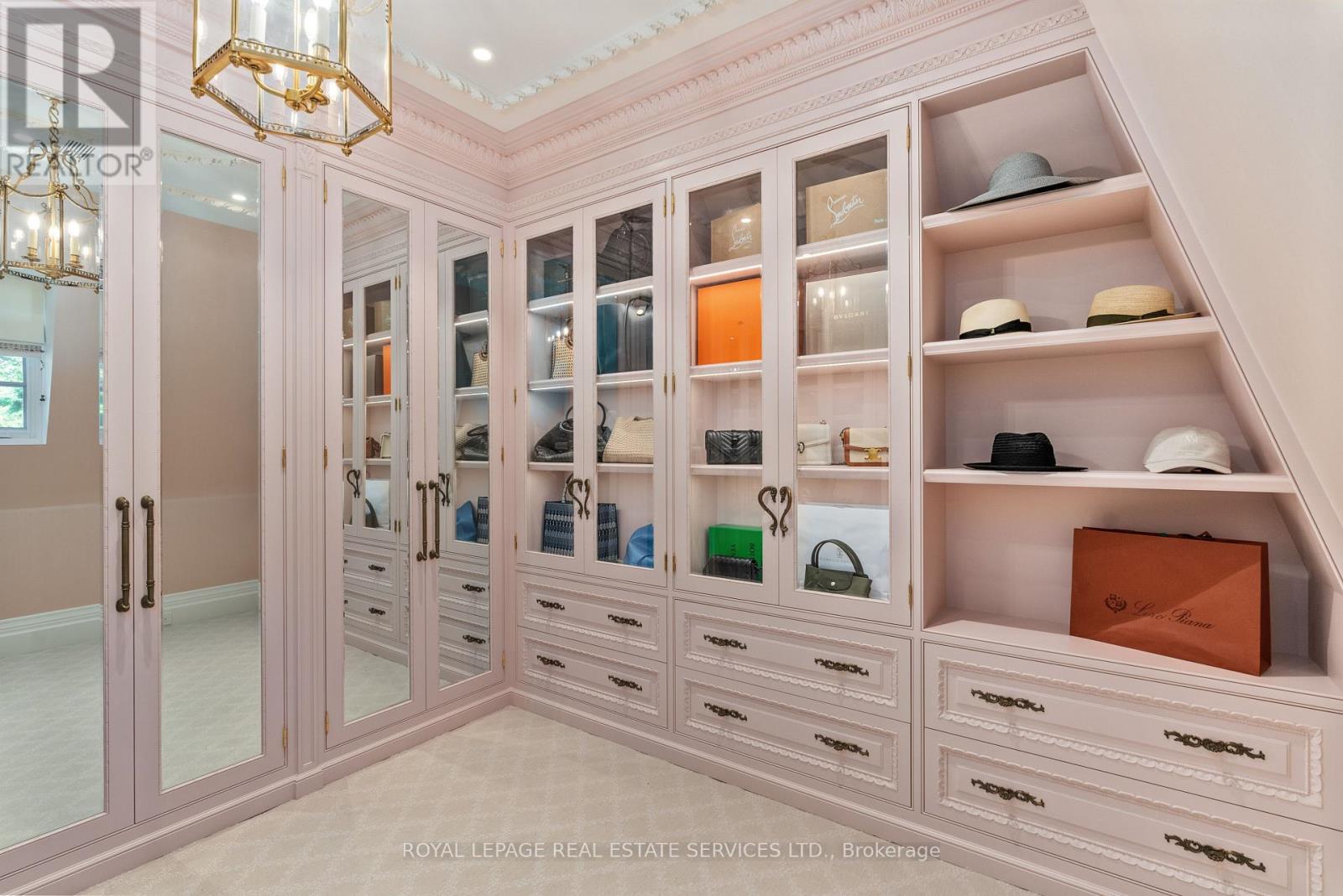 As one of Toronto's original landmark estates, the 'Rosewood Estate' sets the bar for uncompromising luxury in the city. Tucked discreetly at the end of a quiet cul-de-sac, the residence rests on a sprawling 1.12 acre private ravine lot. Reimagined in 2019 by acclaimed architect Lorne Rose, with interiors by Dvira Interiors, and built to exacting standards by JTF Custom Homes, the home is a masterclass in vision, craftsmanship, and enduring design. The approach is cinematic: a stone and wrought iron fence opens to manicured gardens, mature maple trees, and imported European planters that frame the limestone façade and cedar roofline. A heated drive and walkways lead to grounds designed for both grandeur and privacy, where an elegant saltwater pool, cabana, outdoor kitchen, fireplace, and a full sports court are seamlessly woven into the landscape. The gardens dissolve into a lush ravine backdrop, offering rare tranquility within the city. Inside, nearly 12,000 square feet of living space unfolds with quiet confidence. Timeless custom crown moulding and wainscoting, hand-carved marble fireplace mantels, and imported European wallpaper and hardware create a layered, textural narrative throughout. Built-in cabinetry and vanities by Falcon Kitchens anchor the principal rooms, while marble counters, bespoke lighting, custom drapery, and automated blinds reflect meticulous attention to detail. The chef's kitchen is equipped with a suite of luxury appliances, including a La Cornue range, and flows effortlessly into both formal living spaces designed for modern family life. The upper levels offer five serene bedrooms, including a primary retreat with soaring vaulted ceilings, dual bespoke dressing rooms, and a lavish marble-clad ensuite. The lower level rivals a private club, complete with a state-of-the-art theatre, glass-enclosed gym, recreation spaces, a nanny suite, and a large laundry room. Rosewood Estate is not merely a residence, it is a legacy property. (id:65552)