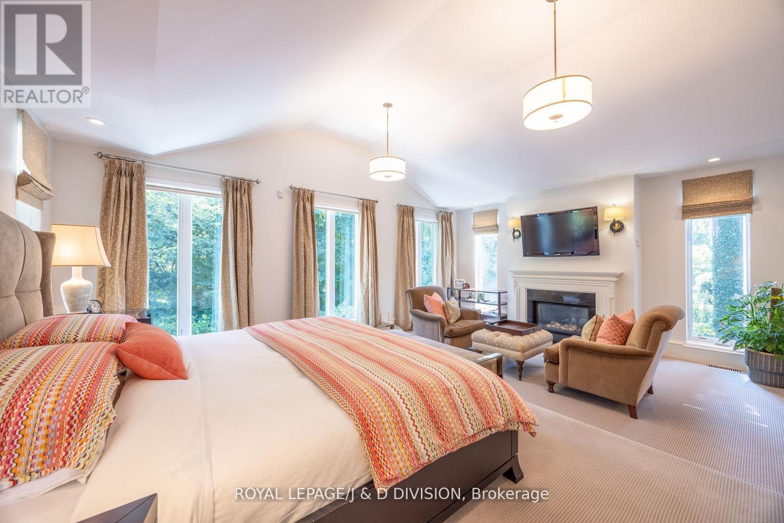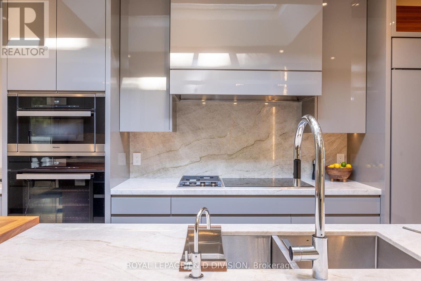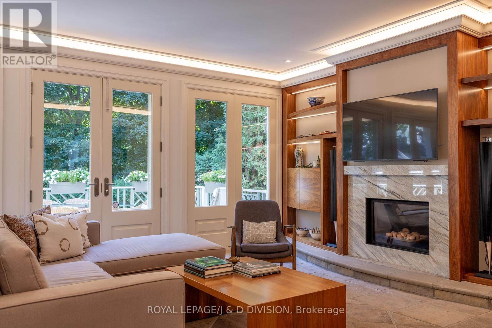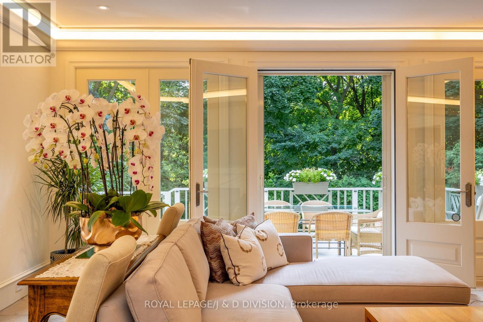 A rare opportunity to own a secluded ravine residence, gracefully set back from the street on an expansive 1/2 acre+ lot in one of Toronto's most private enclaves. Expansive, L-shaped lot, with gunite pool set to the side, and a home with 5,200+ square feet above grade that blends transitional design with timeless style. Surrounded by mature trees & a picturesque ravine, this estate offers the feeling of country living. Grand interior foyer with two-storey south windows, flagstone floors, and a sweeping staircase. The main floor is designed to entertain from formal garden views, gracious living and dining rooms, a chef's kitchen featuring an atrium skylight, Tahj Mahal Quartzite island, walnut details, and top-of-the-line appliances, connecting to a sun-filled breakfast room with fireplace and Nano doors that open to the outside. Family room with detailed millwork, walk out to a deck and panoramic views over the ravine and pool. Main floor also includes large home office off the side hallway, powder room, guest/nanny bedroom, 3-piece bath, laundry and mud room with access to the double garage. Second floor is expansive with five generous sized bedrooms, three bathrooms including a primary suite with sitting area, fireplace, spa-inspired ensuite, and tranquil views of the gardens and ravine. Lower level features upgraded mechanics, bright, playful recreation room with built-ins, cozy reading nook, fireplace, 3-piece bath, and walk-out access to the pool. The exquisite garden is designed by landscape architect Ron Holbrook, featured in Canadian House & Home and included in local garden tours. Highlights include a charming gazebo, potter's shed, large grass area for children to play, a deck ideal for al fresco dining and summer entertaining with sun awning, gunite pool with hot tub-surrounded by complete privacy, is embraced by the ravine and lush landscaping. Unmatched privacy so close to top schools, walk to Yonge Street amenities, and steps to Rosedale Golf Club.