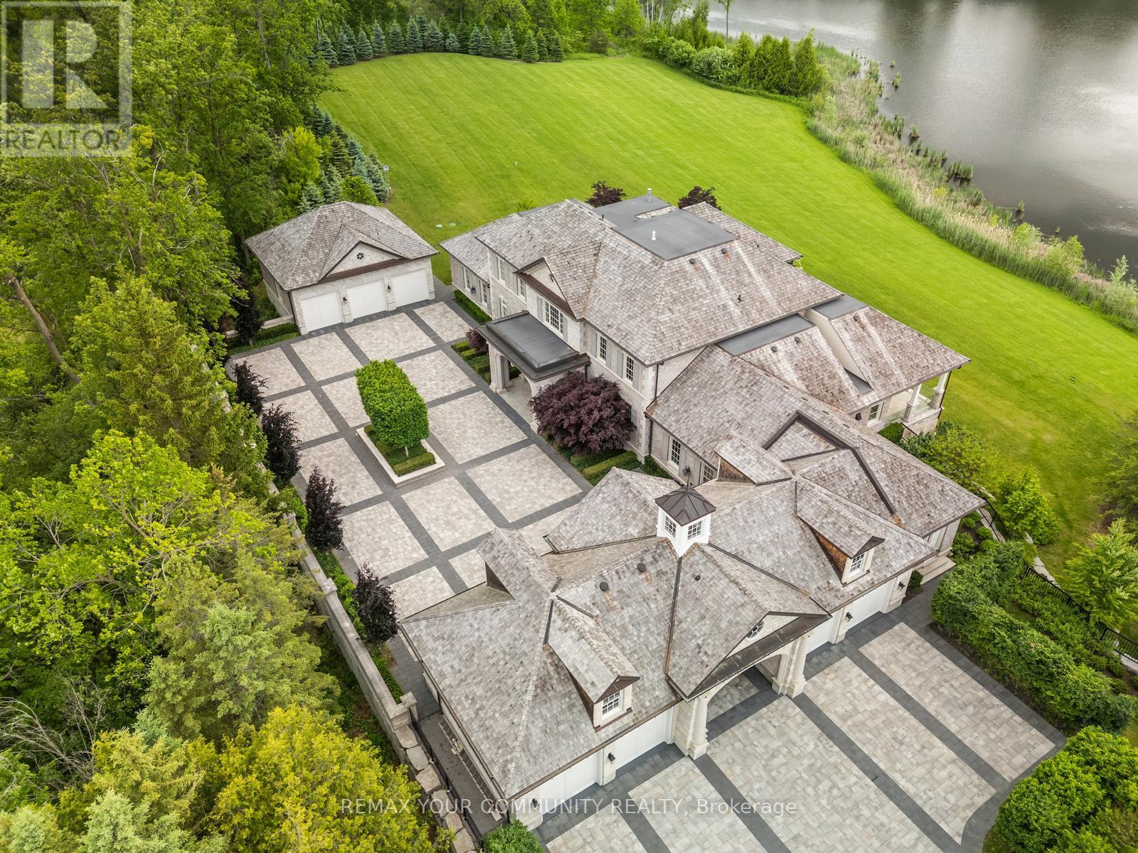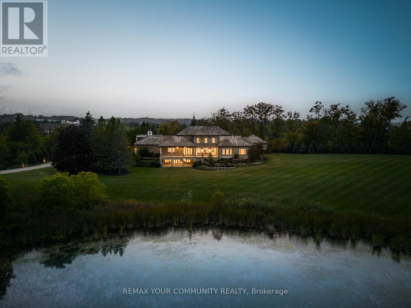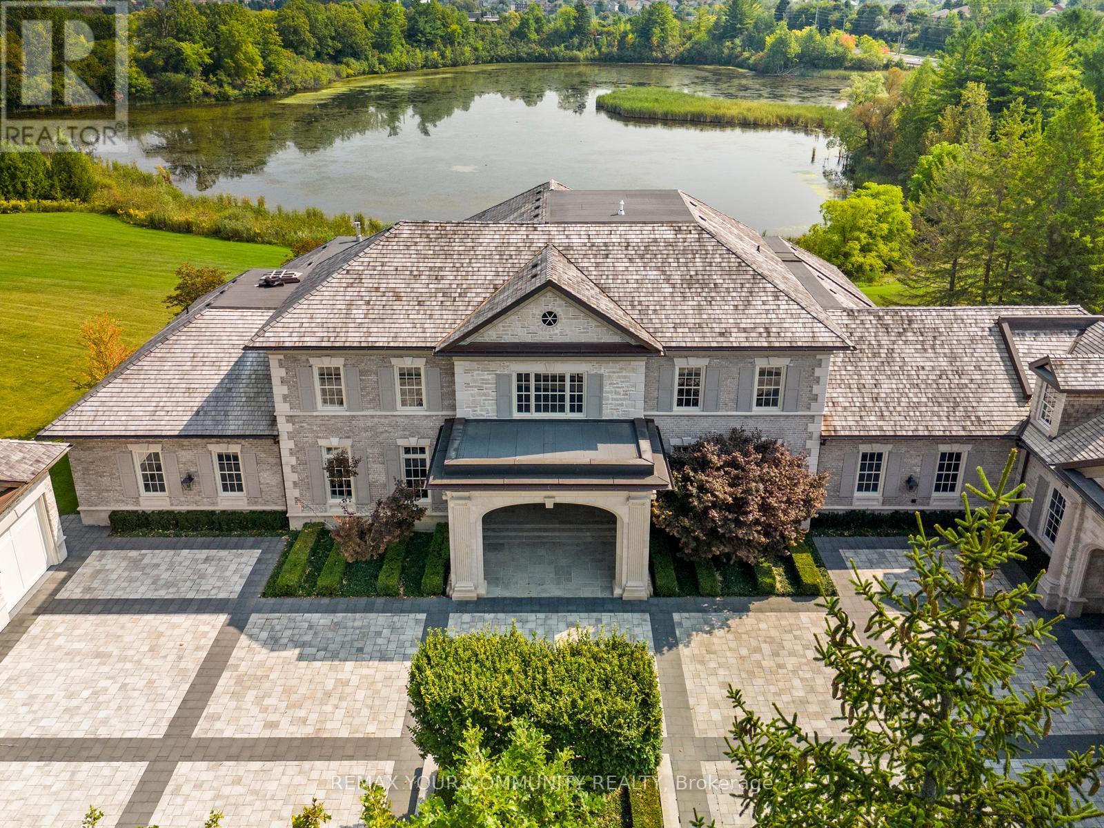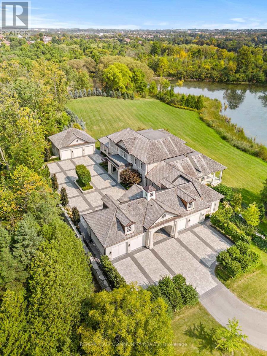 The Sanctuary! Spectacular family compound and entertainers estate on 35+ acres with private 15-acre spring-fed pond. Gated entrance, winding drive, circular motor court, and porte-cochere create an impressive welcome. Over 13,000 square feet of meticulously crafted living space with the finest materials and exceptional attention to detail. Main floor principal suite features grand entrance, his & hers dressing rooms, private office, and bar. Gourmet kitchen with top-of-the-line appliances, large windows, and terrace/pond views. Great room with marble fireplace and walk-out to terrace. Dining room with glass-encased wine storage and courtyard view. All bedrooms with ensuites' and walk-in closets. Finished walk-out basement with in-law suite potential. Hard surface floors throughout. 7-car garage, 27 parking spaces. Fully landscaped, magnificent water views, and the privacy. Walking distance to St. Andrews College & St. Anne's School. Close to Aurora Village amenities. A rare offering in a prestigious location! (id:65552)