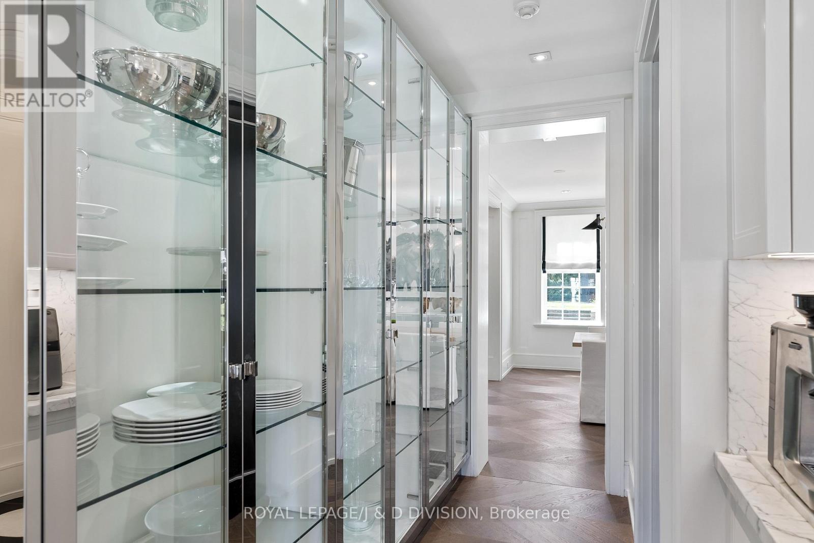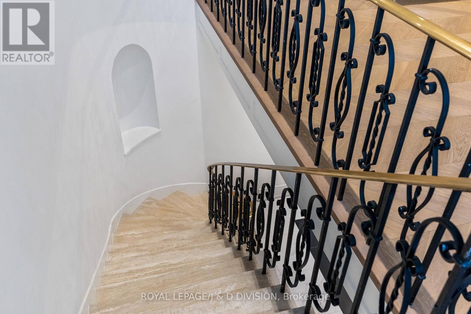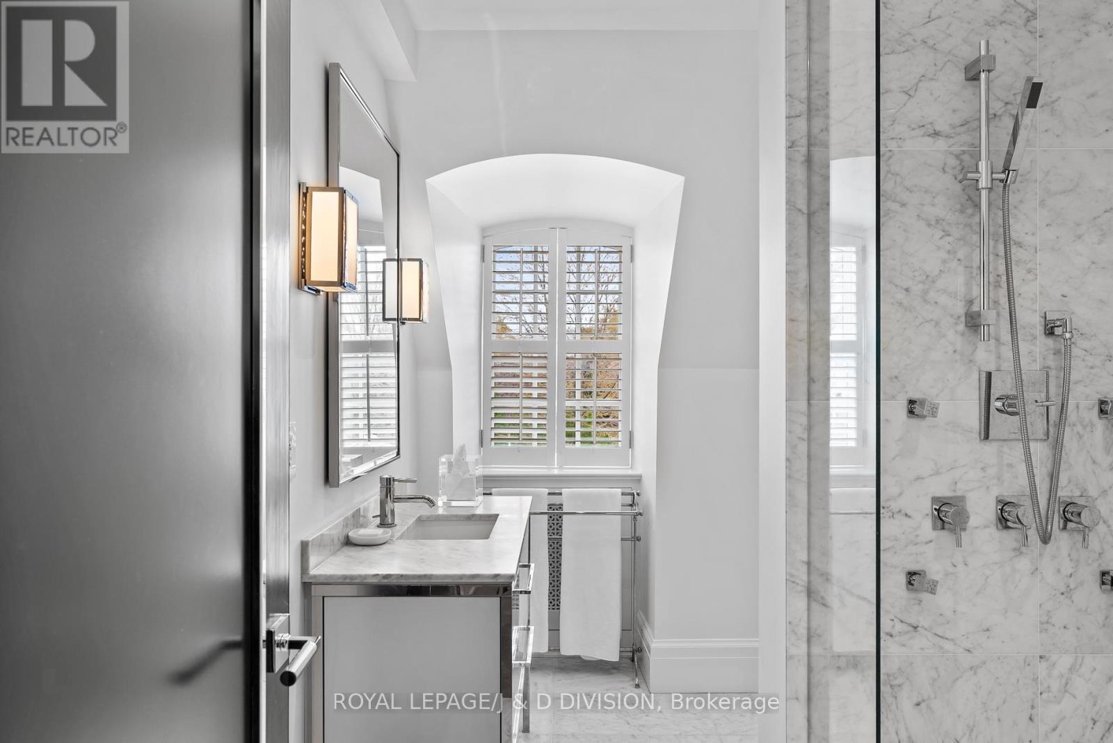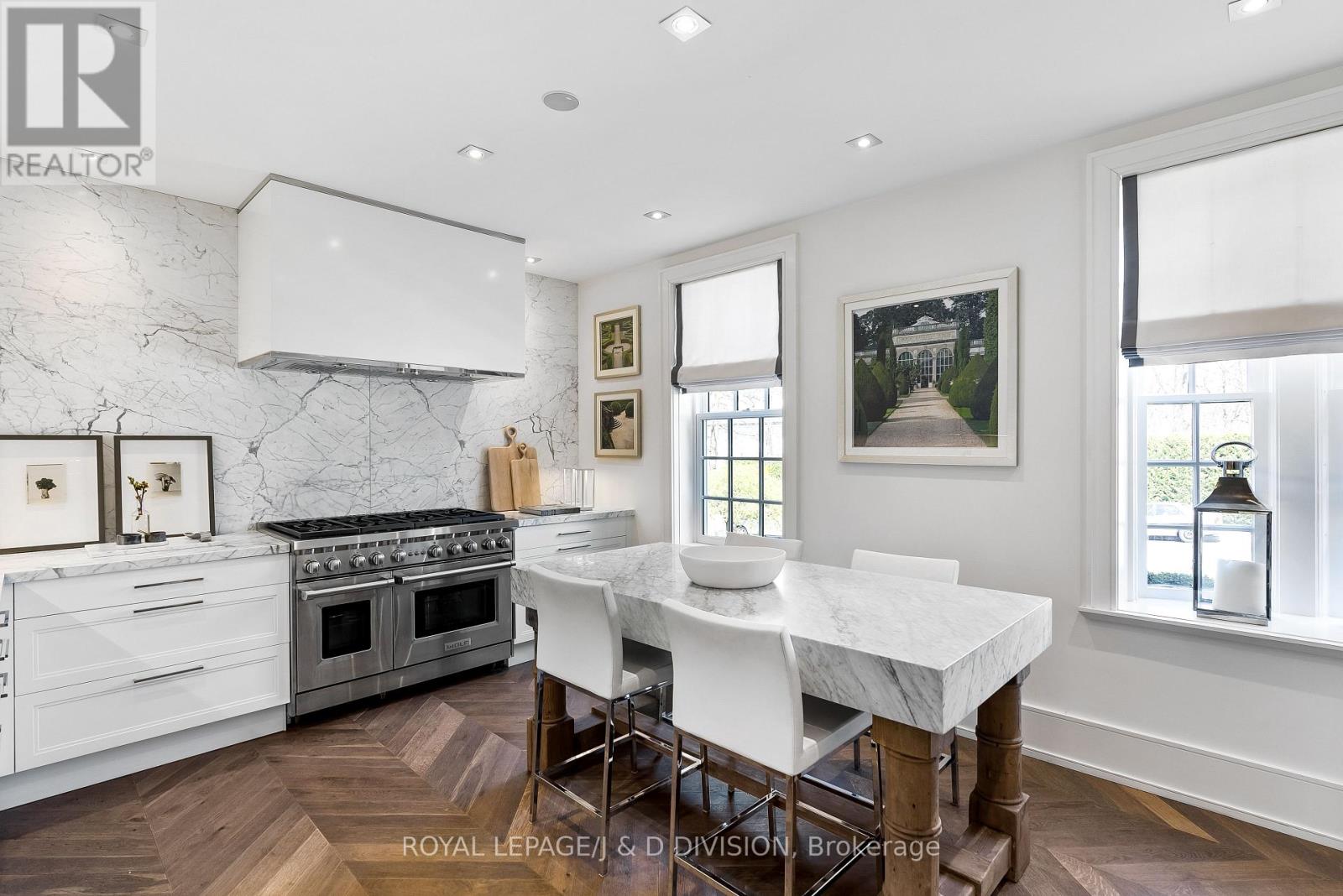 One of the most epic Georgians in the city. Completely and elegantly renovated; seamlessly marrying character and fine contemporary finishes with over 6500 sq ft of living space. A custom Downsview kitchen features stunning floor to ceiling cabinetry, Staturietto marble, and Wolf and Miele appliances. Exceptional millwork and craftsmanship blend with European white oak flooring and under floor heating. Outstanding marble foyer with elegant staircase leads to large light filled rooms with modern curated fixtures. Fresh, relevant design flows through all spaces, including a primary suite with two expansive dressing rooms and ensuite spa-like bath. Every bedroom is similarly appointed with custom cabinetry and classic marble. Chic and sophisticated lower level with Downsview stainless steel bar and every essential appliance - perfect for effortless entertaining. Cool, crisp, lower level bathroom includes a wet steam room and spa shower. Additional living spaces are a fourth floor movie room complete with surround sound. An oversized lot surrounded by mature trees offers a private sanctuary in the center of the city. A gated two car garage allows for added security. There is no more perfect location in the city, steps to UCC, blocks from BSS, a short drive to Bloor St and under 30 minutes to the airport. This prestigious Georgian, renovated to perfection, offers luxury and brilliant design in the center of the city. (id:65552)