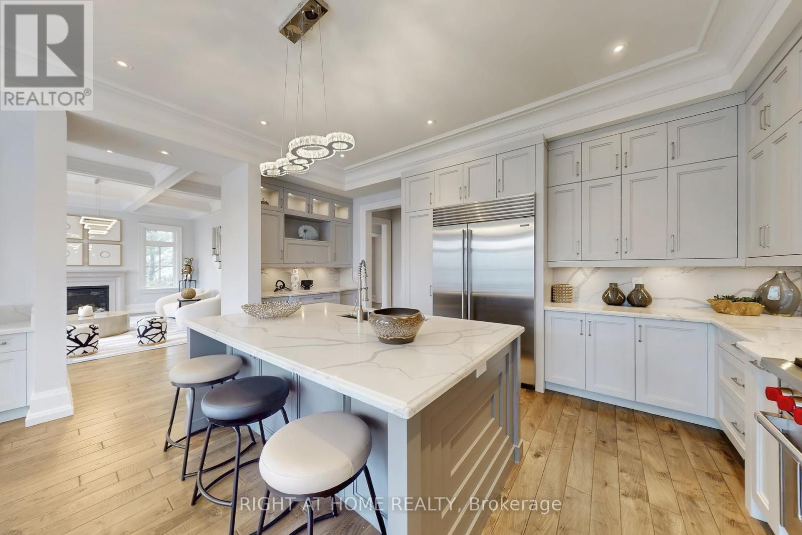 Situated in Aurora's most prestigious gated enclave, this custom-built estate embodies privacy, security, and timeless sophistication, set against the backdrop of a stunning ravine with captivating views. Designed for elegant living and everyday comfort, the home features a gourmet kitchen with top-tier Sub-Zero fridge and freezer, Wolf gas range and oven, a grand family room with coffered ceilings and fireplace, refined formal living and dining areas, and a private study, all seamlessly connected by an elevator to every level.The primary suite offers a tranquil retreat with its own fireplace, spa-inspired ensuite, and dual walk-in closets. Each additional bedroom features its own ensuite and walk-in closet. Heated floors in all second-floor bathrooms, a convenient laundry room, and exquisite finishes enhance everyday living.The walk-out lower level expands the lifestyle with a second kitchen, oversized bedrooms, multiple bathrooms, a covered porch, and breathtaking ravine views. Featuring three fireplaces, dual HVAC and laundry systems, in-ground sprinkler system, a three-car garage, and parking for up to eight vehicles, this exceptional home delivers a rare blend of luxury, functionality, and natural beauty in one of Aurora's most exclusive settings. Ideally located less than 10 minutes from St. Andrew's College, St. Anne's School, and Country Day School, this residence offers both luxury and convenience. (id:65552)