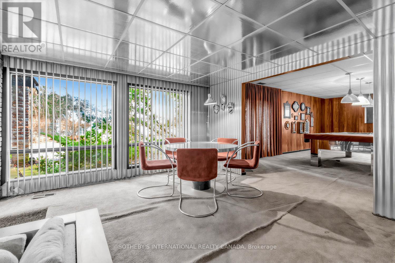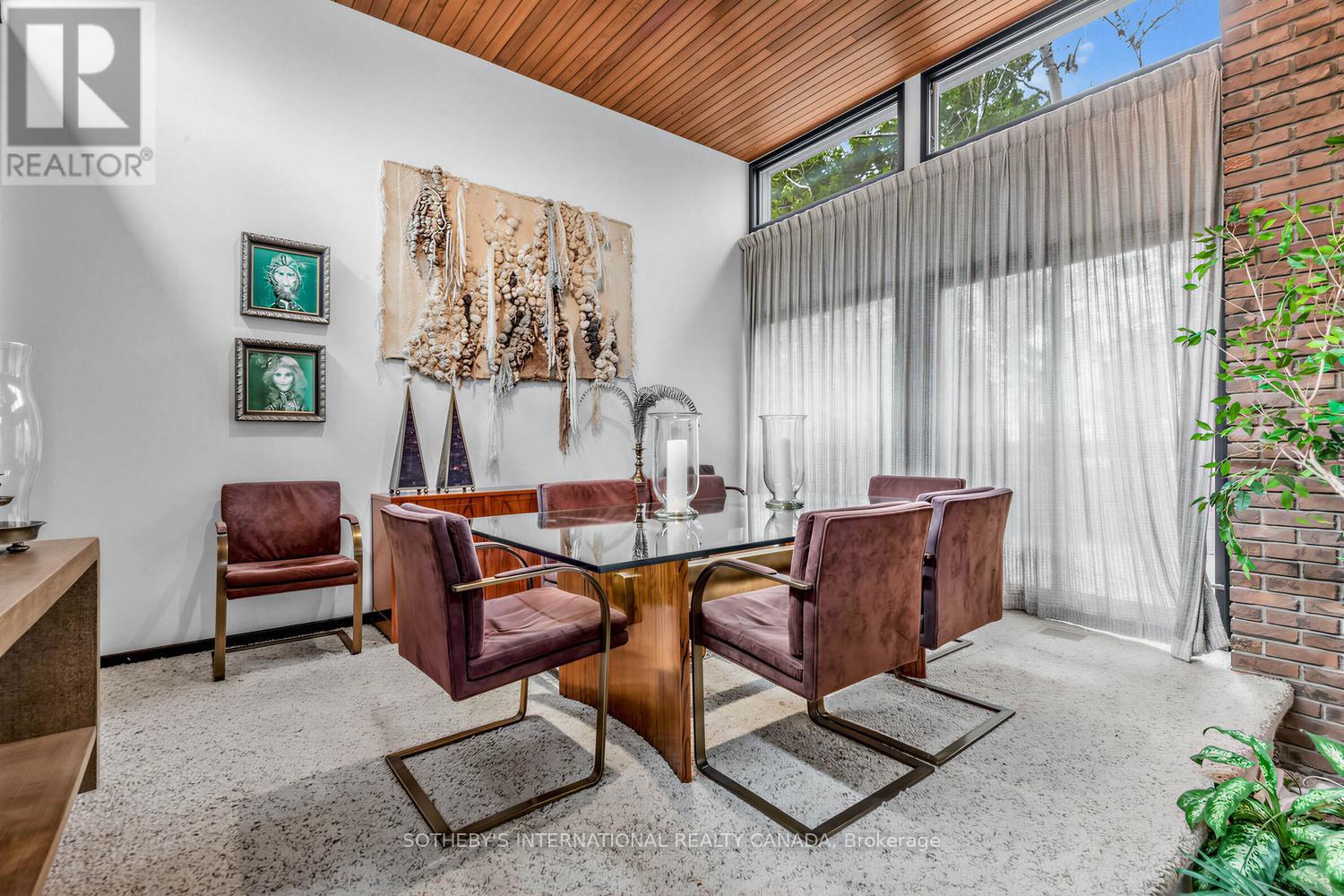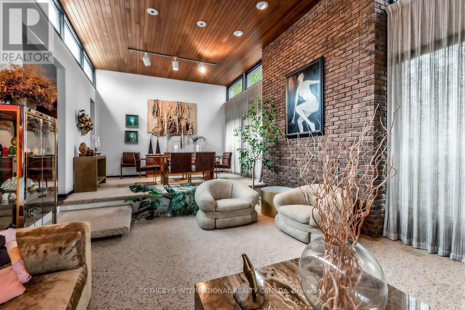 Tucked into a serene, tree-lined setting in prestigious Bridle Path area this architecturally distinctive bungalow offers exceptional scale, privacy, and opportunity customize, renovate, or build new. The home sits on a rare 100 x 133 ft lot and enjoys mature landscaping that creates a peaceful, ravine-like backdrop with beautiful wooded views.The main level spans approximately 2,844 sq. ft. and features a thoughtfully designed layout with 4 bedrooms, including a spacious primary retreat with a 5-piece ensuite. The home showcases generous principal rooms that include a sun-filled living room with floor-to-ceiling windows and a formal dining room that overlooks the living space. The kitchen connects seamlessly to a warm family room that offers a walk-out to an expansive deck and creates ideal indoor-outdoor living.A defining feature highlights the dramatic living area, which boasts soaring ceilings, rich wood detailing, and oversized windows that flood the interior with natural light. The design reflects a striking mid-century modern influence and provides a unique canvas to update, renovate, or enjoy as-is.The fully finished lower level spans approximately 2,844 sq. ft. and expands the living space with a large recreation room that features a fireplace, sunken sitting area and a walk-out to the garden. The lower level also includes a billiards or games room, a separate sitting area, a bar, and extensive storage, which together support both family living and entertaining on a grand scale . The property includes an attached 2-car garage and a private drive that accommodates additional parking. The home sits in a quiet, established neighbourhood that offers a strong sense of community and convenient access to top schools, parks, and amenities .This property presents a rare opportunity to secure a substantial home on a prime lot in one of Toronto's most coveted enclaves.