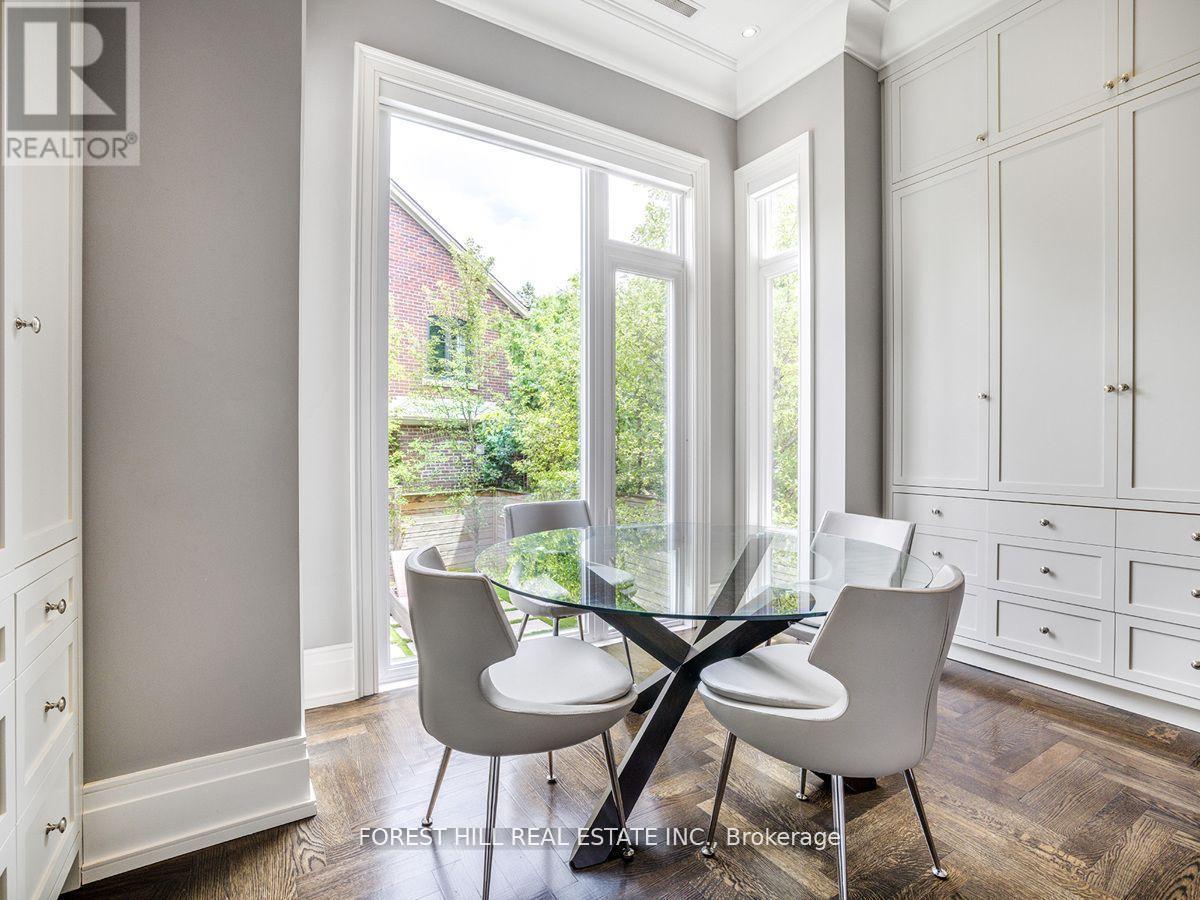Welcome to Toronto's most prestigious neighbourhoods, where timeless elegance and modern sophistication come together in this architectural masterpiece by Lorne Rose Architect. Offering approximately 6,150 sq.ft. of total luxury living space, this residence has been thoughtfully designed to combine functionality, comfort, and style. Featuring 4+1 bedrooms, the home provides ample space for family living and refined entertaining. The primary bedroom retreat is a true sanctuary, showcasing custom wood paneling, an expansive dressing room, and a luxurious 5-piece spa-inspired ensuite. Indulge in marble slab finishes, heated floors, a deep soaker tub, and a walk-in glass shower designed for ultimate relaxation. Entertain and gather in the large principal rooms, each crafted with meticulous attention to detail and superior finishes. The open-concept family room and kitchen seamlessly connect to the living and dining rooms, creating a warm yet sophisticated flow ideal for both intimate evenings and large gatherings. The custom chefs kitchen is a showstopper, featuring upgraded cabinetry, stunning herringbone hardwood flooring, and an oversized quartz centre island with integrated stainless steel sink, Perrin & Rowe faucet, breakfast bar, and additional storage. Modern glass shelving framed with stainless steel accents further elevate the contemporary design. The fully finished lower level is designed for ultimate comfort and recreation, complete with heated floors, built-in storage, gym, sauna, nanny's quarters, and a spectacular recreation room anchored by a designer bar. Additional conveniences include two laundry rooms, heated marble flooring in the foyer and basement, and state-of-the-art finishes throughout. Perfectly located, this home is within walking distance to Upper Canada College, Bishop Strachan School, Forest Hill Public School, Forest Hill Collegiate, as well as boutique shops, fine dining, transit, and everything this coveted community has to offer.