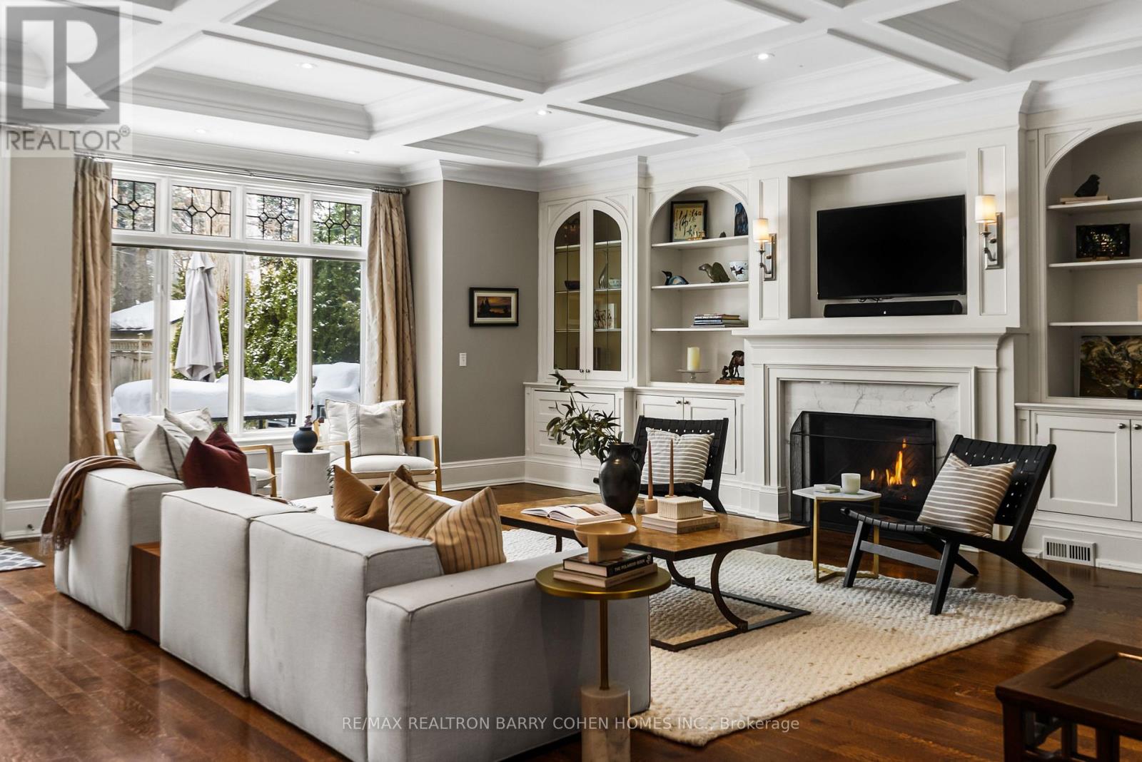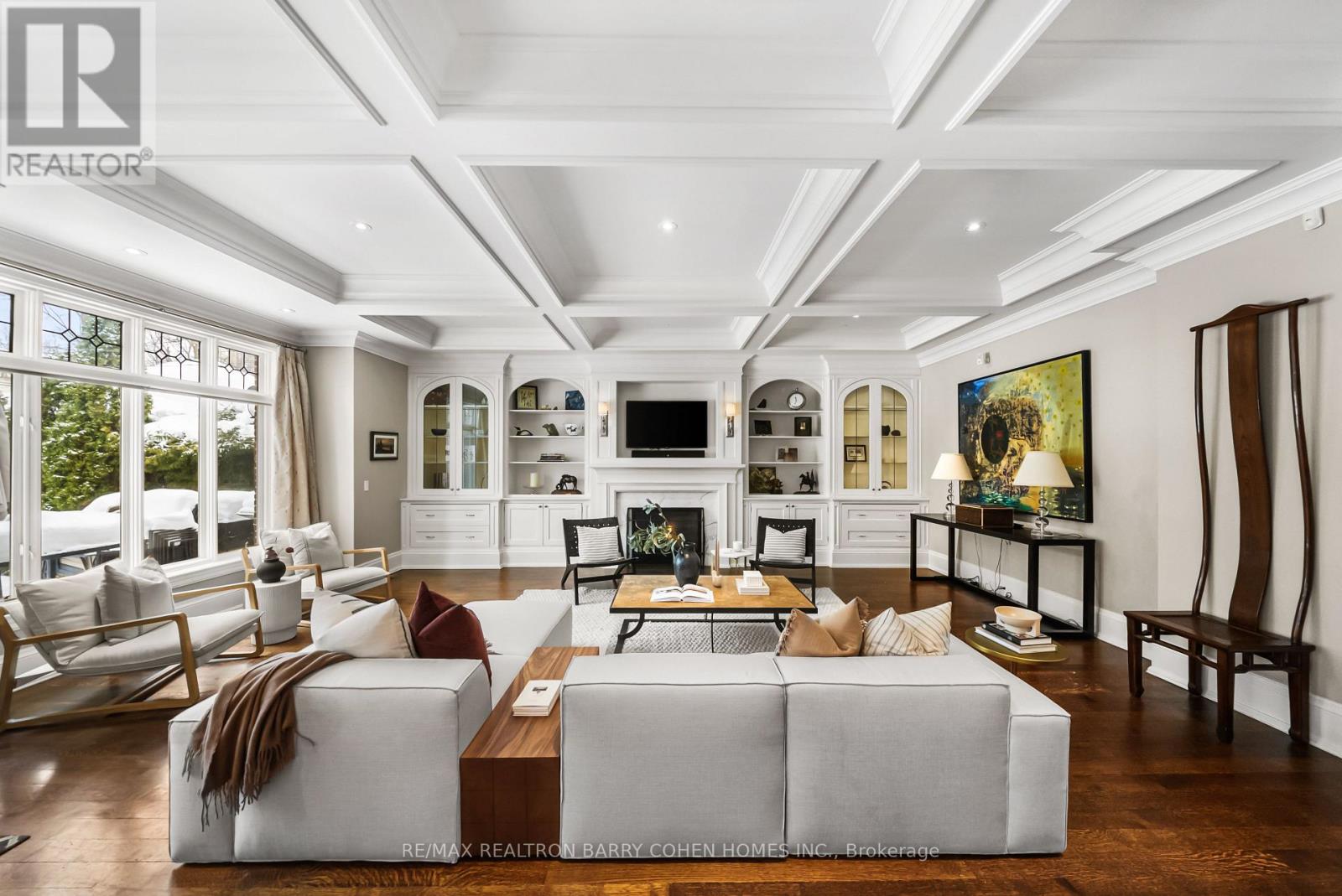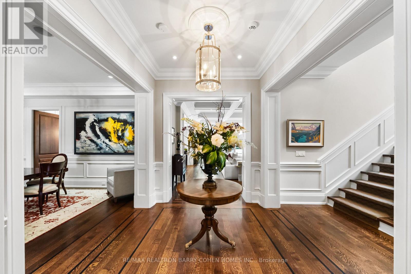 A rare offering in prestigious Lawrence Park, this exceptional residence showcases unparalleled craftsmanship, architectural pedigree, and enduring value, offered for the first time since 2012. Designed by renowned architect Lorne Rose, this distinguished Tudor-inspired home sits on a prime 50 x 150 ft lot. Built with superior materials including Indiana limestone, solid brick, cedar shingle roofing, copper detailing, and leaded glass windows, the home reflects a rare level of quality and permanence. A grand hand-crafted stone portico, mahogany entry, and fully heated driveway, steps, and walkways provide both prestige and year-round convenience, complemented by mature landscaping, irrigation, lighting, and integrated security. Inside, refined detailing defines every space, including 10 ft ceilings on the main level, 9 ft ceilings above and below, heated marble floors, custom millwork, coffered ceilings, rich hardwood flooring, copper plumbing, and sound-insulated construction. Principal rooms are elegantly proportioned for both entertaining and family living. The chef's kitchen features premium appliances and bespoke cabinetry, opening to an oversized family room with coffered ceilings, fireplace, and walk-out to a private stone terrace. The upper level offers five full bedrooms, a rare and highly desirable layout, each with soaring 11+ ft ceilings, custom detailing, and spa-inspired ensuites. The primary retreat features vaulted ceilings, marble finishes, steam shower, and private outdoor access. The fully finished lower level with radiant heated floors includes a large recreation room with walk-out, wet bar, wine cellar, guest or nanny suite, and ample storage. Complete with a rare three-car garage, this home offers timeless design and long-term value. Ideally located steps to Toronto's most prestigious private schools, the Granite Club, Bayview Avenue, Highway 401, and surrounding parks. (id:65552)