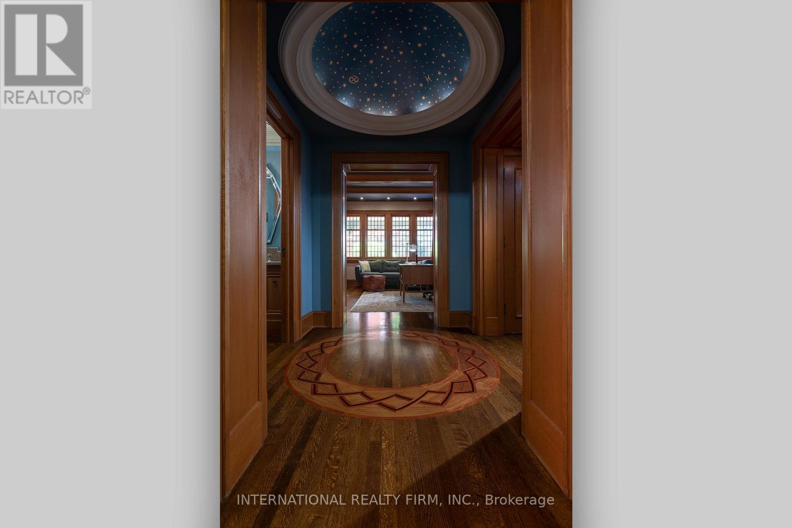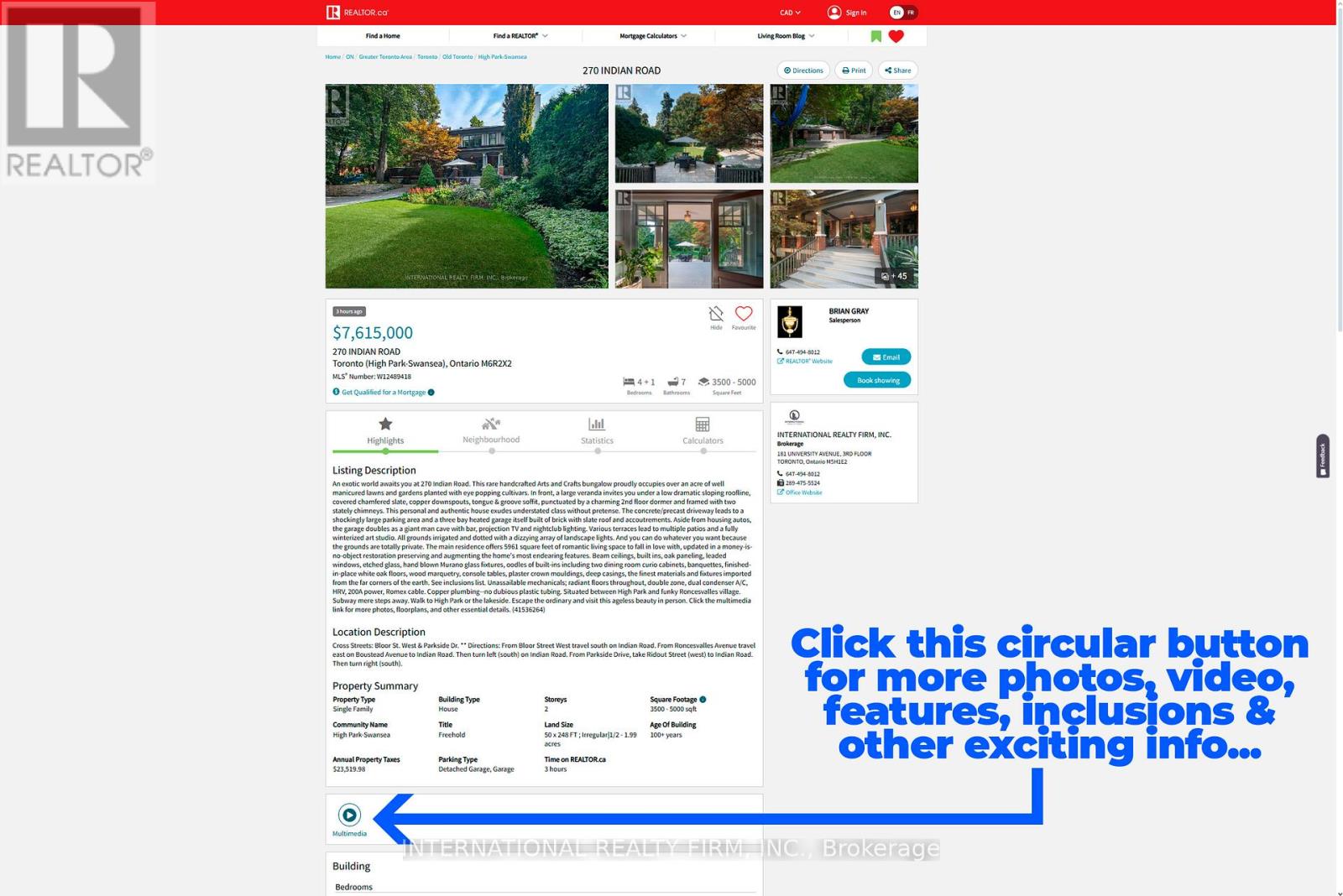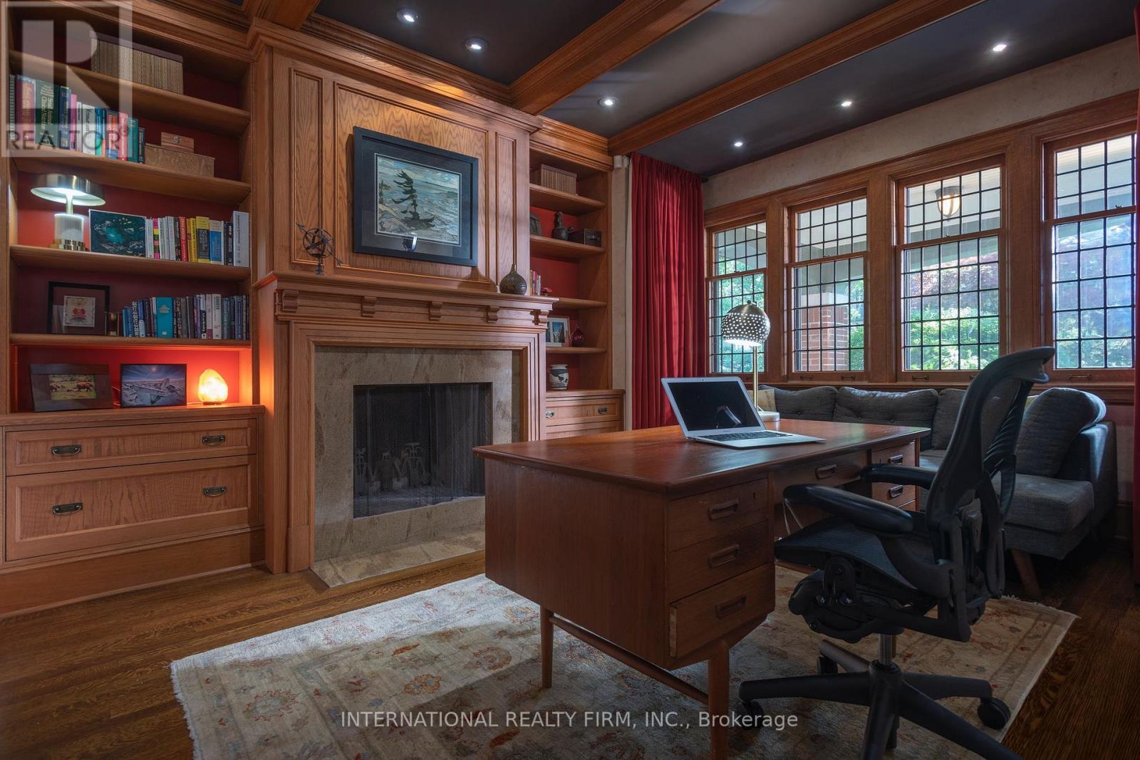 An exotic world awaits you at 270 Indian Road. This rare handcrafted Arts and Crafts bungalow proudly occupies over an acre of well manicured lawns and gardens planted with eye popping cultivars. In front, a large veranda invites you under a low dramatic sloping roofline, covered in chamfered slate, w/ copper downspouts, tongue & groove soffit, punctuated by a charming 2nd floor dormer and framed with two stately chimneys. This personal and authentic house exudes understated class without pretense. The concrete/precast driveway leads to a shockingly large parking area and a three bay heated garage itself built of brick with slate roof and accoutrements. Aside from housing autos, the garage doubles as a giant man cave with bar, projection TV and nightclub lighting. Various terraces lead to multiple patios and a fully winterized art studio. All grounds irrigated and dotted with a dizzying array of landscape lights. And you can do whatever you want because the grounds are totally private. The main residence offers 5961 square feet of romantic living space to fall in love with, updated in a money-is-no-object restoration preserving and augmenting the home's most endearing features. Beam ceilings, built ins, oak paneling, leaded windows, etched glass, hand blown Murano glass fixtures, oodles of built-ins including two dining room curio cabinets, banquettes, finished-in-place white oak floors, wood marquetry, console tables, plaster crown mouldings, deep casings, the finest materials and fixtures imported from the far corners of the earth. See inclusions list. Unassailable mechanicals; radiant floors throughout, double zone, dual condenser A/C, HRV, 200A power, Romex cable. Copper plumbing--no dubious plastic tubing. Situated between High Park and funky Roncesvalles village. Subway mere steps away. Walk to High Park or the lakeside. Escape the ordinary and visit this ageless beauty in person. Click the multimedia/video link for more photos, floorplans, and other details. (id:65552)