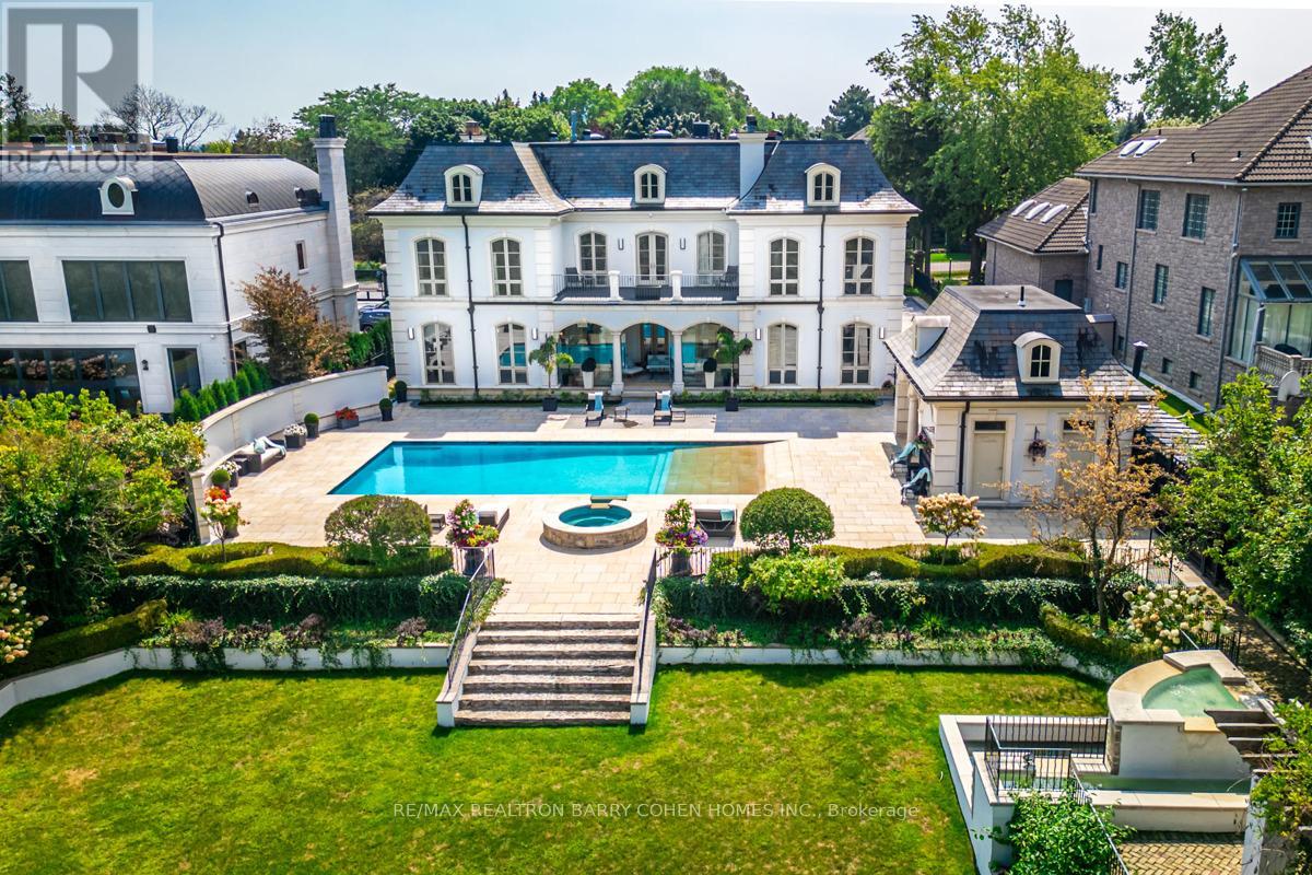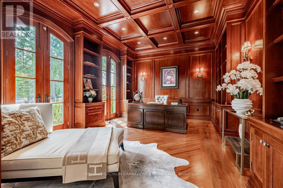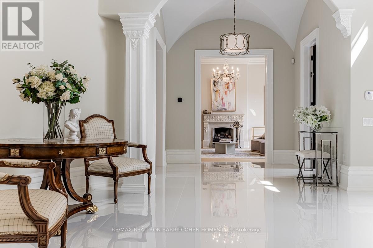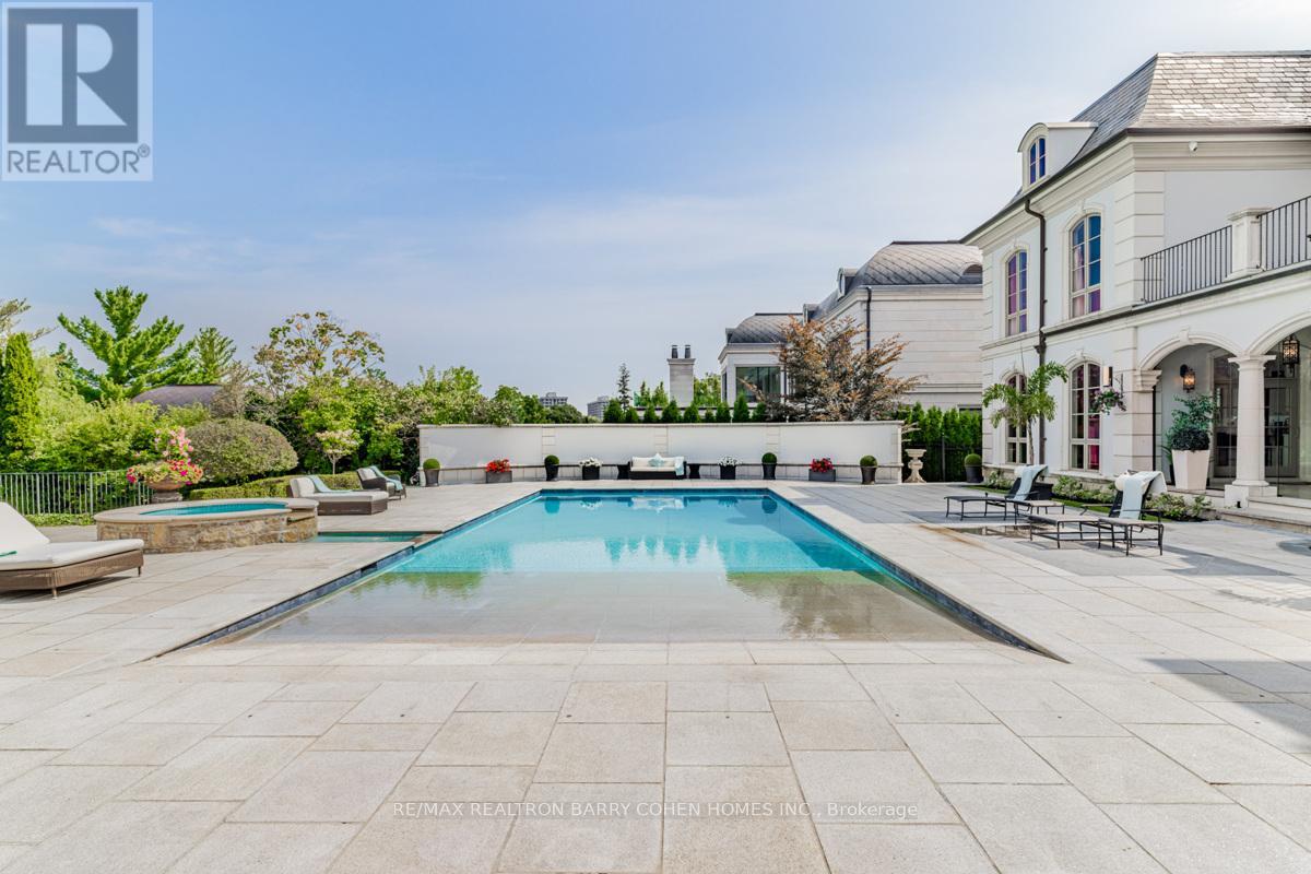 This sprawling, classically designed mansion has a gated front entrance to a circular courtyard with formal gardens with over 10,000 Sq-ft liveable area combined "Lower & upper levels" and lot size of 100 ft X 302 Ft, back to the Prestigious"Thornhill & upland Golf Club" Professionally Interior Designed & Furnished - 6+2 Bedrooms,9 Washrooms- Showcasing A Grand Cathedral Foyer, Magestic Archways And 11 Ft Ceilings with Elevator, Multiple Walk-Outs To Terraces & Enclosed-Veranda Overlook The Backyard Retreat & Swimming Pool Oasis, professional landscaping, heated driveway and surrounding wrought iron fencing with an entrance gate, Kitchen highlights include a hardwood floor, granite counters, a large centre island/breakfast bar with an integrated sink, a pantry, pot lights, a detailed decorative ceiling, custom backsplash, high-end stainless steel appliances, a built-in desk, arched windows, and a sliding door walkout to a covered patio. Off the kitchen is a covered outdoor loggia in Italian with a wood-burning fireplace. The living room features a hardwood floor, crown moulding, a wood-burning fireplace with detailed plaster surround, a ceiling medallion and chandelier, and two arched double garden-door walkouts. In the dining room, highlights include a hardwood floor, crown moulding, a chandelier and two arched windows. The office features rich wood walls, a coffered wood ceiling, wall sconces, floor-to-ceiling built-in shelves, and two double-door walkouts to the front. The backyard has a covered patio, an inground pool, a three-piece bathroom, a cabana, an inground hot tub, a large lanai with a wood-burning fireplace, an outdoor kitchen with stainless steel appliances and a dining area, fountains, gardens, a potting shed, and lawn space. The lower level wine room, a 700-bottle wine cellar, features cabinetry, counter space, exposed brick walls and ceiling, a tile floor, a games room and a soundproof movie theatre.3-car garage and 12 parking spaces. (id:65552)