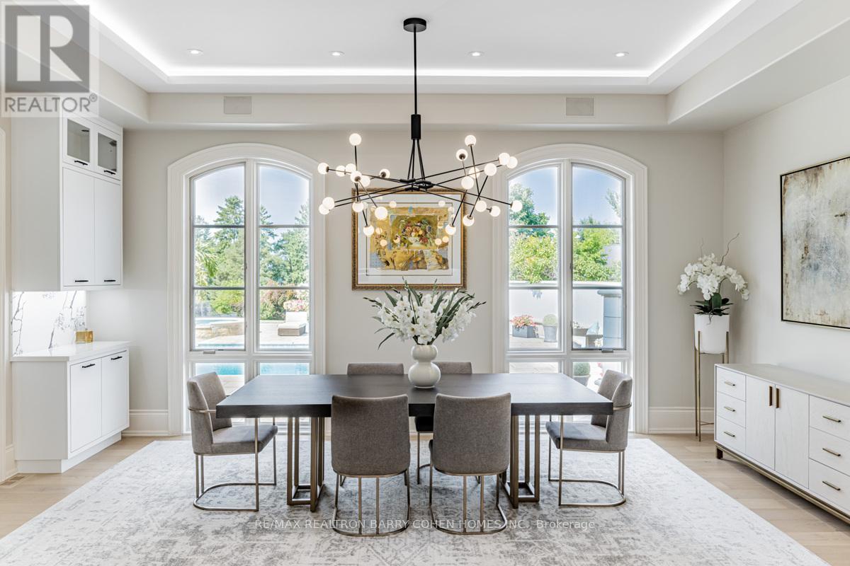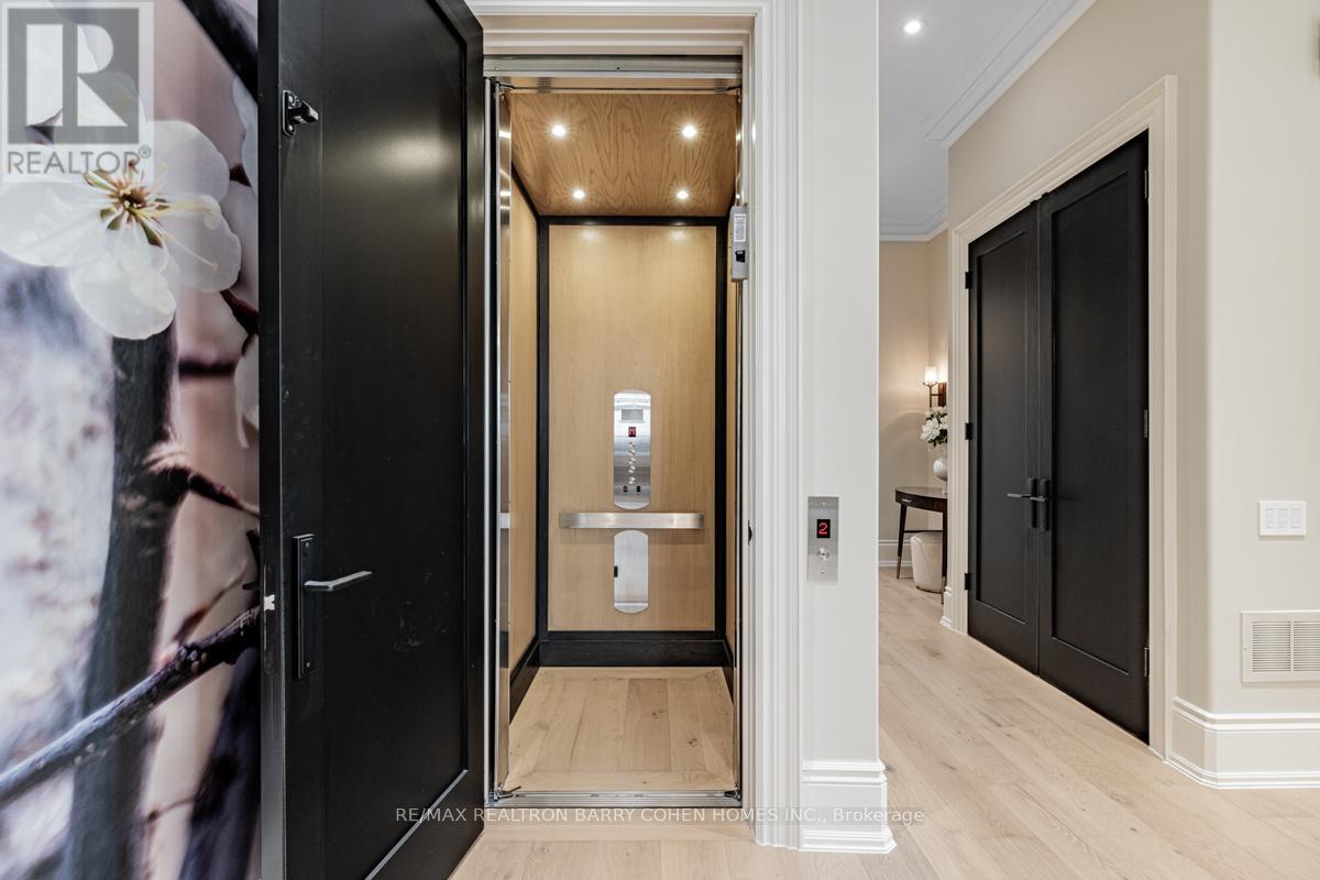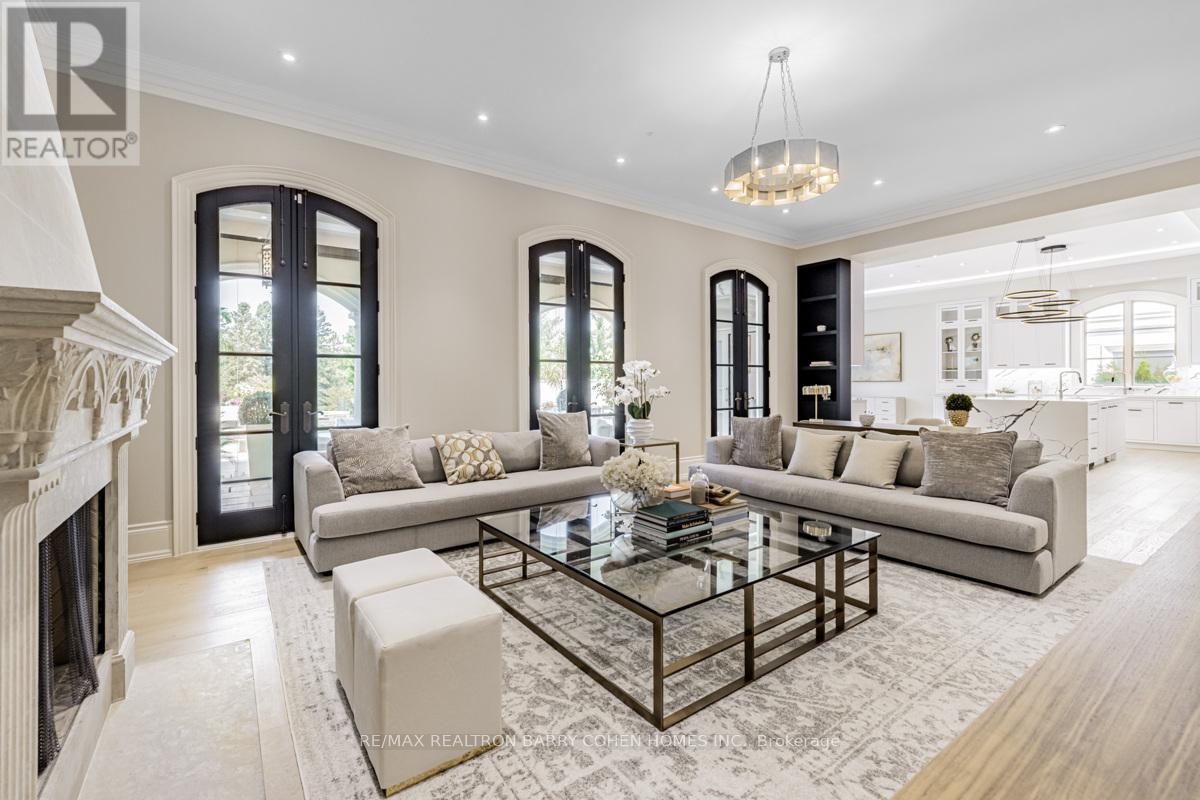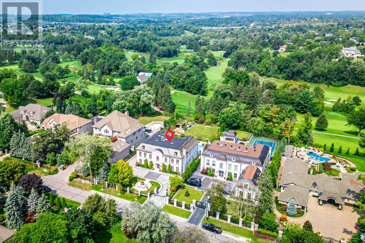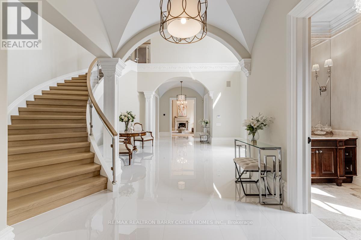 This sprawling, classically designed mansion has a gated front entrance to a circular courtyard with formal gardens with over 10,000 Sq-ft liveable area combined "Lower & upper levels" and lot size of 100 ft X 302 Ft, back to the Prestigious"Thornhill & upland Golf Club" Professionally Interior Designed & Furnished - 6+2 Bedrooms,9 Washrooms- Showcasing A Grand Cathedral Foyer, Magestic Archways And 11 Ft Ceilings with Elevator, Multiple Walk-Outs To Terraces & Enclosed-Veranda Overlook The Backyard Retreat & Swimming Pool Oasis, professional landscaping, heated driveway and surrounding wrought iron fencing with an entrance gate, Kitchen highlights include a hardwood floor, granite counters, a large centre island/breakfast bar with an integrated sink, a pantry, pot lights, a detailed decorative ceiling, custom backsplash, high-end stainless steel appliances, a built-in desk, arched windows, and a sliding door walkout to a covered patio. Off the kitchen is a covered outdoor loggia in Italian with a wood-burning fireplace. The living room features a hardwood floor, crown moulding, a wood-burning fireplace with detailed plaster surround, a ceiling medallion and chandelier, and two arched double garden-door walkouts. In the dining room, highlights include a hardwood floor, crown moulding, a chandelier and two arched windows. The office features rich wood walls, a coffered wood ceiling, wall sconces, floor-to-ceiling built-in shelves, and two double-door walkouts to the front. The backyard has a covered patio, an inground pool, a three-piece bathroom, a cabana, an inground hot tub, a large lanai with a wood-burning fireplace, an outdoor kitchen with stainless steel appliances and a dining area, fountains, gardens, a potting shed, and lawn space. The lower level wine room, a 700-bottle wine cellar, features cabinetry, counter space, exposed brick walls and ceiling, a tile floor, a games room and a soundproof movie theatre.3-car garage and 12 parking spaces. (id:65552)