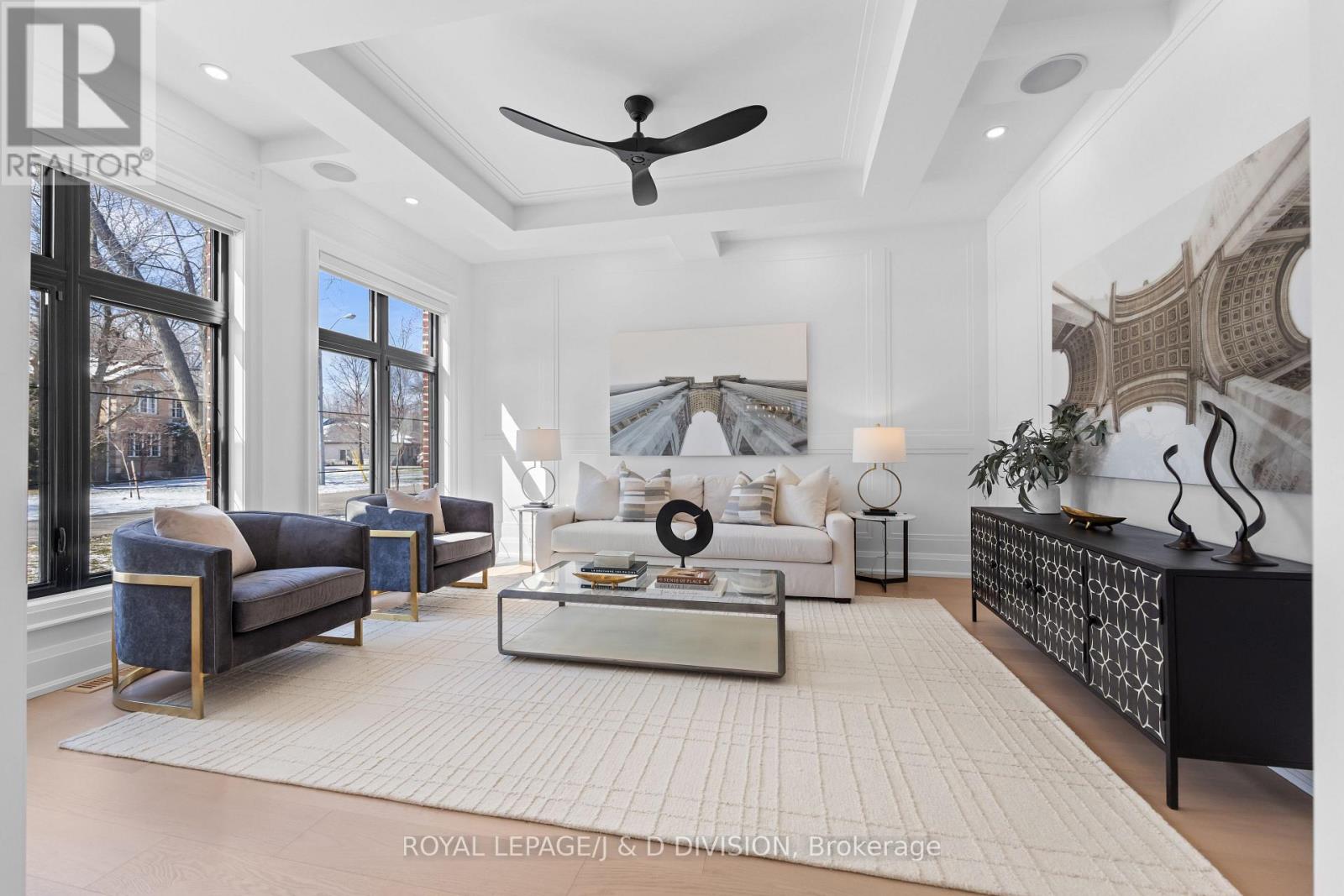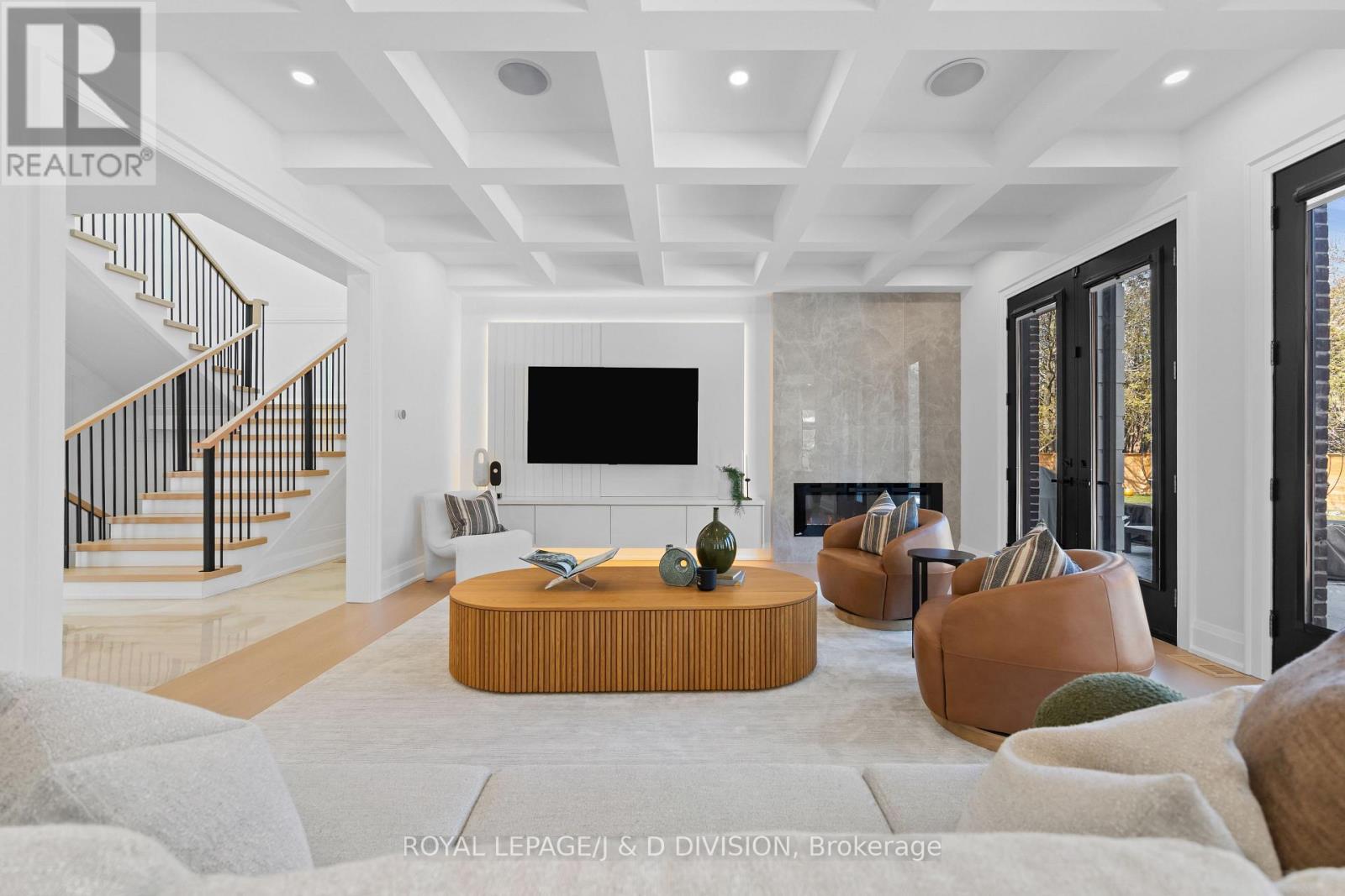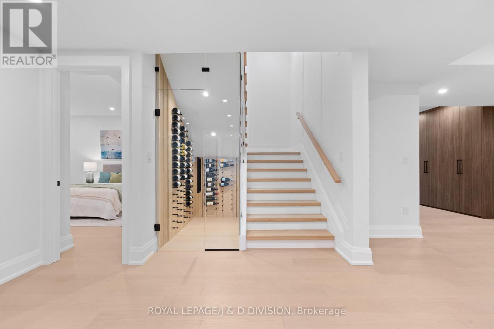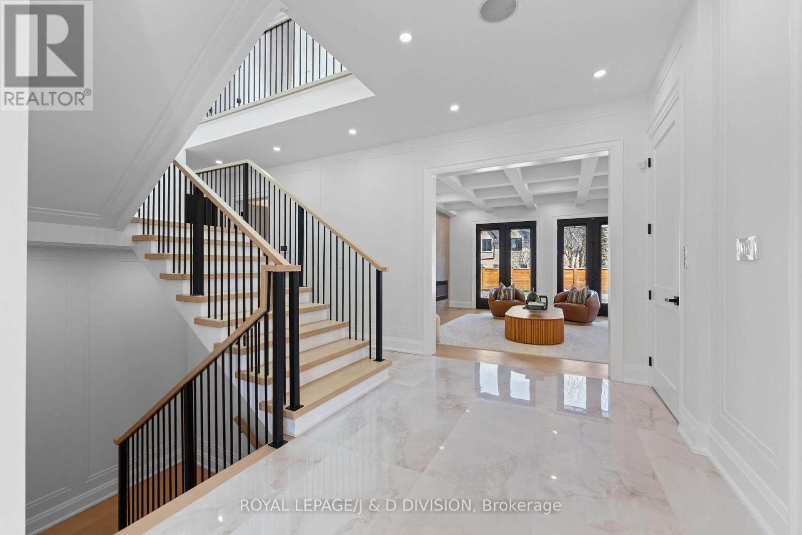 A striking residence, architecturally designed by the renowned Peter Higgins. This custom-built residence sits in one of the most exclusive enclaves in the Scarborough Bluffs just steps from the lake. It offers nearly 7,000 square feet of living space on an exceptionally private lot. Step inside where luxury is boundless. A classic centre hall plan introduces elegant living and dining rooms. The living room features exquisite millwork and a bright south exposure, while the formal dining room comfortably seats 8-10 guests and is anchored by a gas fireplace. The family room is both dramatic and inviting, with a coffered ceiling, French doors to the gardens, and a striking stone fireplace wall. The chef's kitchen blends elegance with functionality in an open-concept layout overlooking the family and breakfast areas. A large centre island with seating for four is complemented by floor-to-ceiling cabinetry, premium integrated appliances, and a seamless full-height backsplash. The breakfast area, set within a garden-view window bay, seats up to eight and is supported by a butler's pantry and walk-in pantry. A discreet mudroom with access to the double garage and garden, along with two powder rooms, completes the main floor. A sweeping staircase ascends gracefully to the second floor, adorned with intricate custom millwork and two skylights that bathe the landing in natural light, creating a luminous and unforgettable architectural statement. A luxurious primary suite features a fireplace, sitting area, and Juliette balconies. The spa-inspired ensuite offers heated floors, steam shower, and refined marble and quartz finishes, alongside an expansive walk-in closet. Four additional bedrooms, three with ensuites, and a laundry room complete the second level. The expansive walk-up level features a wine room, fitness studio, nanny suite, spa bath, recreation room with wet bar, heated floors, and separate garden access. All floors are accessible by private elevator. (id:65552)