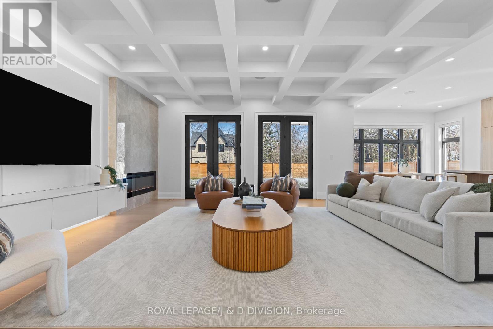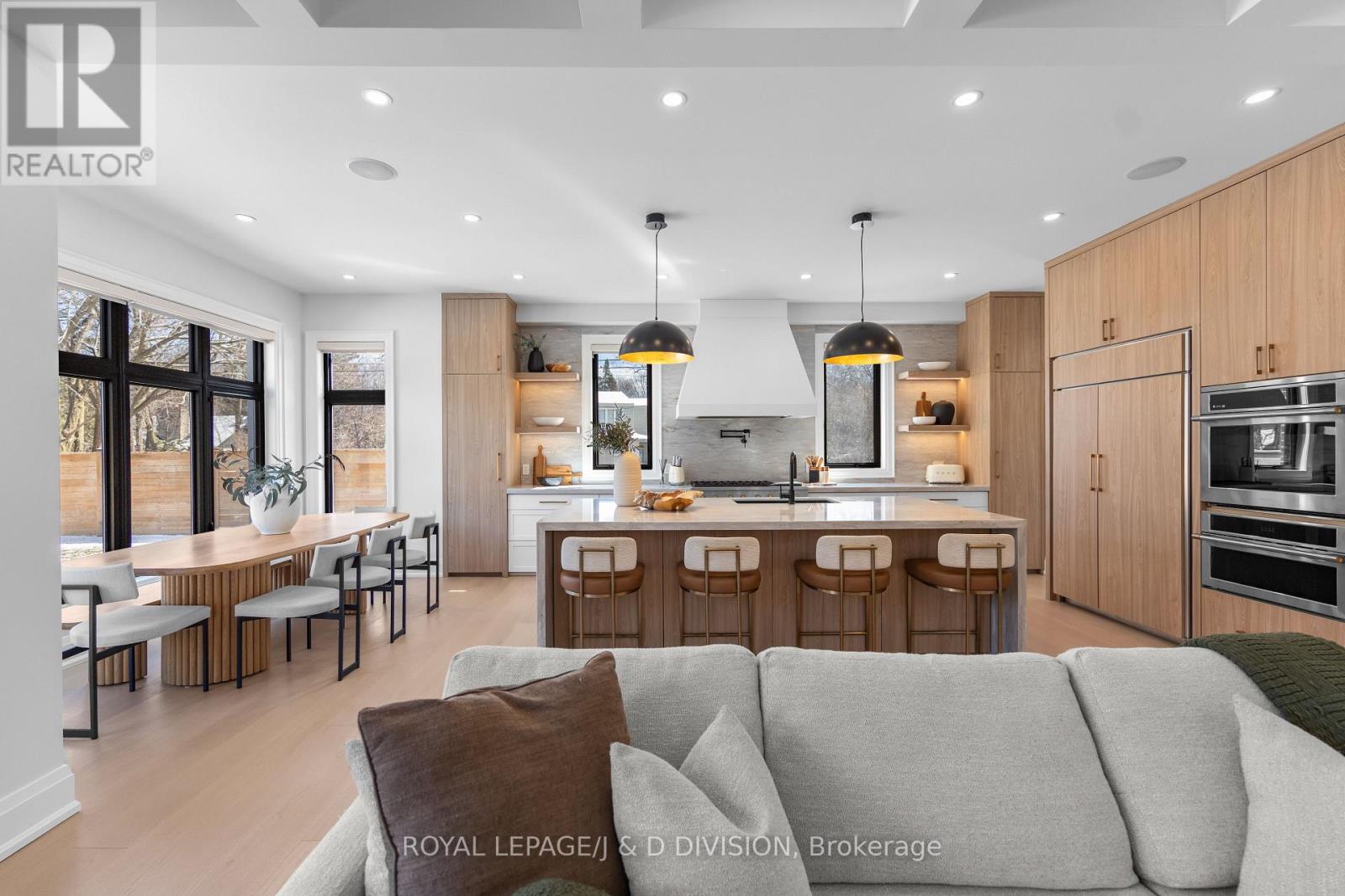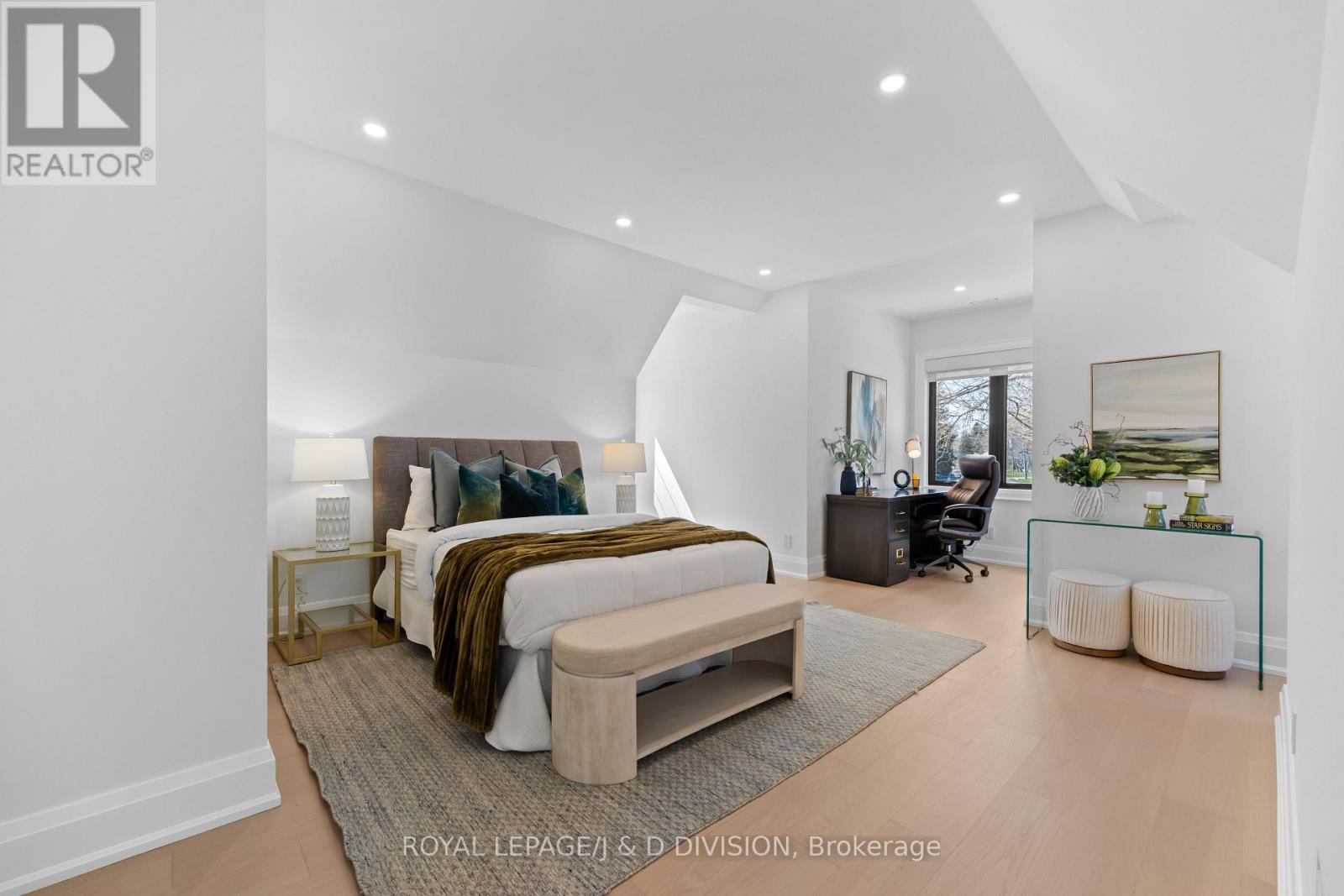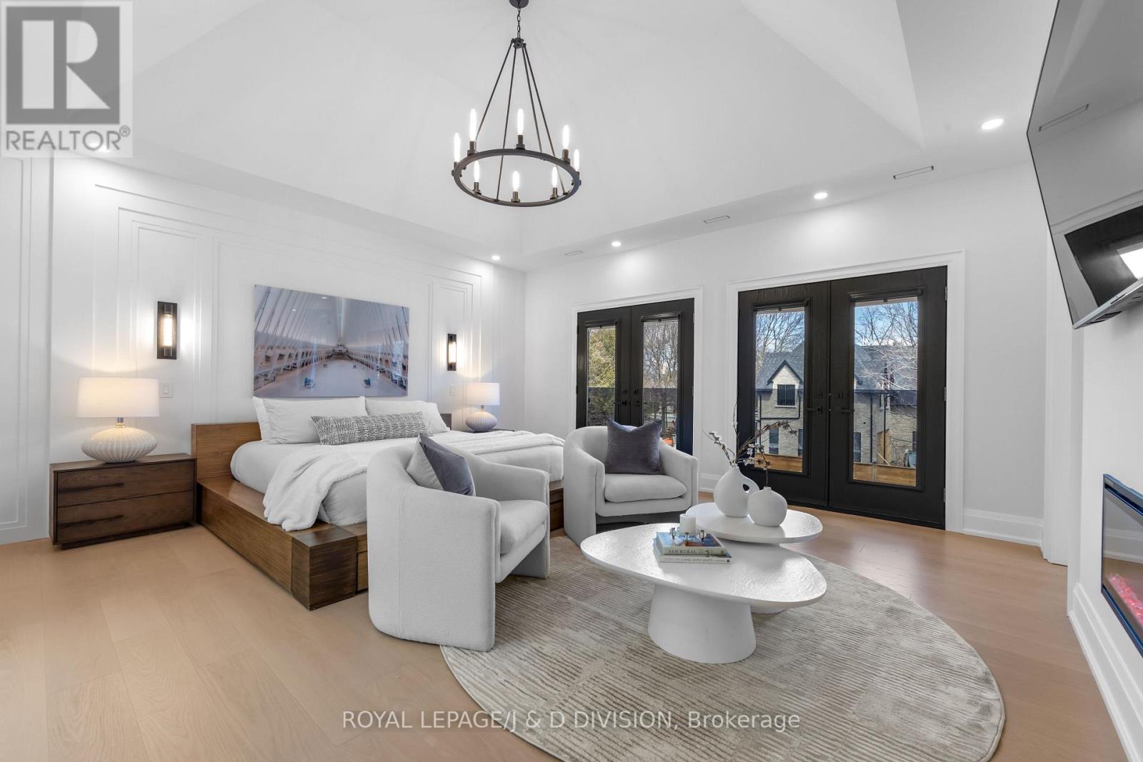 A striking residence, architecturally designed by the renowned Peter Higgins. This custom-built residence sits in one of the most exclusive enclaves in the Scarborough Bluffs just steps from the lake. It offers nearly 7,000 square feet of living space on an exceptionally private lot. Step inside where luxury is boundless. A classic centre hall plan introduces elegant living and dining rooms. The living room features exquisite millwork and a bright south exposure, while the formal dining room comfortably seats 8-10 guests and is anchored by a gas fireplace. The family room is both dramatic and inviting, with a coffered ceiling, French doors to the gardens, and a striking stone fireplace wall. The chef's kitchen blends elegance with functionality in an open-concept layout overlooking the family and breakfast areas. A large centre island with seating for four is complemented by floor-to-ceiling cabinetry, premium integrated appliances, and a seamless full-height backsplash. The breakfast area, set within a garden-view window bay, seats up to eight and is supported by a butler's pantry and walk-in pantry. A discreet mudroom with access to the double garage and garden, along with two powder rooms, completes the main floor. A sweeping staircase ascends gracefully to the second floor, adorned with intricate custom millwork and two skylights that bathe the landing in natural light, creating a luminous and unforgettable architectural statement. A luxurious primary suite features a fireplace, sitting area, and Juliette balconies. The spa-inspired ensuite offers heated floors, steam shower, and refined marble and quartz finishes, alongside an expansive walk-in closet. Four additional bedrooms, three with ensuites, and a laundry room complete the second level. The expansive walk-up level features a wine room, fitness studio, nanny suite, spa bath, recreation room with wet bar, heated floors, and separate garden access. All floors are accessible by private elevator. (id:65552)