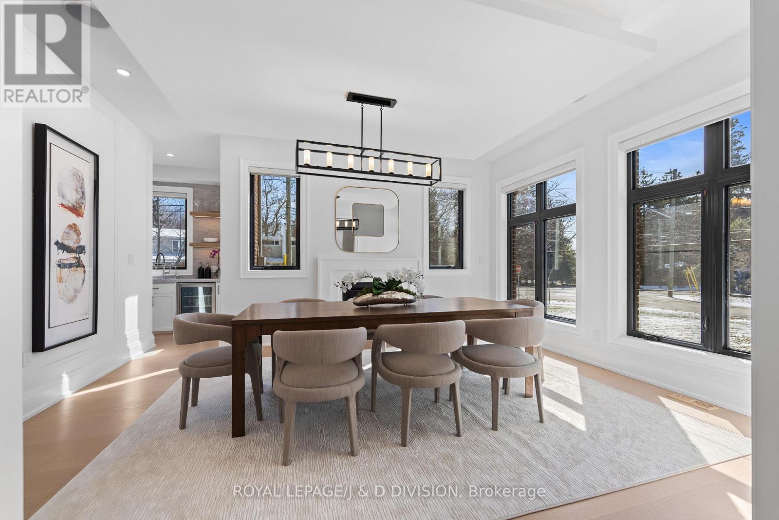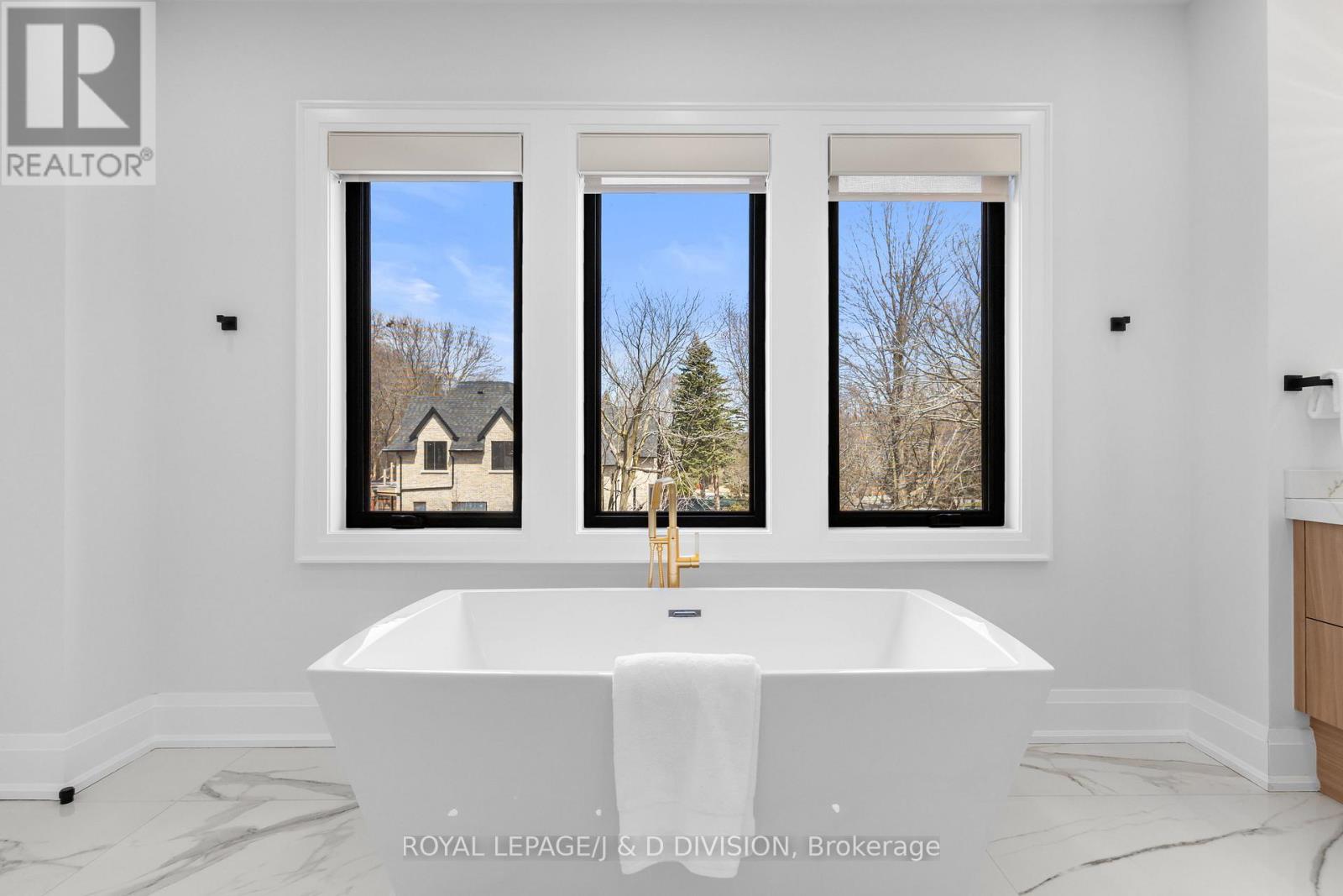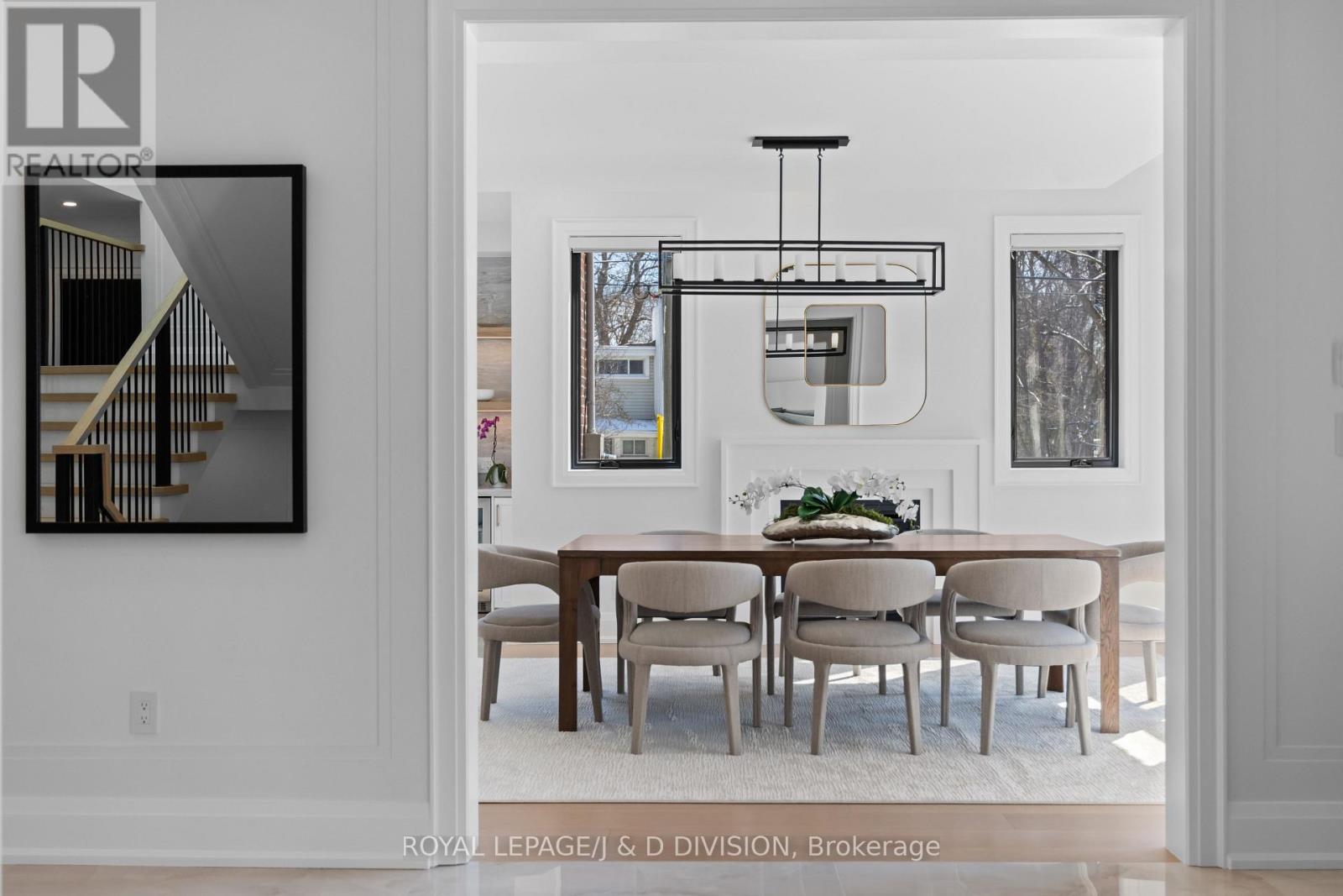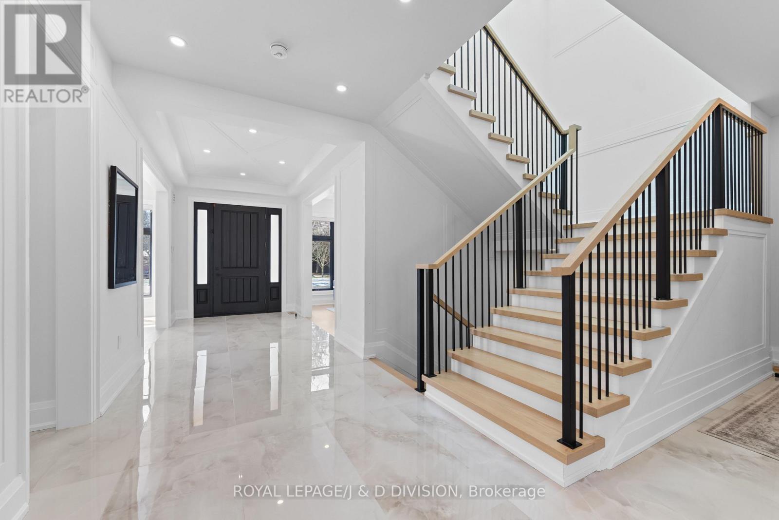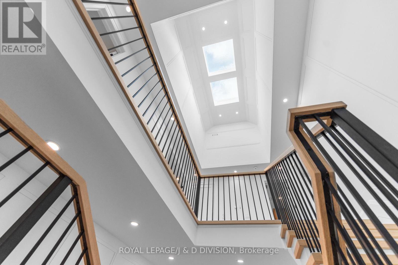 A striking residence, architecturally designed by the renowned Peter Higgins. This custom-built residence sits in one of the most exclusive enclaves in the Scarborough Bluffs just steps from the lake. It offers nearly 7,000 square feet of living space on an exceptionally private lot. Step inside where luxury is boundless. A classic centre hall plan introduces elegant living and dining rooms. The living room features exquisite millwork and a bright south exposure, while the formal dining room comfortably seats 8-10 guests and is anchored by a gas fireplace. The family room is both dramatic and inviting, with a coffered ceiling, French doors to the gardens, and a striking stone fireplace wall. The chef's kitchen blends elegance with functionality in an open-concept layout overlooking the family and breakfast areas. A large centre island with seating for four is complemented by floor-to-ceiling cabinetry, premium integrated appliances, and a seamless full-height backsplash. The breakfast area, set within a garden-view window bay, seats up to eight and is supported by a butler's pantry and walk-in pantry. A discreet mudroom with access to the double garage and garden, along with two powder rooms, completes the main floor. A sweeping staircase ascends gracefully to the second floor, adorned with intricate custom millwork and two skylights that bathe the landing in natural light, creating a luminous and unforgettable architectural statement. A luxurious primary suite features a fireplace, sitting area, and Juliette balconies. The spa-inspired ensuite offers heated floors, steam shower, and refined marble and quartz finishes, alongside an expansive walk-in closet. Four additional bedrooms, three with ensuites, and a laundry room complete the second level. The expansive walk-up level features a wine room, fitness studio, nanny suite, spa bath, recreation room with wet bar, heated floors, and separate garden access. All floors are accessible by private elevator. (id:65552)