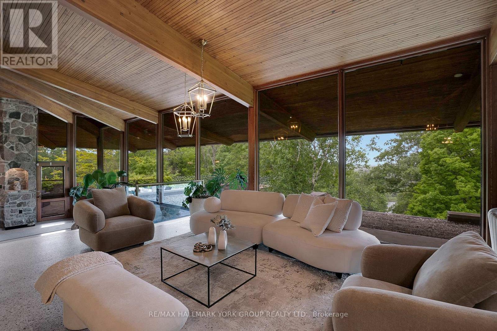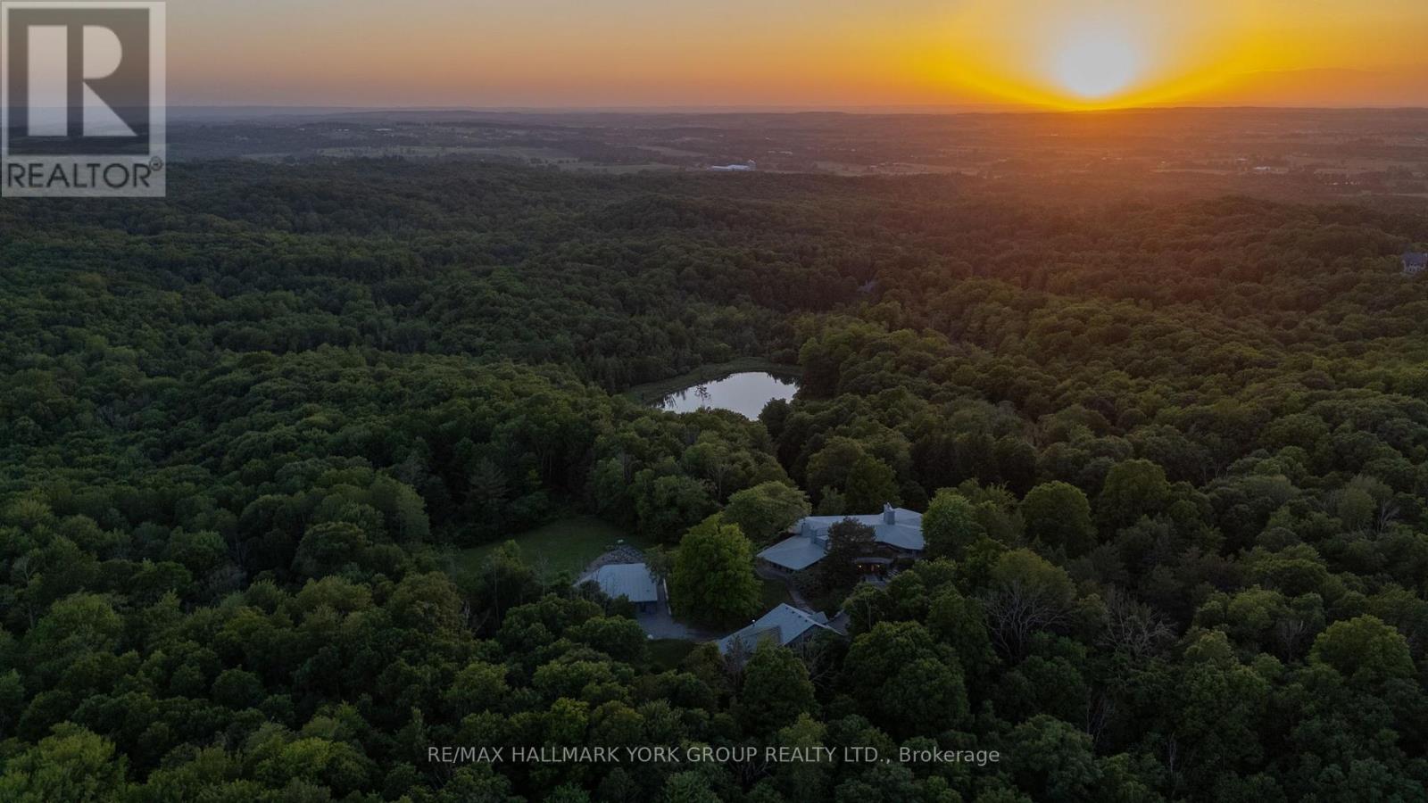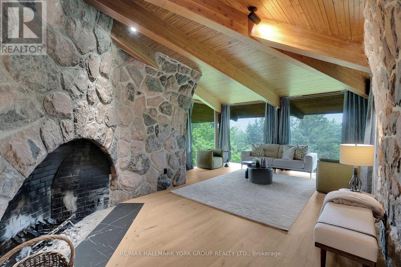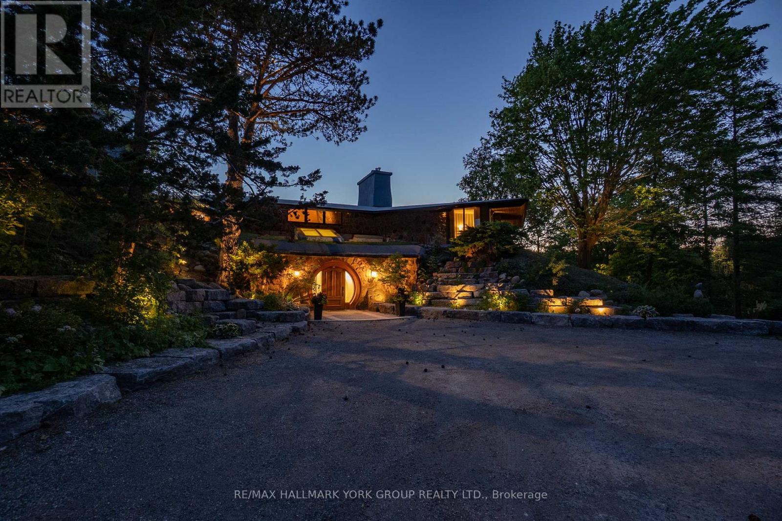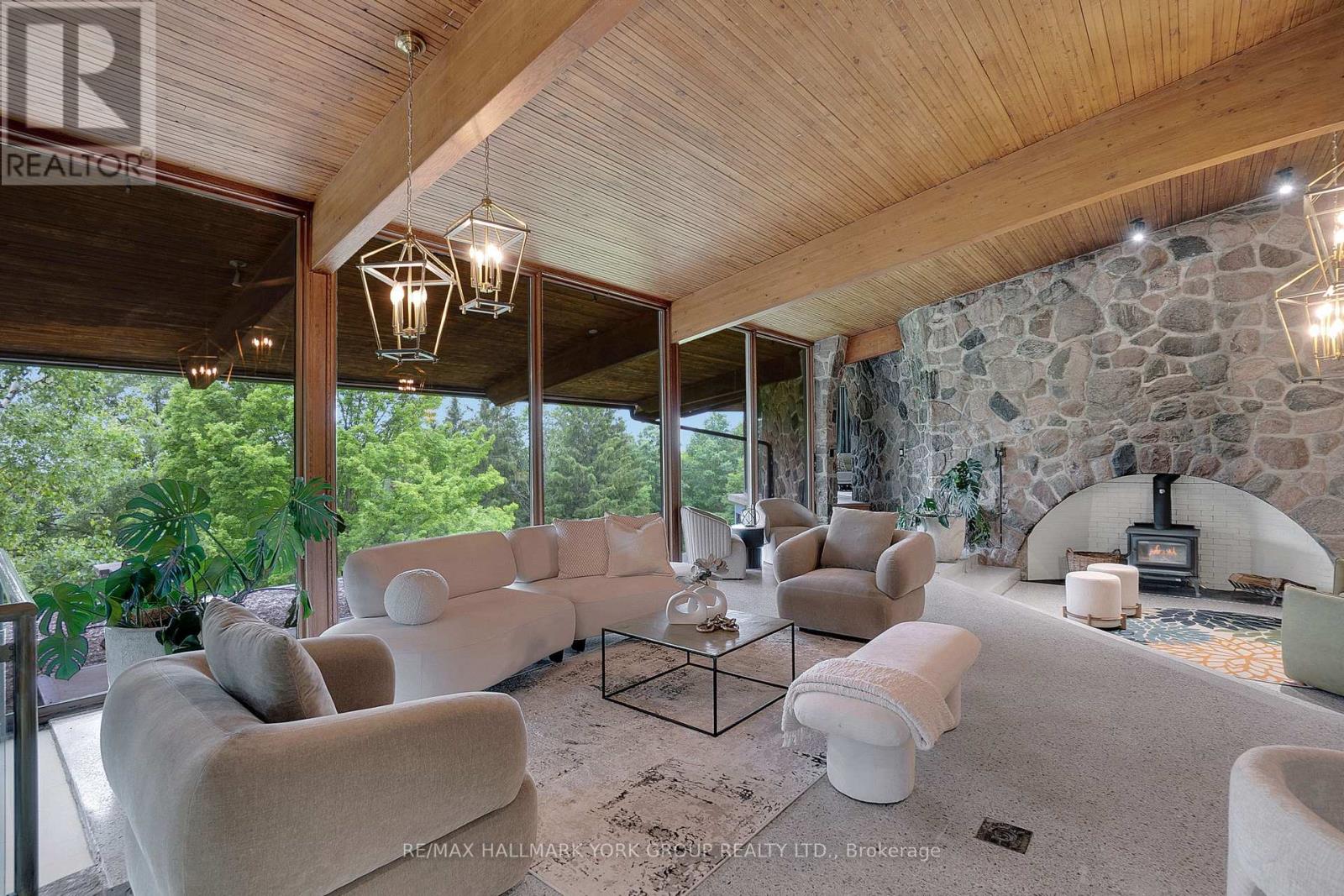 Welcome to an extraordinary estate tucked away behind welcoming stone pillars and a winding forested driveway! This is a work of art designed by the legendary Grant Whatmough and Gardiner Cowan, with distinctive Frank Lloyd Wright style of Architecture. This iconic Mid-Century Modern residence is gracefully integrated into 32 acres of majestic land, where nature and architecture exist in perfect harmony. From the moment you approach the stunning entry door, you're drawn into a world of timeless design and serene beauty. This home is lovingly maintained with extensive renovations, while preserving the character and soul of this home, Including Floor-to-ceiling windows bring the outdoors in, Stone fireplaces indoor and out, original stone walls and impressive wood beams throughout. Spanning approximately 5,000 sq ft, the main residence features 6 bedrooms, 7 bathrooms, an office, a meditation room, and a separate nanny suite. Multiple terraces and decks surround the home, offering breathtaking views of the land, and a tranquil lake creating the feel of a private luxury retreat. This property features a rare second home- fully renovated and approximately 3,500 sq ft-offering 3 bedrooms, 4 bathrooms, and a massive loft space! This second home is ideal for an extended family! There is an additional Yoga studio with an outdoor shower! a Detached garage/ workshop, a charming cedar Cabin with Sauna and Cold plunge, a Covered cabana for entertaining or relaxing on the property. This is a once-in-a-lifetime opportunity to own an architecturally significant estate in the prestigious King Township. With unmatched privacy, lush surroundings, and two beautifully appointed homes, this property is truly a timeless work of art. Don't Miss it! (id:65552)