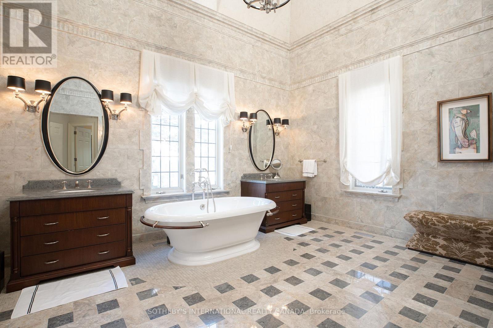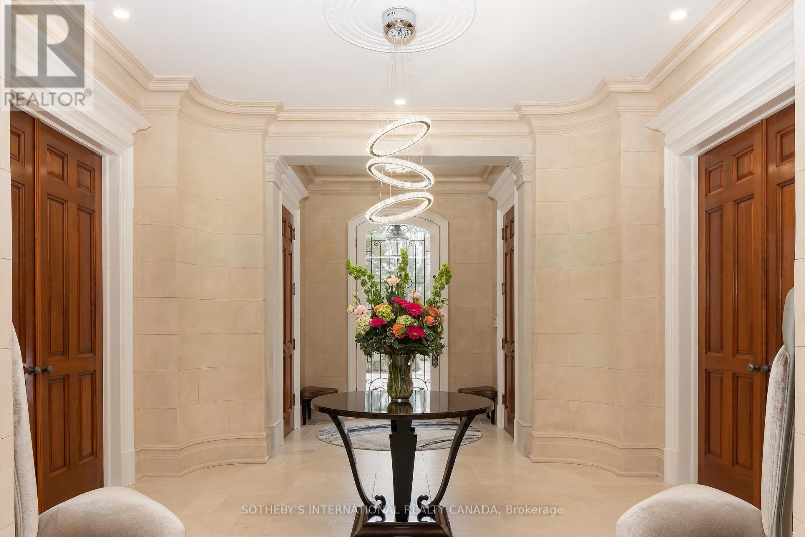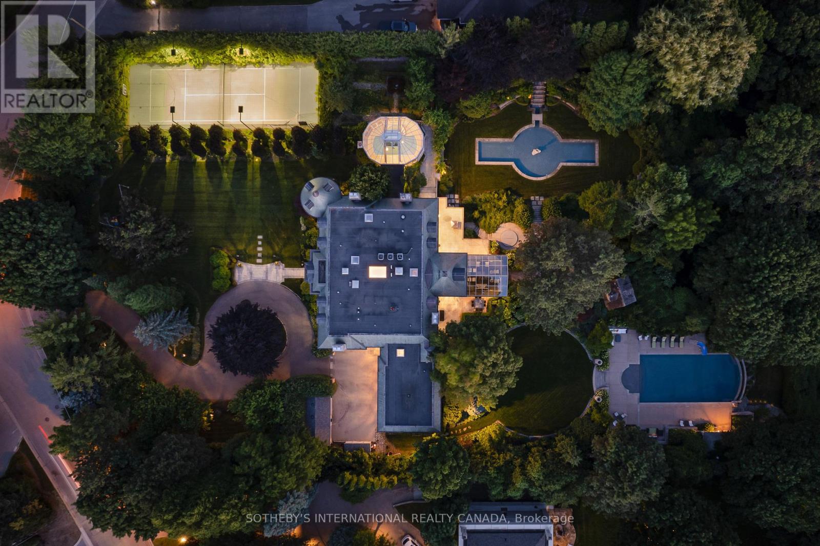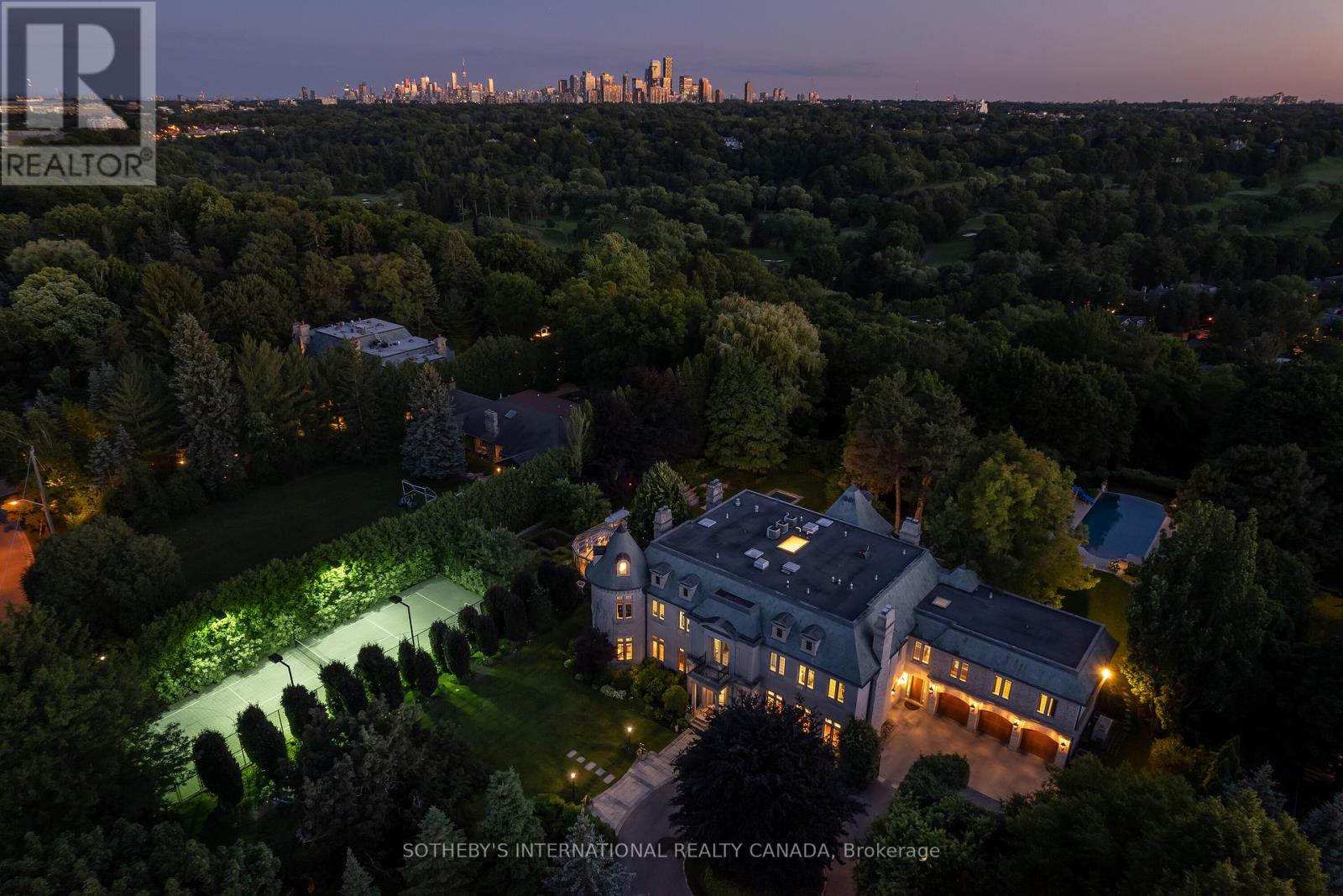 Arguably one of Torontos most iconic estates, this French-style chateau is an extraordinary expression of European grandeur on a 3.12-acre double lot in the prestigious enclave of Bayview Ridge. Designed by renowned architect Gordon Ridgely, the residence commands unobstructed western views over the Rosedale Golf Club. Beyond the stately stone gates and circular drive, manicured gardens by Ron Holbrook frame a breathtaking setting featuring a negative-edge infinity pool, a reflecting pond with a stepped waterfall, tennis court, kitchen gardens, flagstone terraces, and a stone cabana. The striking facade spans nearly 150 feet, clad in Indiana buff limestone and rubble stone with Vermont unfaded green slate shingles and lead-coated copper details. An ivy-clad turret anchors the asymmetrical design, lending the home its signature silhouette. Inside, over 15,000 square feet of living space showcases Brazilian cherry wood floors with African wenge inlay, acid-etched antique Crema Marfil marble, coffered ceilings, Indiana limestone fireplaces, and solid North American cherry doors. Six principal bedrooms and two additional suites are complemented by ten baths and warm, richly detailed interiors. The main floor features an impressive library and office with wood-burning fireplace, a grand dining room with artisan-painted walls and ceilings, a conservatory beside the spacious family room, and a sunlit morning room perfect for coffee. Three staircases, including a hidden passage, lead to the lower level with a Bordeaux-inspired wine cellar, cigar room, gym, nanny suite with two bedrooms, a full kitchen, and a large recreation space. Upstairs, the primary suite offers a six-piece spa bathroom, dual dressing rooms, gas fireplace, and sweeping views. Each bedroom enjoys an ensuite bath and sitting area, blending luxury with practicality. This remarkable estate is a once-in-a-generation offering at once grand, intimate, and built to endure. (id:65552)