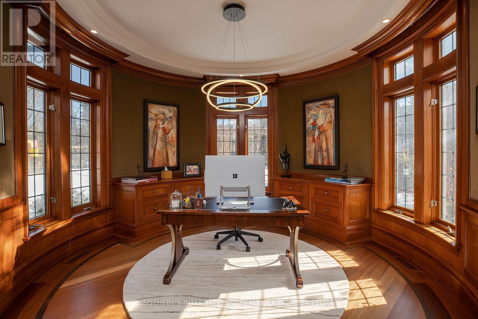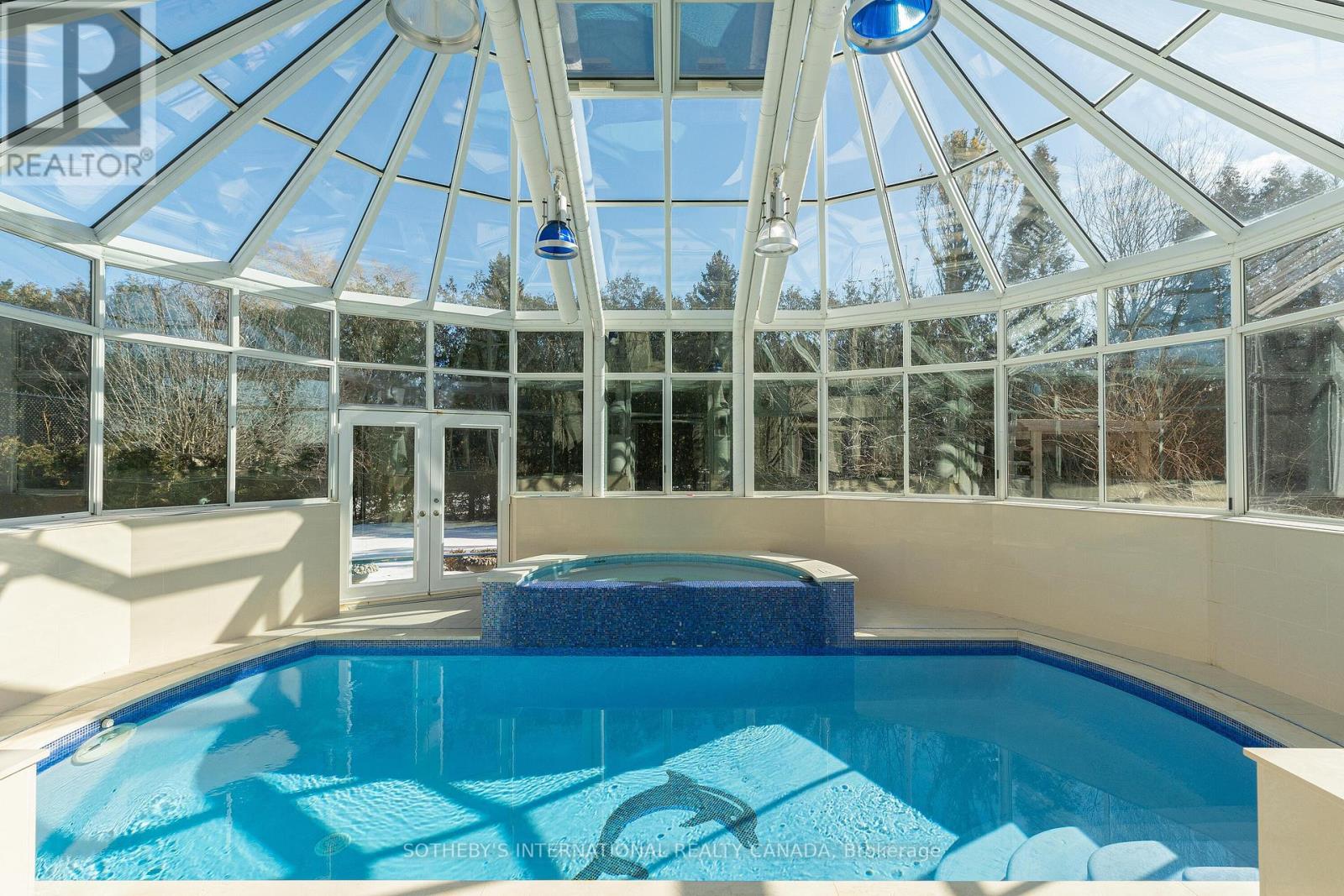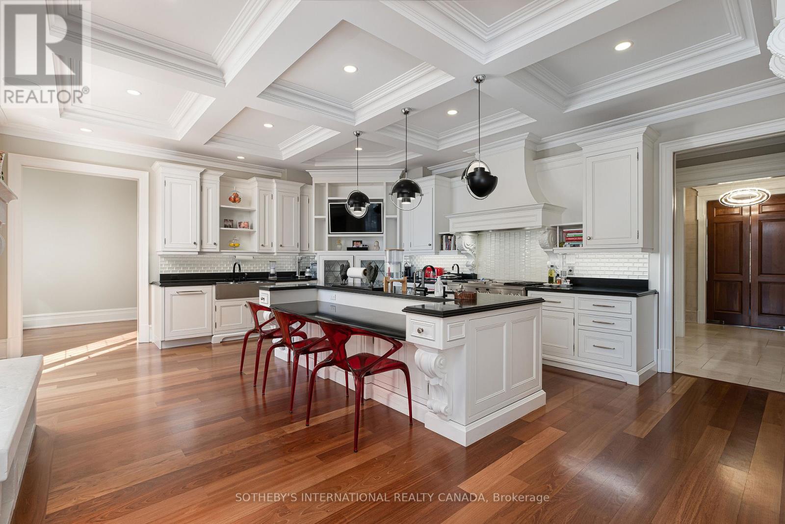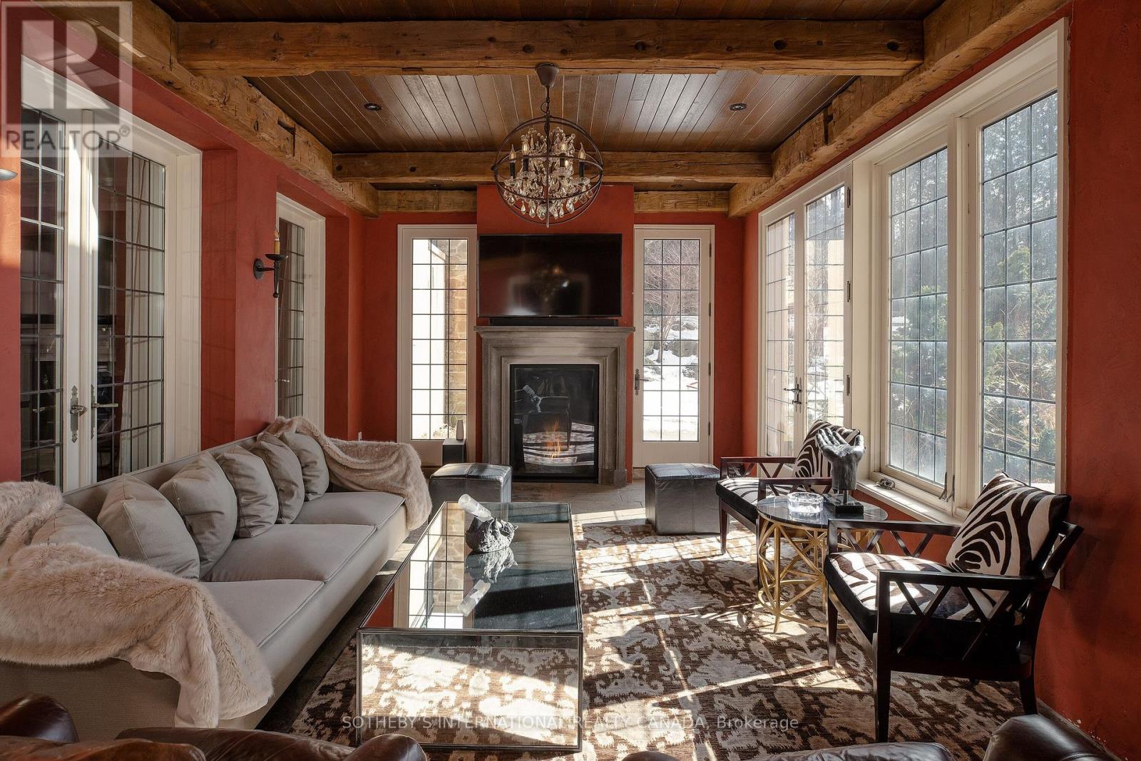 Arguably one of Torontos most iconic estates, this French-style chateau is an extraordinary expression of European grandeur on a 3.12-acre double lot in the prestigious enclave of Bayview Ridge. Designed by renowned architect Gordon Ridgely, the residence commands unobstructed western views over the Rosedale Golf Club. Beyond the stately stone gates and circular drive, manicured gardens by Ron Holbrook frame a breathtaking setting featuring a negative-edge infinity pool, a reflecting pond with a stepped waterfall, tennis court, kitchen gardens, flagstone terraces, and a stone cabana. The striking facade spans nearly 150 feet, clad in Indiana buff limestone and rubble stone with Vermont unfaded green slate shingles and lead-coated copper details. An ivy-clad turret anchors the asymmetrical design, lending the home its signature silhouette. Inside, over 15,000 square feet of living space showcases Brazilian cherry wood floors with African wenge inlay, acid-etched antique Crema Marfil marble, coffered ceilings, Indiana limestone fireplaces, and solid North American cherry doors. Six principal bedrooms and two additional suites are complemented by ten baths and warm, richly detailed interiors. The main floor features an impressive library and office with wood-burning fireplace, a grand dining room with artisan-painted walls and ceilings, a conservatory beside the spacious family room, and a sunlit morning room perfect for coffee. Three staircases, including a hidden passage, lead to the lower level with a Bordeaux-inspired wine cellar, cigar room, gym, nanny suite with two bedrooms, a full kitchen, and a large recreation space. Upstairs, the primary suite offers a six-piece spa bathroom, dual dressing rooms, gas fireplace, and sweeping views. Each bedroom enjoys an ensuite bath and sitting area, blending luxury with practicality. This remarkable estate is a once-in-a-generation offering at once grand, intimate, and built to endure. (id:65552)