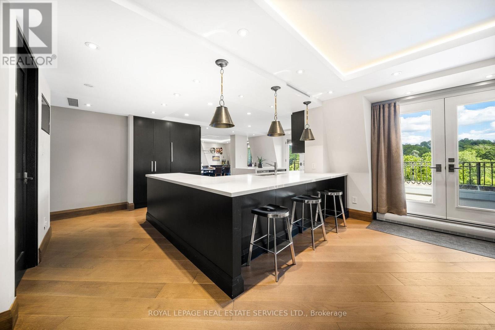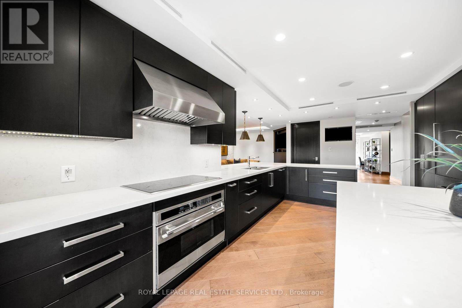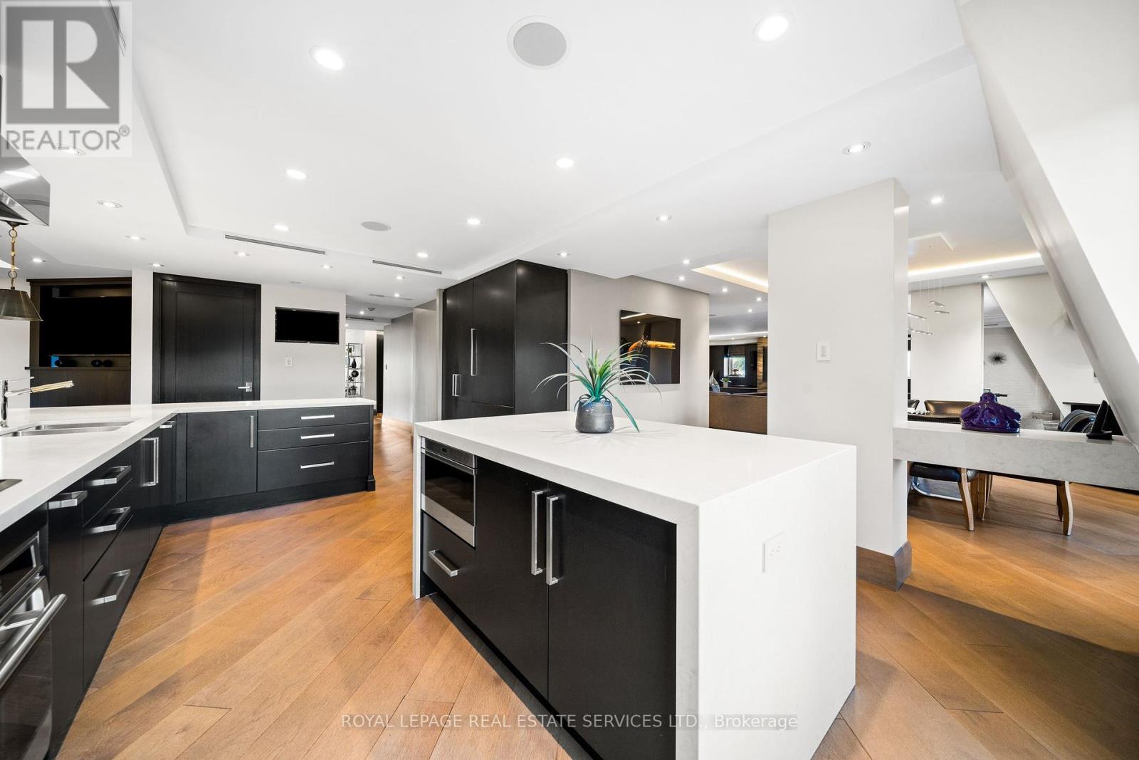 This rare full-floor penthouse at The Riverstone offers 2,959 sq. ft. of living space with sweeping views of both the city skyline and Humber River. Direct elevator access opens to a bright, functional layout featuring engineered hardwood throughout and custom-built cabinetry. The kitchen includes premium appliances such as a Wolf cooktop and oven, Falmec hood, and custom millwork. The living room features a marble-faced fireplace with quartz hearth, perfect for relaxed evenings or entertaining. The primary suite offers heated stone floors in the ensuite, custom closets, and tranquil views. White oak shaker doors, panels, and baseboards add a consistent, high-end finish throughout. Includes two parking spaces and a locker. Don't miss this opportunity to own a one of a kind penthouse in a highly sought-after building and neighbourhood. (id:65552)