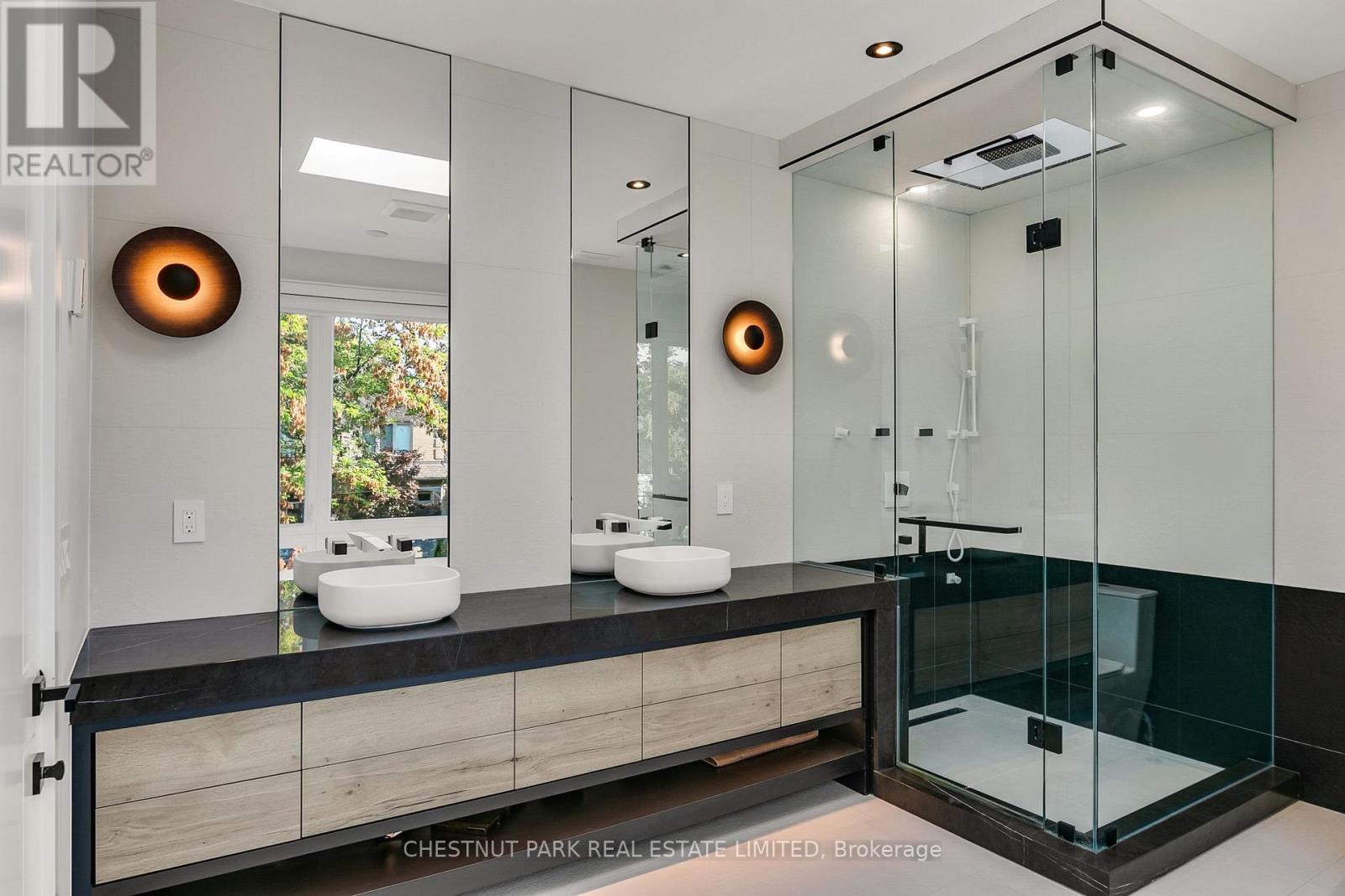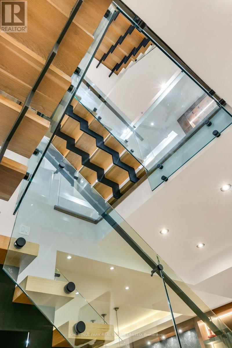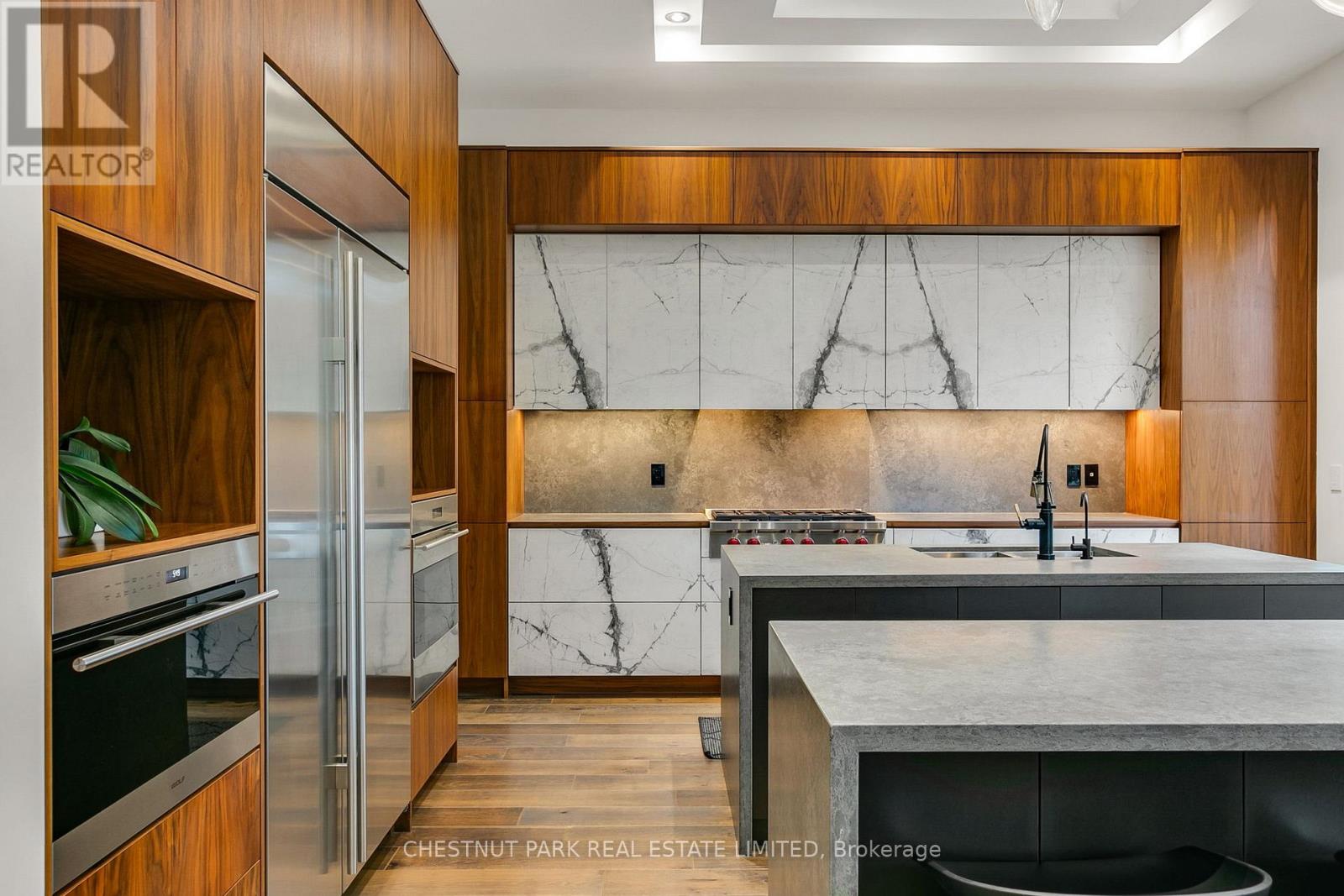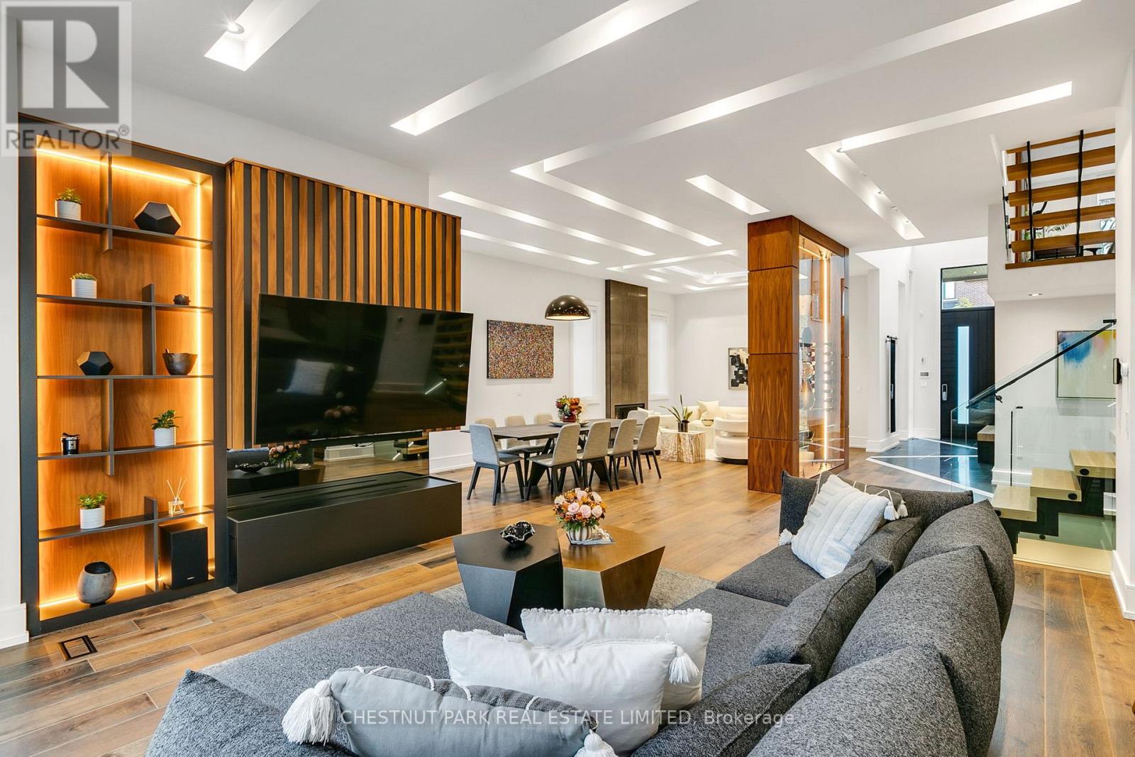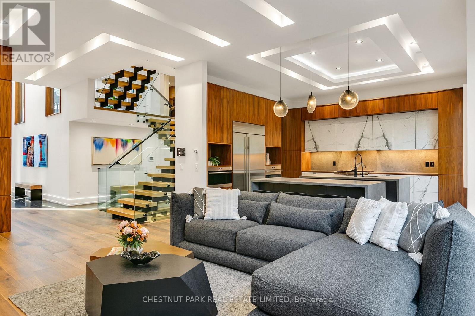 This custom-built residence is the ultimate statement in modern luxury, offering 5,382 sq ft of total living space, with every detail designed for elegance & convenience. A rare, accessible elevation where you enter directly into the home & just a few steps down to the yard. Soaring 26.5 ft foyer set the tone for a home flooded with natural light & architectural drama. The main level boasts 11 ft ceilings, flowing seamlessly into a striking kitchen. Outfitted with dual islands, a pantry, custom solid wood cabinetry with full-size porcelain slab doors, quartz countertops, matching backsplash & top-tier Wolf & Sub-Zero appliances, it is a showstopper. An architectural staircase with laser-cut, no-joint metal stringers, 3" solid white oak risers & glass railings is a central design feature. The home includes an elevator, a lit-up custom glass wine & art display & 2 laundry rooms. The primary suite is a private retreat, complete with two walk-in closets & a spa-inspired ensuite featuring a soaker tub & a skylit shower. A stunning mezzanine office (or den) overlooks the main floor, creating a dramatic, yet functional workspace. All Bedrooms have their own ensuite bathrooms. The lower level is well thought out, with over 9 ft ceilings, radiant heated floors, a bar, custom built-ins, a rec room with walkout to the yard, 2nd laundry room, gym, a powder room & a guest bedroom with an ensuite bath. The heated tile floors in the foyer & primary ensuite, professional landscaping, 11 skylights, 3 fireplaces, smart home system with features allowing you to monitor & manage the home even if you are halfway across the world, state-of-the-art alarm system, heated driveway, generator & a 2-car garage with EV charger round out the homes extensive list of luxuries.Set on a rare 50 ft lot, with professional landscaping (& room for a pool) this 4+1 bed, 7 bath home has architectural details at every turn, showcasing the perfect blend of modern innovation, sleek design & everyday comfort (id:65552)