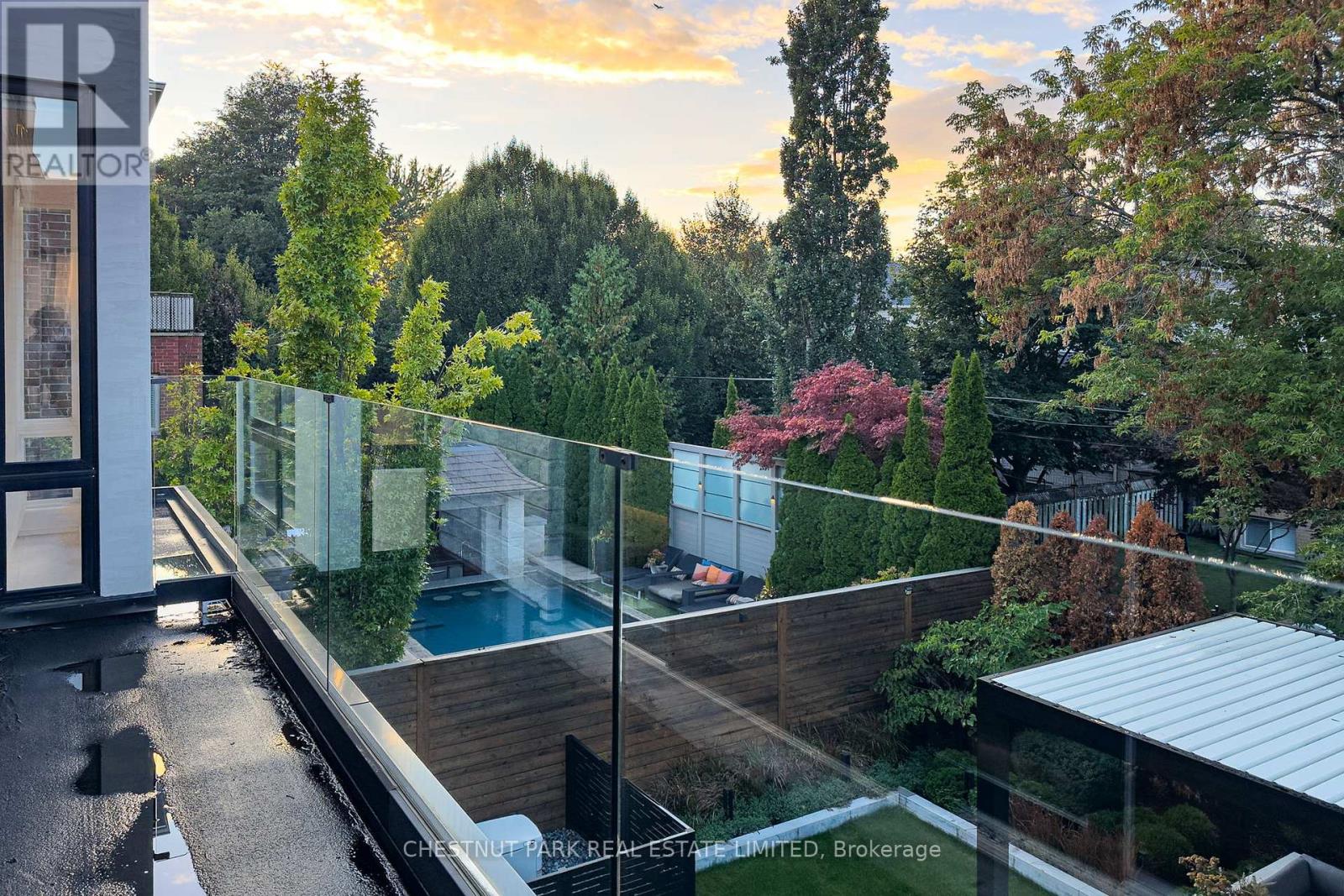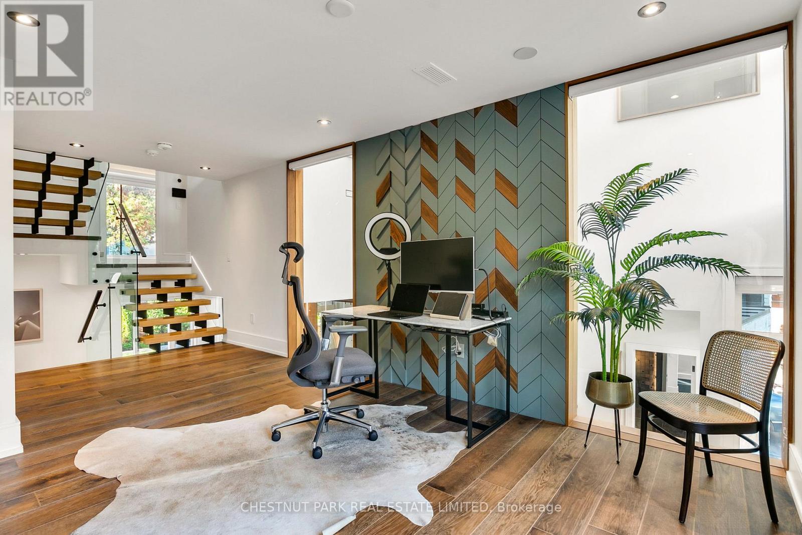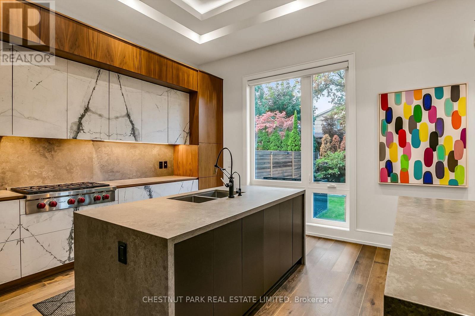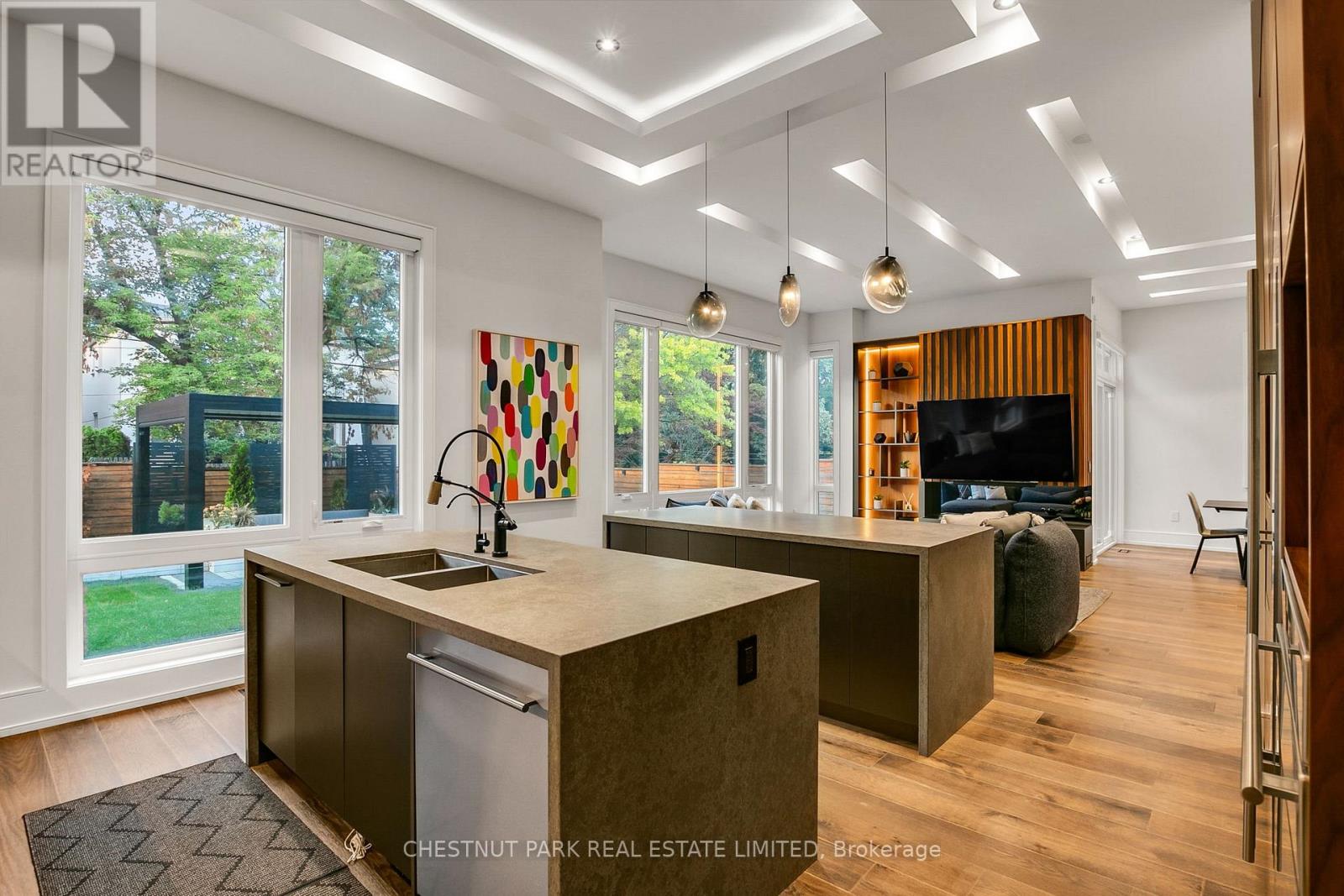 This custom-built residence is the ultimate statement in modern luxury, offering 5,382 sq ft of total living space, with every detail designed for elegance & convenience. A rare, accessible elevation where you enter directly into the home & just a few steps down to the yard. Soaring 26.5 ft foyer set the tone for a home flooded with natural light & architectural drama. The main level boasts 11 ft ceilings, flowing seamlessly into a striking kitchen. Outfitted with dual islands, a pantry, custom solid wood cabinetry with full-size porcelain slab doors, quartz countertops, matching backsplash & top-tier Wolf & Sub-Zero appliances, it is a showstopper. An architectural staircase with laser-cut, no-joint metal stringers, 3" solid white oak risers & glass railings is a central design feature. The home includes an elevator, a lit-up custom glass wine & art display & 2 laundry rooms. The primary suite is a private retreat, complete with two walk-in closets & a spa-inspired ensuite featuring a soaker tub & a skylit shower. A stunning mezzanine office (or den) overlooks the main floor, creating a dramatic, yet functional workspace. All Bedrooms have their own ensuite bathrooms. The lower level is well thought out, with over 9 ft ceilings, radiant heated floors, a bar, custom built-ins, a rec room with walkout to the yard, 2nd laundry room, gym, a powder room & a guest bedroom with an ensuite bath. The heated tile floors in the foyer & primary ensuite, professional landscaping, 11 skylights, 3 fireplaces, smart home system with features allowing you to monitor & manage the home even if you are halfway across the world, state-of-the-art alarm system, heated driveway, generator & a 2-car garage with EV charger round out the homes extensive list of luxuries.Set on a rare 50 ft lot, with professional landscaping (& room for a pool) this 4+1 bed, 7 bath home has architectural details at every turn, showcasing the perfect blend of modern innovation, sleek design & everyday comfort (id:65552)