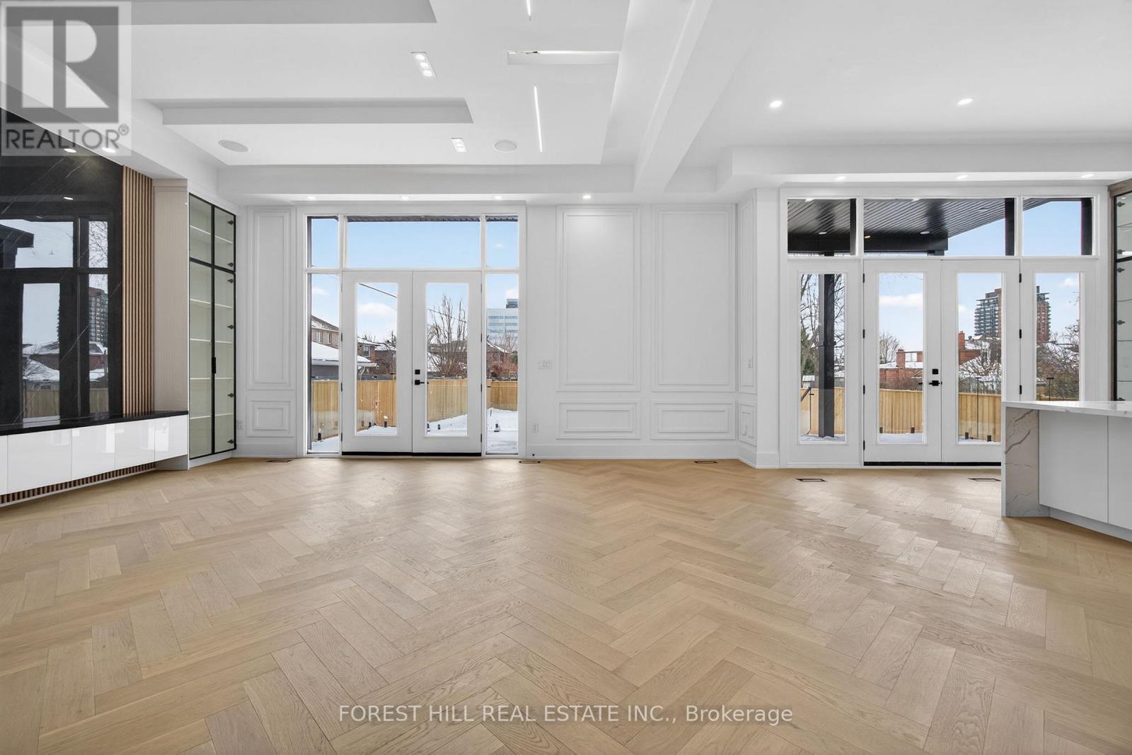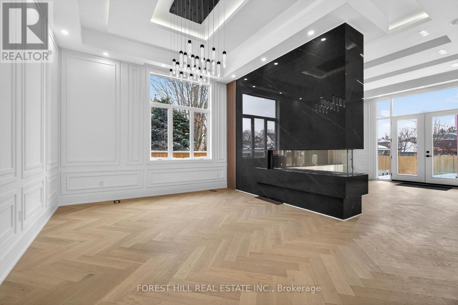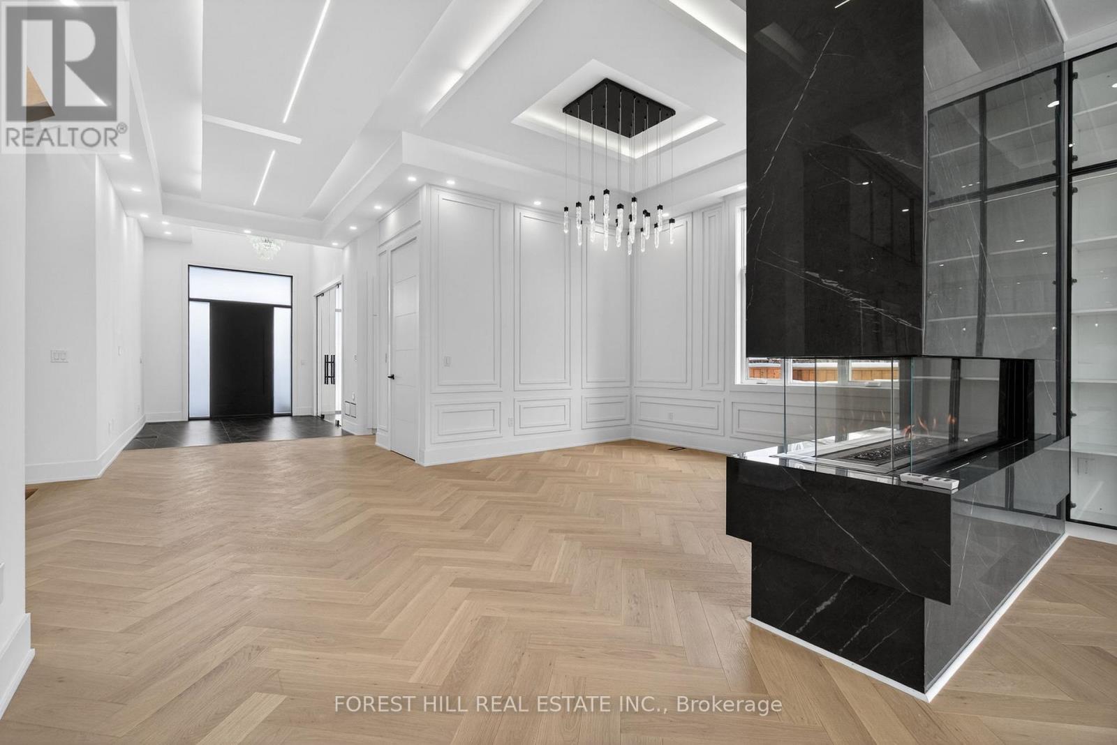 Absolutely stunning modern custom-built home in a prime Toronto location, showcasing exceptional craftsmanship and luxury designer finishes throughout. No expense spared in this architectural masterpiece featuring soaring 24-ft ceilings in the grand open-to-above foyer, dramatic custom millwork, extensive wainscoting and crown moulding, and rich herringbone-style hardwood flooring throughout. Thoughtfully designed with impeccable attention to detail, this home offers 12-ft ceilings on the main floor and 11-ft ceilings on the second floor, complemented by custom lighting, built-in surround sound, and high-end decor elements that elevate every space. The open-concept layout seamlessly blends elegance and functionality, highlighted by a stunning 3-sided fireplace connecting the dining and family rooms, a marble feature wall with custom cabinetry, and a designer chef's kitchen with premium panelled JennAir appliances, Wolf cooking package, oversized centre island, and a fully equipped walk-in pantry. Walk out to a beautifully finished composite deck and private patio, perfect for outdoor entertaining. Additional features include a Cambridge elevator servicing all levels, a custom floating wood staircase with glass railing, a main floor office with floor-to-ceiling windows, and a mudroom with built-in storage and marble finishes. The second level offers spacious bedrooms with ensuites and a luxurious primary retreat with fireplace, balcony, spa-inspired 5-piece ensuite, and custom walk-in closet. The fully finished lower level includes a separate apartment setup with walkout, full kitchen, additional bedrooms, recreation space with bar, and second laundry. Complete with 400-amp service, two tankless water heaters, and a total of 7 bedrooms and 8 bathrooms, this extraordinary residence delivers unparalleled luxury living inside and out, all within close proximity to Yorkdale Mall, Allen Road, and Highway 401.