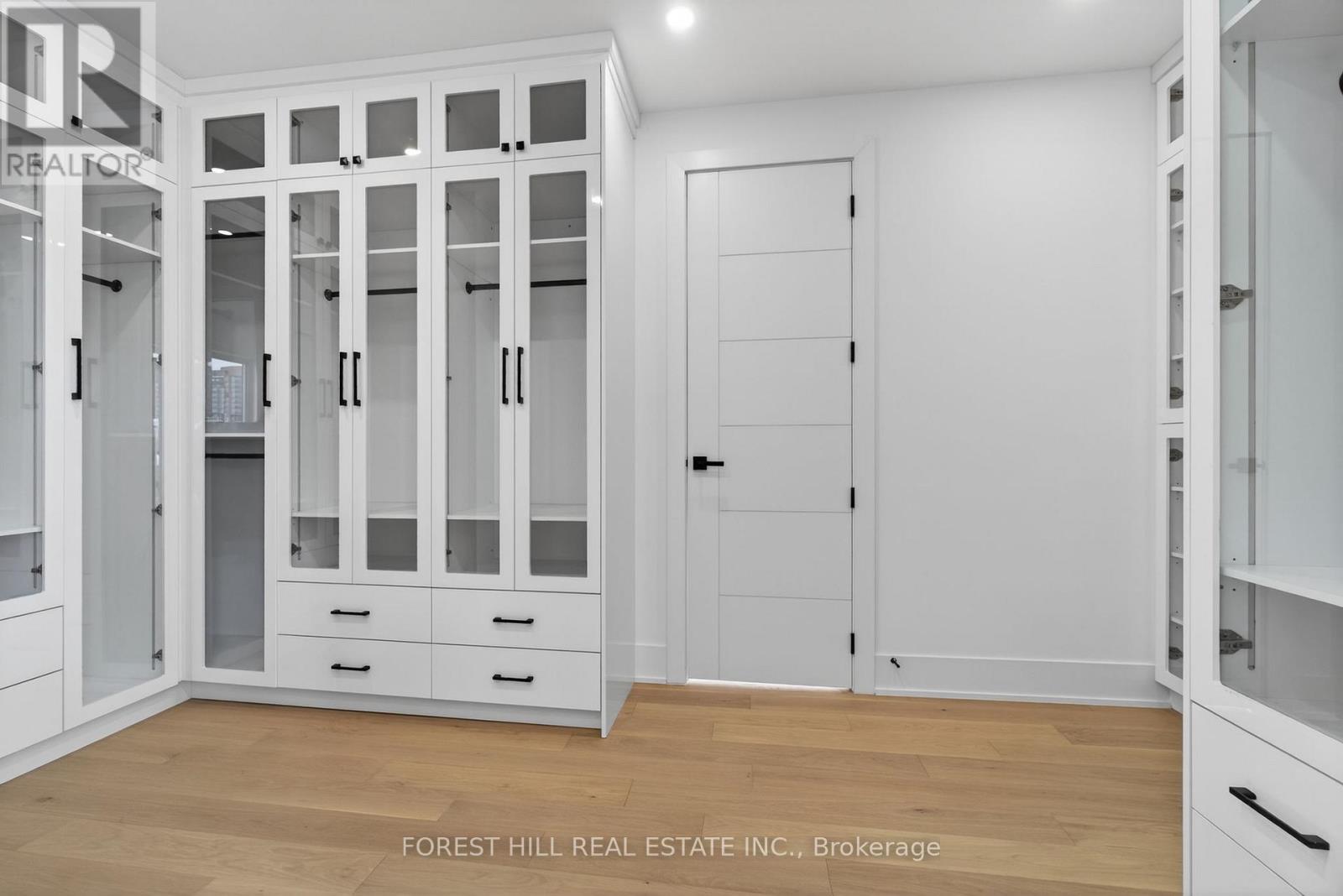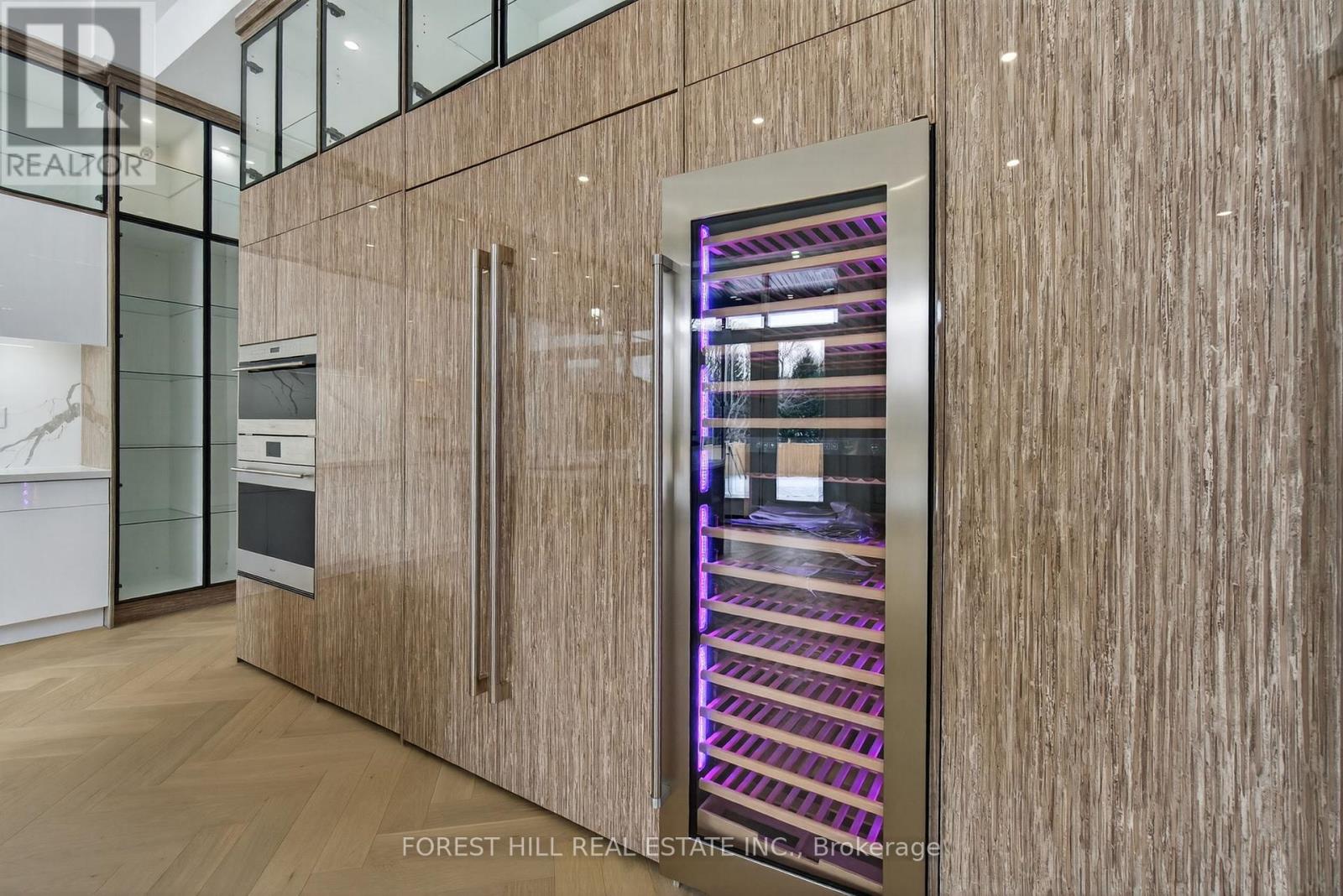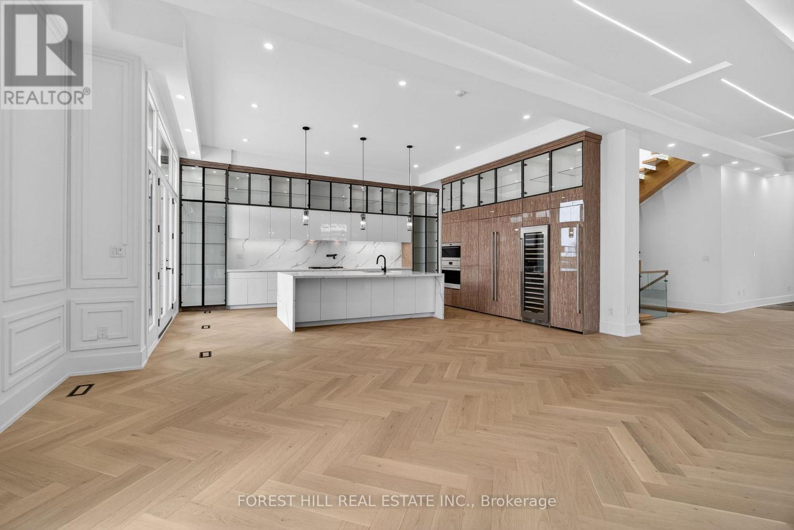 Absolutely stunning modern custom-built home in a prime Toronto location, showcasing exceptional craftsmanship and luxury designer finishes throughout. No expense spared in this architectural masterpiece featuring soaring 24-ft ceilings in the grand open-to-above foyer, dramatic custom millwork, extensive wainscoting and crown moulding, and rich herringbone-style hardwood flooring throughout. Thoughtfully designed with impeccable attention to detail, this home offers 12-ft ceilings on the main floor and 11-ft ceilings on the second floor, complemented by custom lighting, built-in surround sound, and high-end decor elements that elevate every space. The open-concept layout seamlessly blends elegance and functionality, highlighted by a stunning 3-sided fireplace connecting the dining and family rooms, a marble feature wall with custom cabinetry, and a designer chef's kitchen with premium panelled JennAir appliances, Wolf cooking package, oversized centre island, and a fully equipped walk-in pantry. Walk out to a beautifully finished composite deck and private patio, perfect for outdoor entertaining. Additional features include a Cambridge elevator servicing all levels, a custom floating wood staircase with glass railing, a main floor office with floor-to-ceiling windows, and a mudroom with built-in storage and marble finishes. The second level offers spacious bedrooms with ensuites and a luxurious primary retreat with fireplace, balcony, spa-inspired 5-piece ensuite, and custom walk-in closet. The fully finished lower level includes a separate apartment setup with walkout, full kitchen, additional bedrooms, recreation space with bar, and second laundry. Complete with 400-amp service, two tankless water heaters, and a total of 7 bedrooms and 8 bathrooms, this extraordinary residence delivers unparalleled luxury living inside and out, all within close proximity to Yorkdale Mall, Allen Road, and Highway 401.