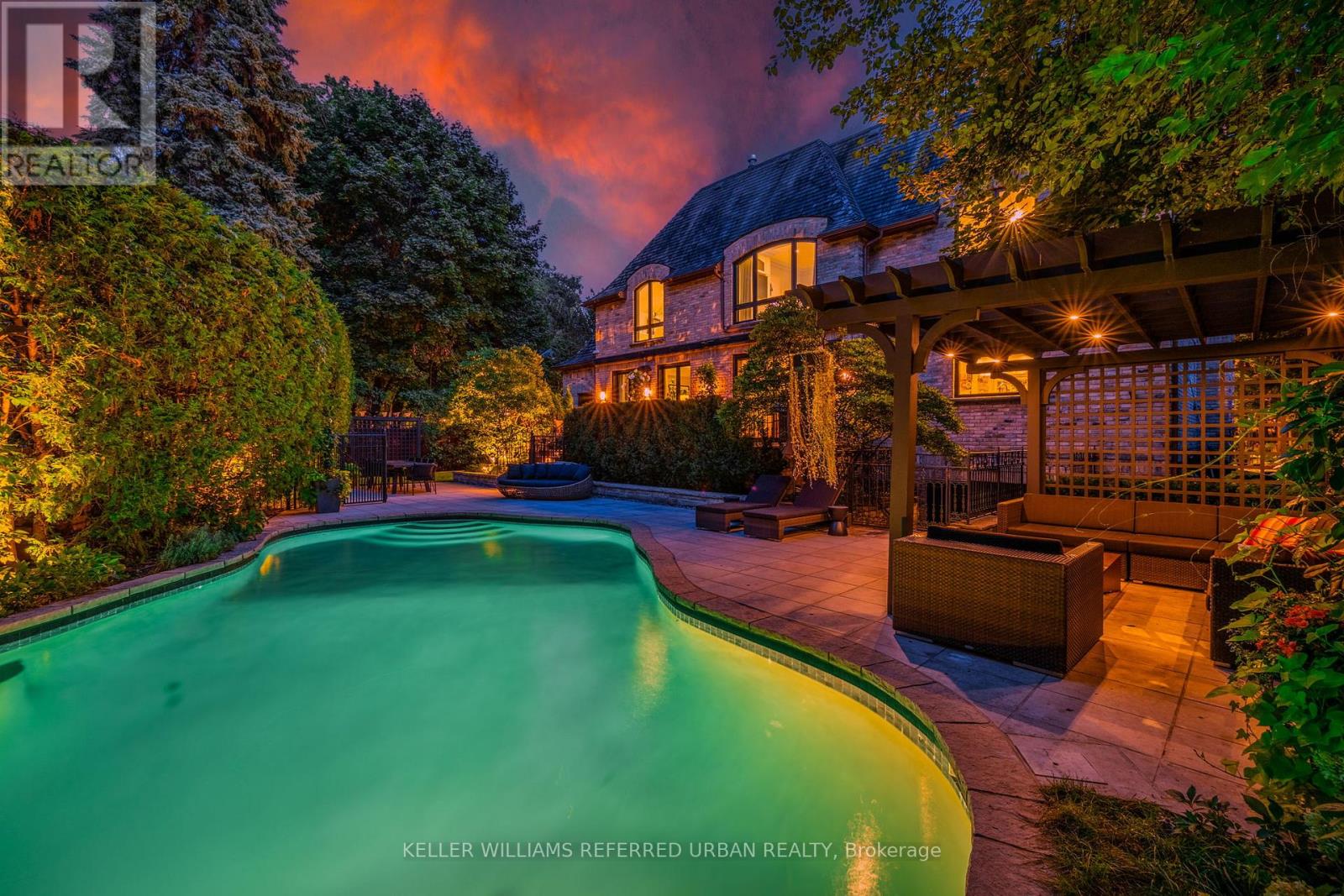 An exceptionally rare opportunity to acquire one of the largest and most distinguished residences in Lawrence Park, set on a coveted 82-foot-wide lot offering remarkable space, privacy, and presence. This Indiana limestone and reclaimed brick estate features a heated circular driveway, landscape lighting, and a three-car tandem garage with built-in cabinetry. Offering nearly 9,000 sq. ft. of total finished living space, the home delivers an outstanding, family-friendly layout with 5+2 generously sized bedrooms. The upper level includes a family lounge ideal as a children's study or additional office, while each bedroom enjoys its own ensuite with radiant in-floor heating. Inside, a grand foyer welcomes you with a formal living and dining room, a custom mahogany office, and an expansive rear living area complete with a chef's kitchen, servery, breakfast room, and a spacious family room with gas fireplace and built-in library, all seamlessly connected to the backyard. The private outdoor oasis is beautifully landscaped and centred around a heated saltwater pool with cascading stone waterfall, pergola with gas fire pit, irrigation system, and ambient lighting, perfect for both everyday enjoyment and entertaining. The true showstopper lies below a hidden speakeasy-style bar and private, fully soundproofed cinema, concealed behind custom millwork, designed for unforgettable movie nights, sophisticated soirées, and legendary kids' birthday parties. The lower level also includes a rec room, private gym, wine cellar with tasting area (awaiting customization), and two additional bedrooms ideal for guests or in-laws. Steps to Toronto French School, Cheltenham Park, and the Granite Club, homes of this caliber in this exclusive Lawrence Park enclave are rarely offered.