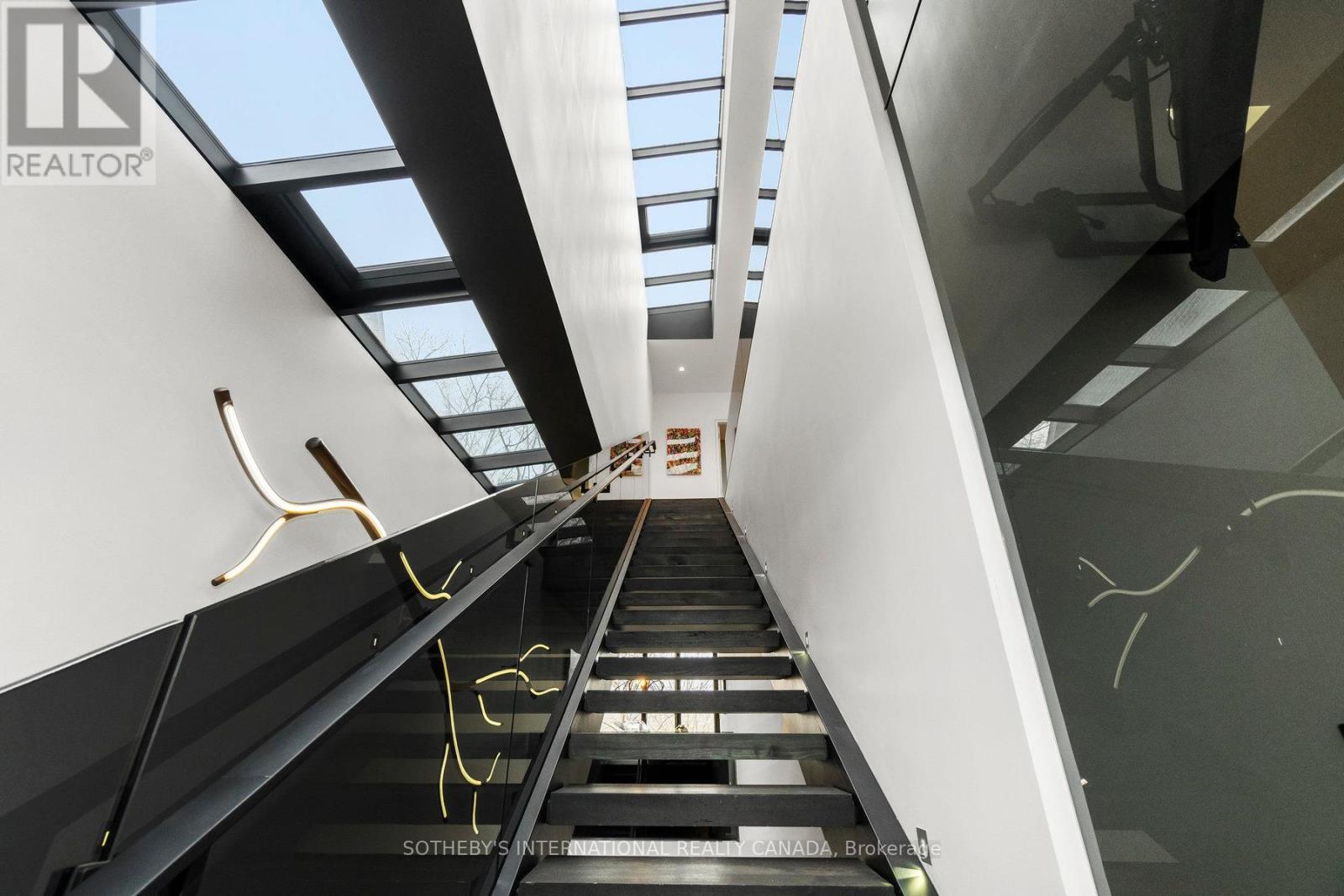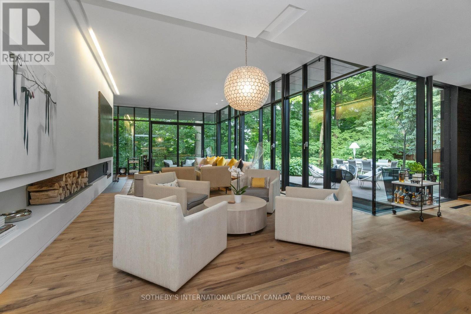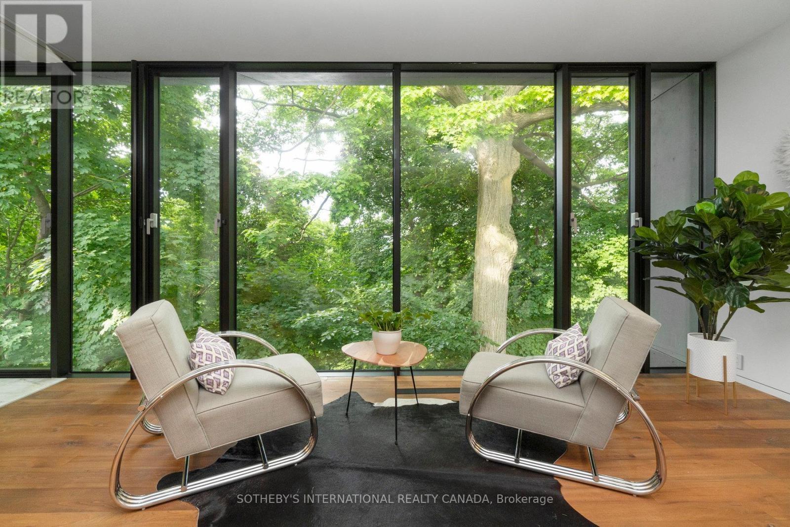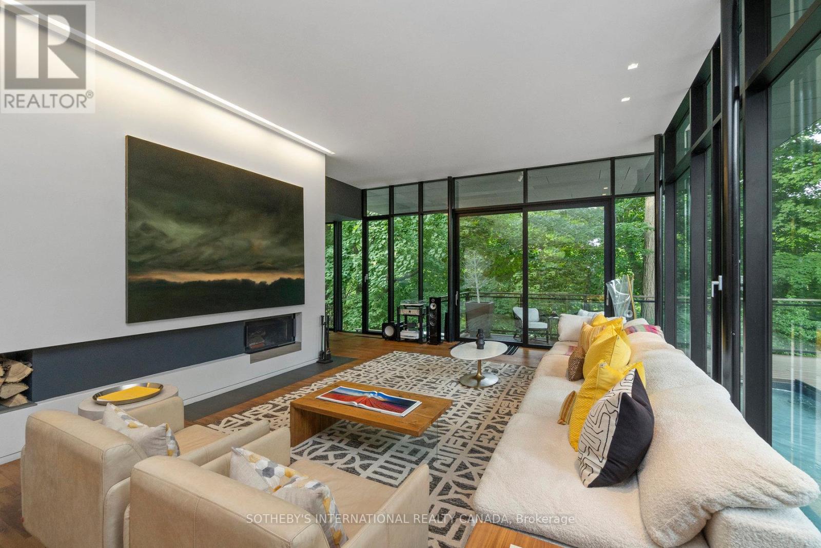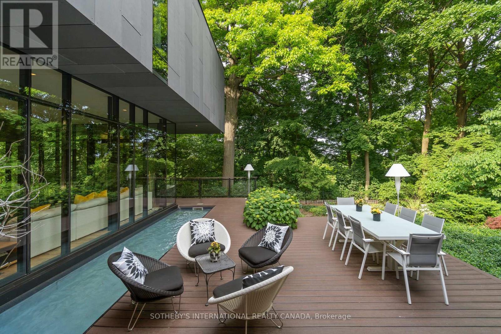 Riverview House is a rare architectural statement overlooking Rosedale Golf Club, quietly positioned within the exclusive enclave of Teddington Park. Designed by Bruce Kuwabara, the residence embodies a seamless dialogue between modern design and its ravine setting, where architecture and nature exist in perfect balance. Expansive glass curtain walls dissolve the boundary between indoors and out, inviting light to move freely through the home while framing uninterrupted views of the surrounding landscape. Reclaimed elm flooring, milled from historic factory beams, and refined ipe wood detailing introduce warmth and texture to the clean, contemporary lines.The main living spaces unfold effortlessly, anchored by a chef's kitchen with an oversized marble island, designed for both intimate daily living and elegant entertaining. A sculptural, single-piece steel staircase-illuminated by a striking skylight-leads to the upper level, where the primary suite floats above the ravine, offering a sense of calm reminiscent of a private treehouse. The spa-inspired marble ensuite completes this serene retreat.Two additional bedrooms, an open den, and a gallery-style corridor define the upper level, while a discreet main-floor guest suite ensures privacy for visitors. The lower level with heated concrete floors provides versatile living space tailored for comfort and function.Outdoors, the ravine setting is elevated into a private wellness retreat, complete with a hot tub, outdoor sauna, and cold plunge-offering a spa-like experience immersed in nature. The landscape transforms beautifully with the seasons, from lush summer privacy to a serene winter backdrop. Sustainable by design, the home incorporates green roofs, a permeable driveway, and high-efficiency zoned systems. Moments from Toronto's top private schools, including Havergal, Crescent, and Toronto French School Riverview House is a residence of rare distinction-where thoughtful design, craftsmanship, and setting converge. (id:65552)