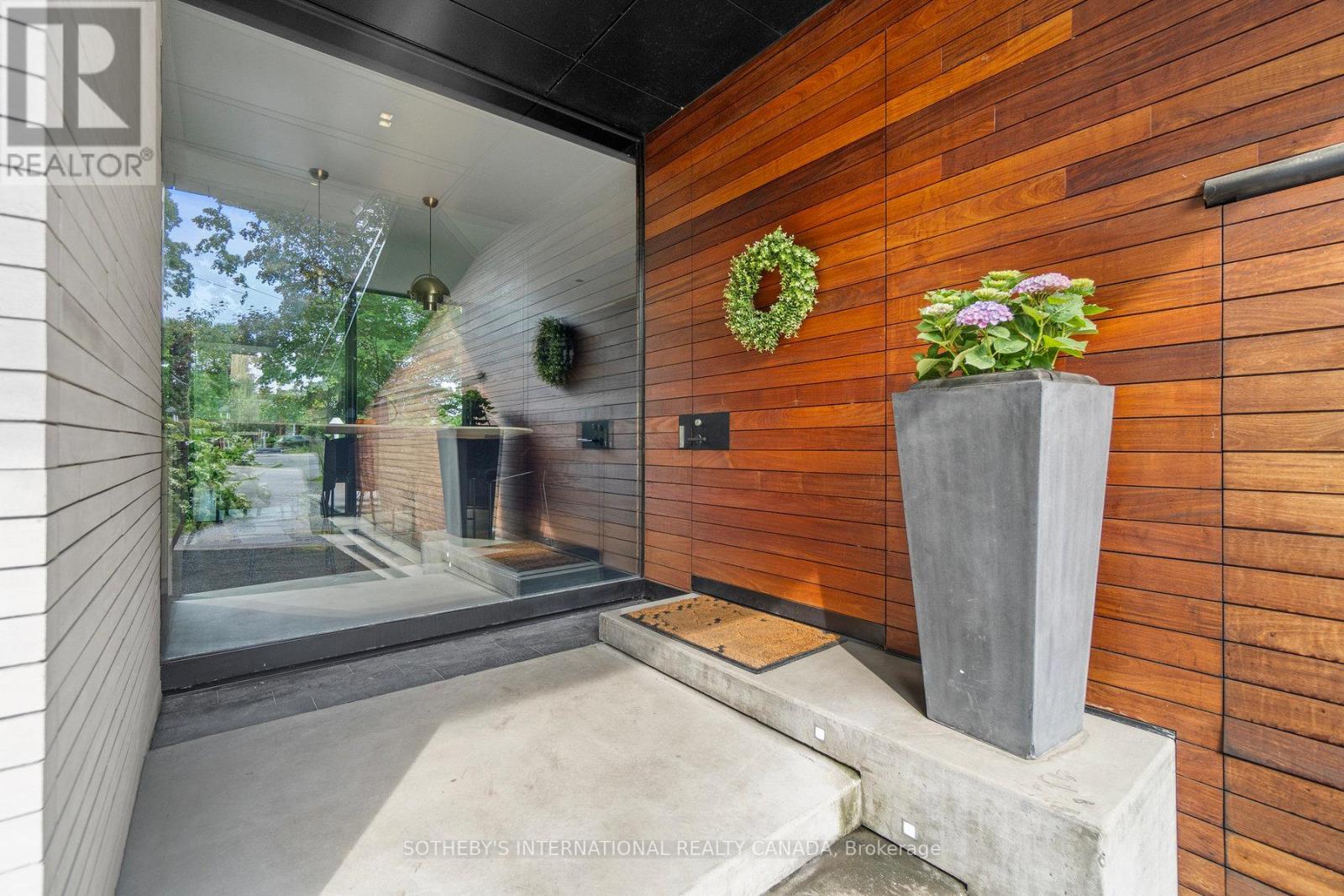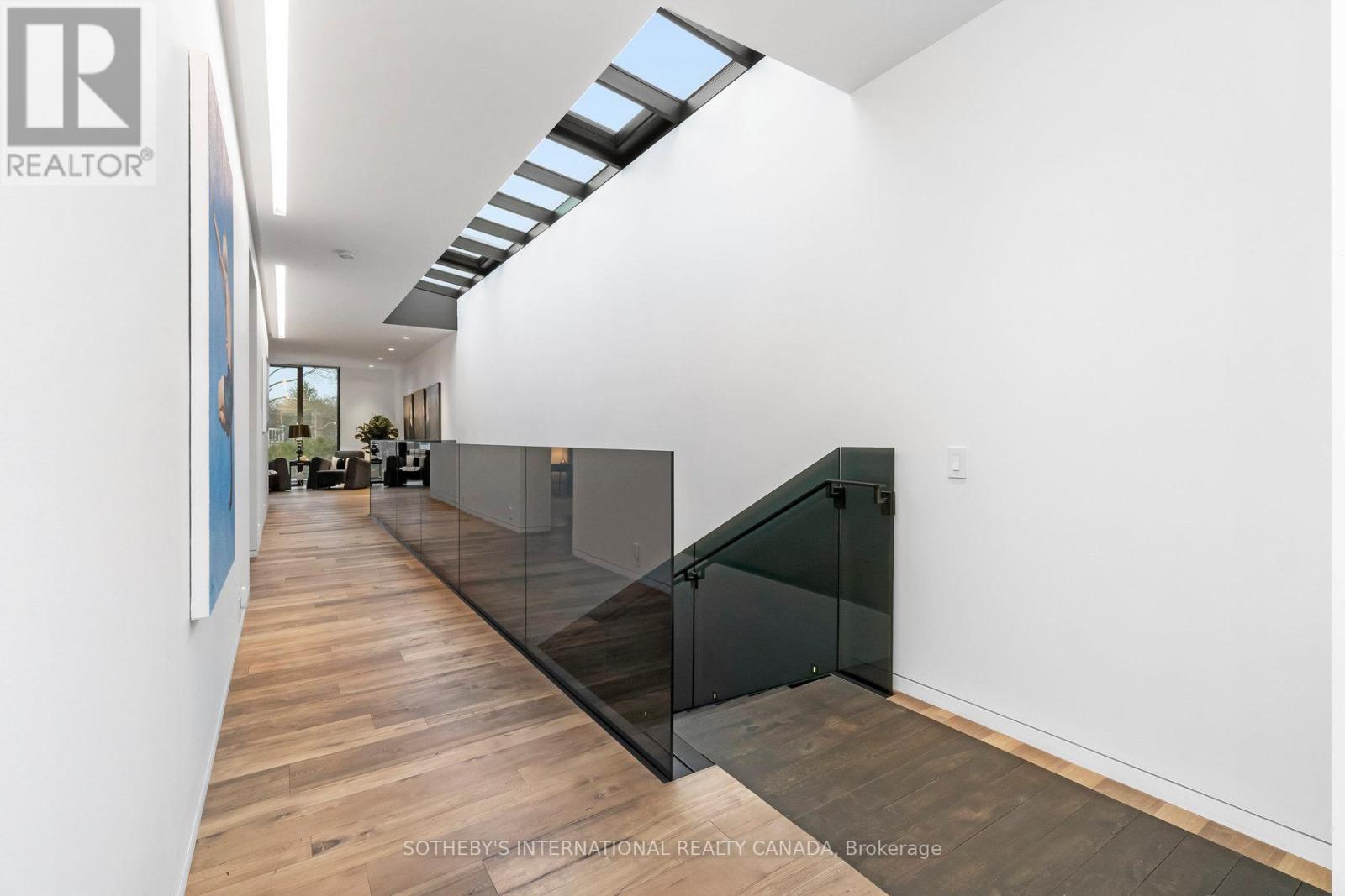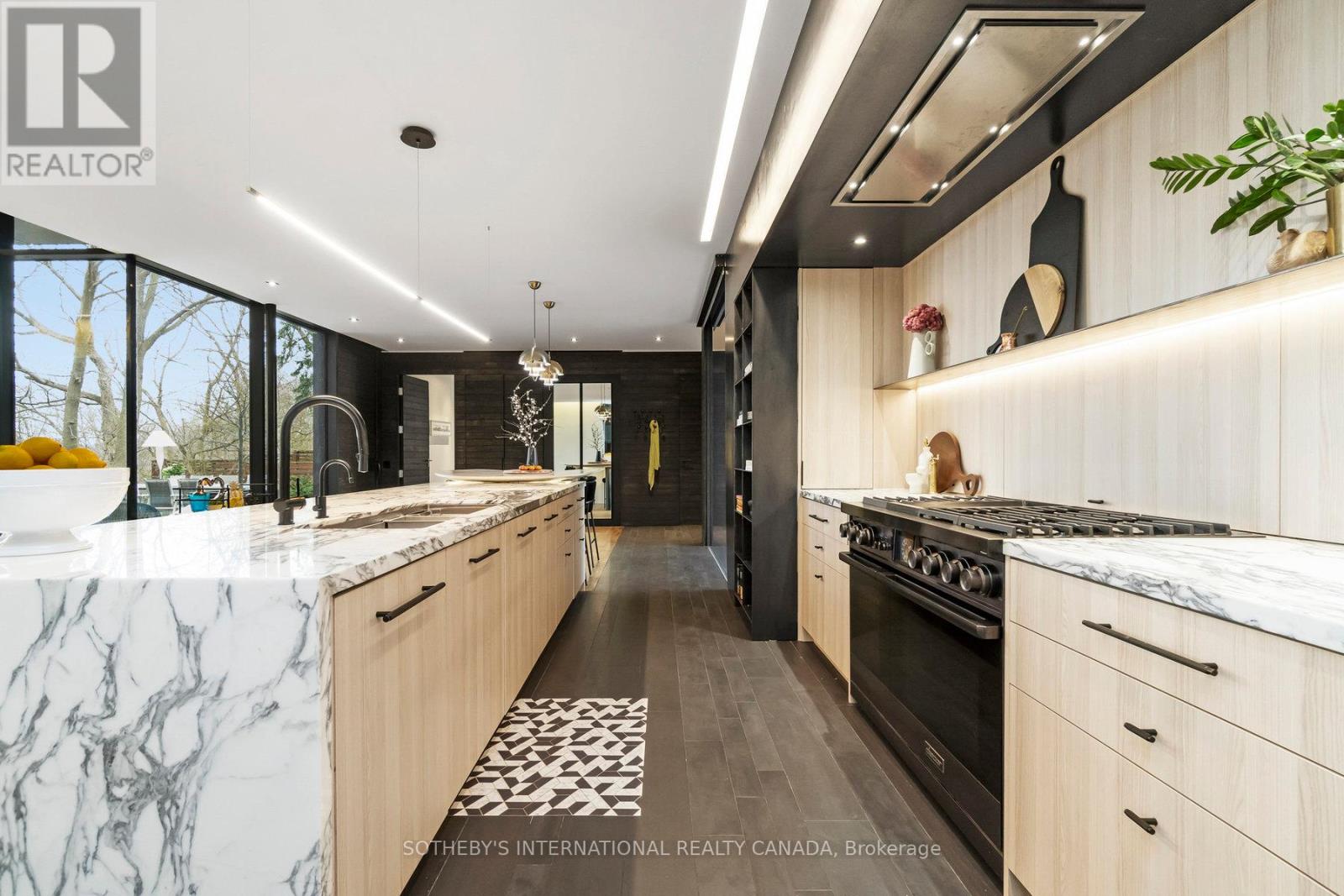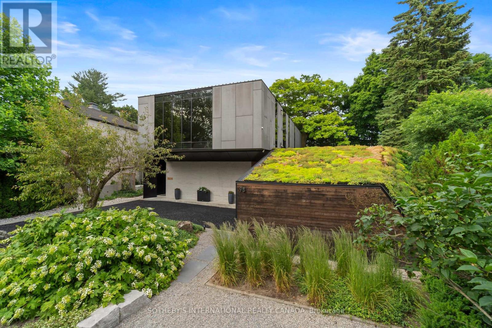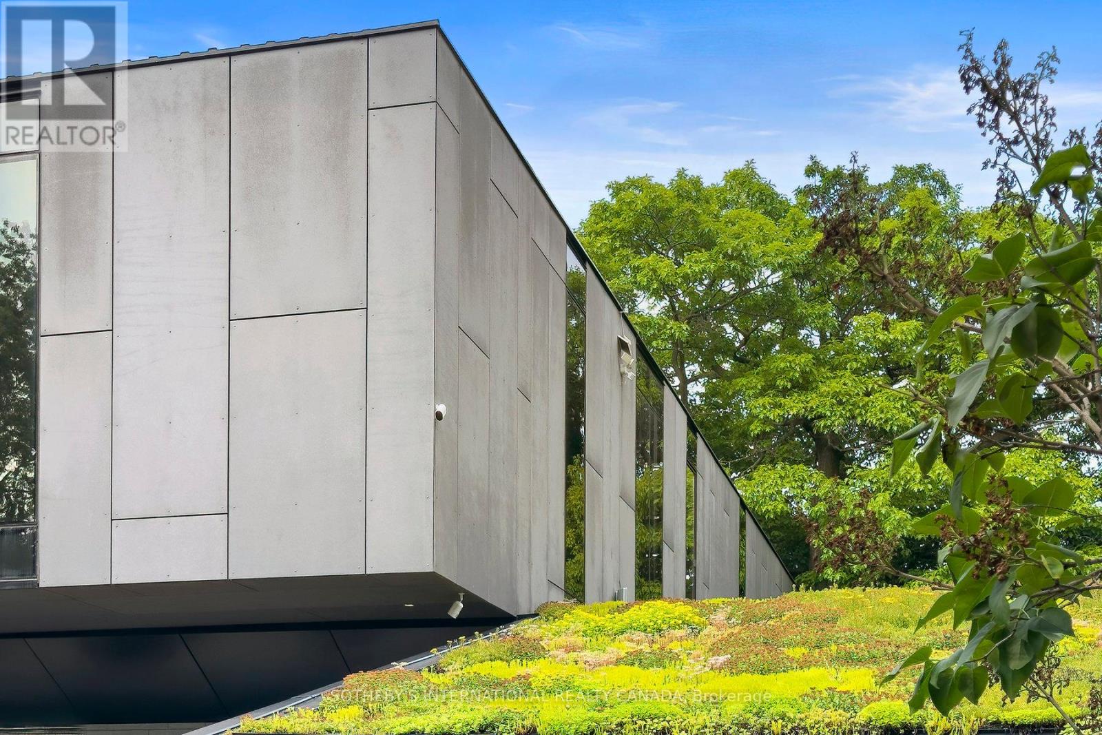 Riverview House is a rare architectural statement overlooking Rosedale Golf Club, quietly positioned within the exclusive enclave of Teddington Park. Designed by Bruce Kuwabara, the residence embodies a seamless dialogue between modern design and its ravine setting, where architecture and nature exist in perfect balance. Expansive glass curtain walls dissolve the boundary between indoors and out, inviting light to move freely through the home while framing uninterrupted views of the surrounding landscape. Reclaimed elm flooring, milled from historic factory beams, and refined ipe wood detailing introduce warmth and texture to the clean, contemporary lines.The main living spaces unfold effortlessly, anchored by a chef's kitchen with an oversized marble island, designed for both intimate daily living and elegant entertaining. A sculptural, single-piece steel staircase-illuminated by a striking skylight-leads to the upper level, where the primary suite floats above the ravine, offering a sense of calm reminiscent of a private treehouse. The spa-inspired marble ensuite completes this serene retreat.Two additional bedrooms, an open den, and a gallery-style corridor define the upper level, while a discreet main-floor guest suite ensures privacy for visitors. The lower level with heated concrete floors provides versatile living space tailored for comfort and function.Outdoors, the ravine setting is elevated into a private wellness retreat, complete with a hot tub, outdoor sauna, and cold plunge-offering a spa-like experience immersed in nature. The landscape transforms beautifully with the seasons, from lush summer privacy to a serene winter backdrop. Sustainable by design, the home incorporates green roofs, a permeable driveway, and high-efficiency zoned systems. Moments from Toronto's top private schools, including Havergal, Crescent, and Toronto French School Riverview House is a residence of rare distinction-where thoughtful design, craftsmanship, and setting converge. (id:65552)