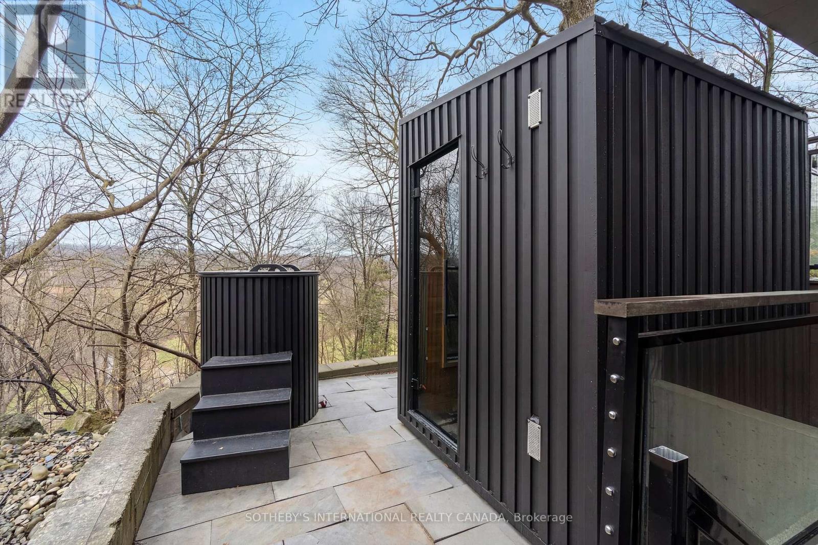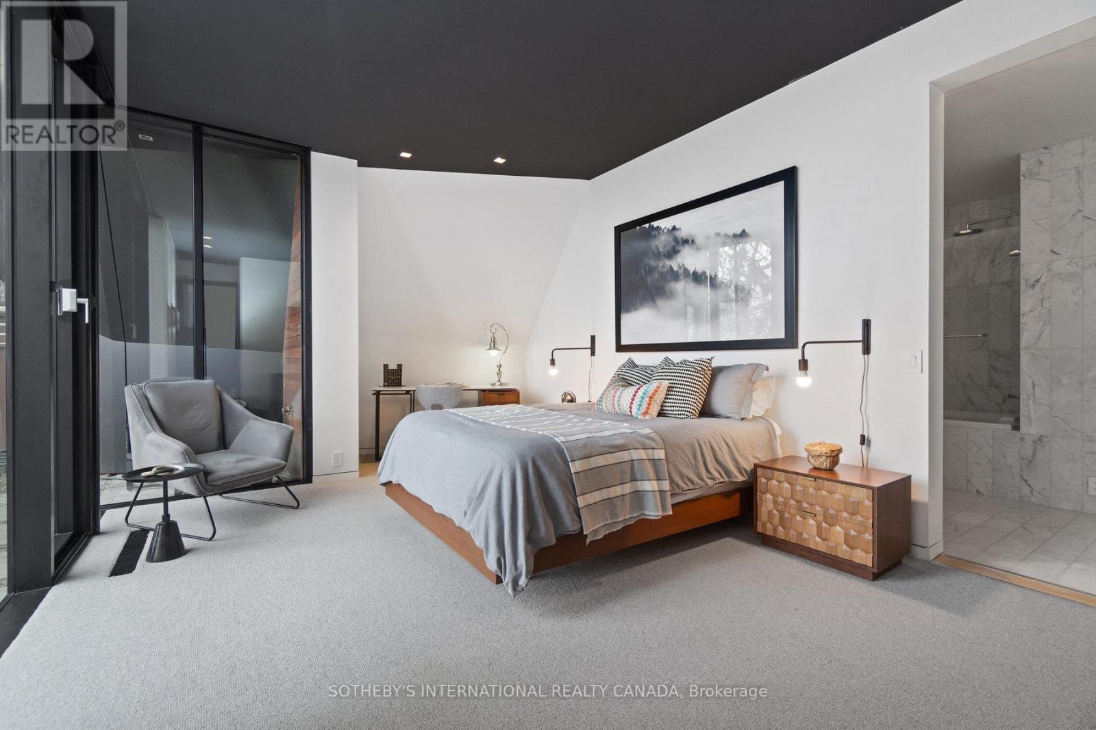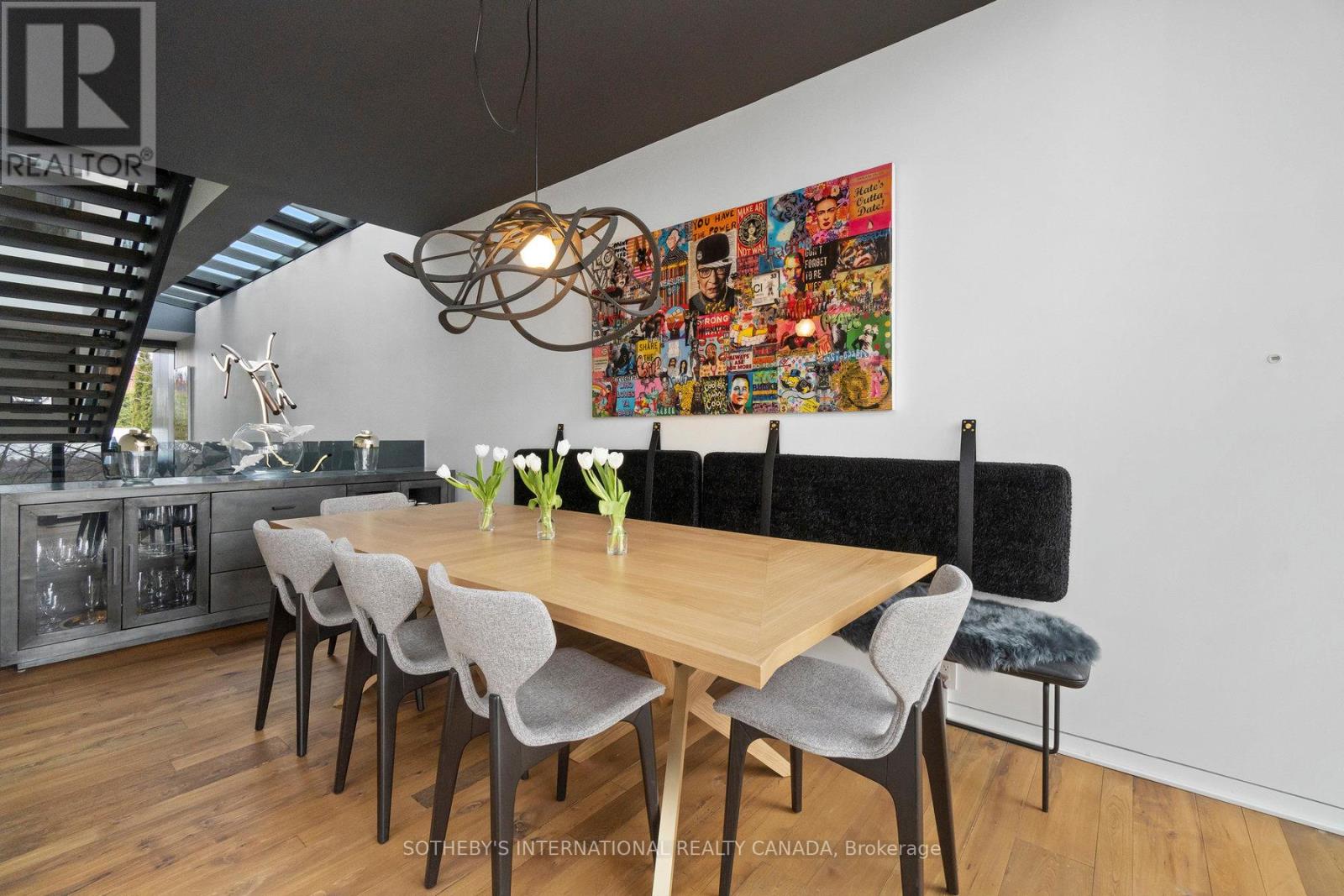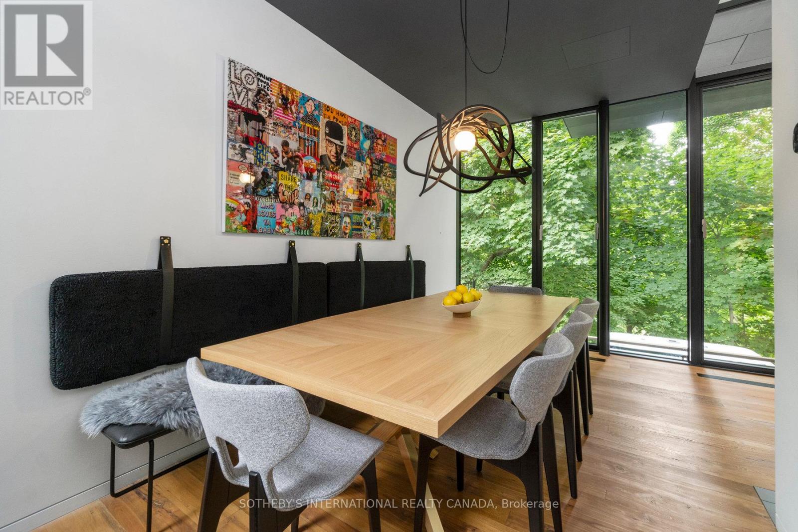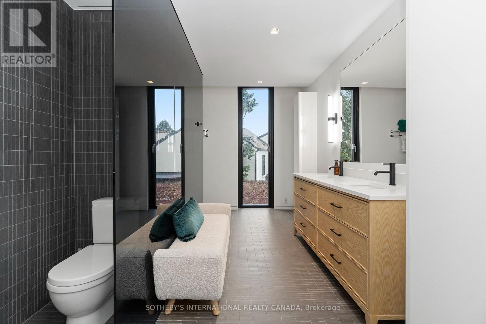 Riverview House is a rare architectural statement overlooking Rosedale Golf Club, quietly positioned within the exclusive enclave of Teddington Park. Designed by Bruce Kuwabara, the residence embodies a seamless dialogue between modern design and its ravine setting, where architecture and nature exist in perfect balance. Expansive glass curtain walls dissolve the boundary between indoors and out, inviting light to move freely through the home while framing uninterrupted views of the surrounding landscape. Reclaimed elm flooring, milled from historic factory beams, and refined ipe wood detailing introduce warmth and texture to the clean, contemporary lines.The main living spaces unfold effortlessly, anchored by a chef's kitchen with an oversized marble island, designed for both intimate daily living and elegant entertaining. A sculptural, single-piece steel staircase-illuminated by a striking skylight-leads to the upper level, where the primary suite floats above the ravine, offering a sense of calm reminiscent of a private treehouse. The spa-inspired marble ensuite completes this serene retreat.Two additional bedrooms, an open den, and a gallery-style corridor define the upper level, while a discreet main-floor guest suite ensures privacy for visitors. The lower level with heated concrete floors provides versatile living space tailored for comfort and function.Outdoors, the ravine setting is elevated into a private wellness retreat, complete with a hot tub, outdoor sauna, and cold plunge-offering a spa-like experience immersed in nature. The landscape transforms beautifully with the seasons, from lush summer privacy to a serene winter backdrop. Sustainable by design, the home incorporates green roofs, a permeable driveway, and high-efficiency zoned systems. Moments from Toronto's top private schools, including Havergal, Crescent, and Toronto French School Riverview House is a residence of rare distinction-where thoughtful design, craftsmanship, and setting converge. (id:65552)