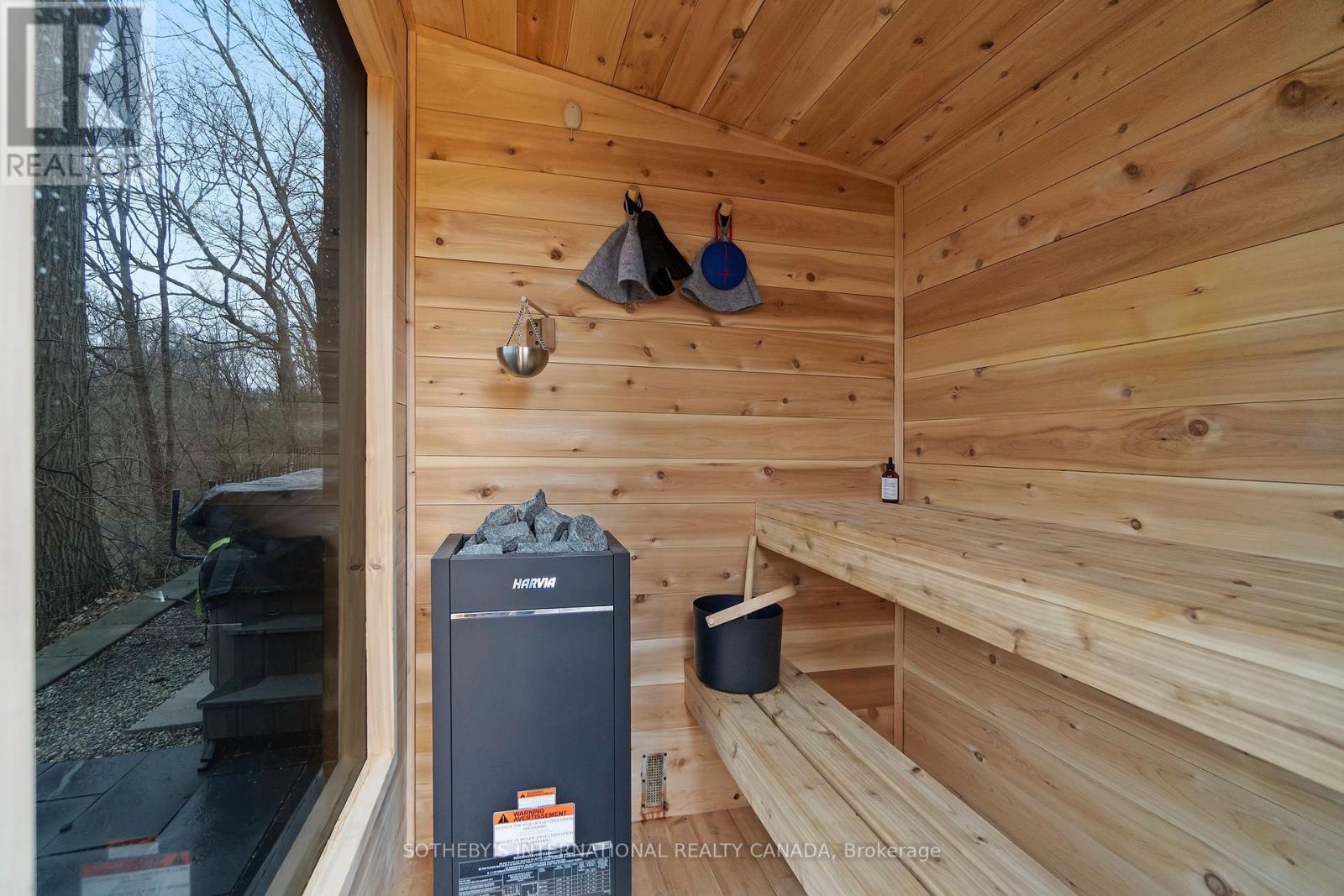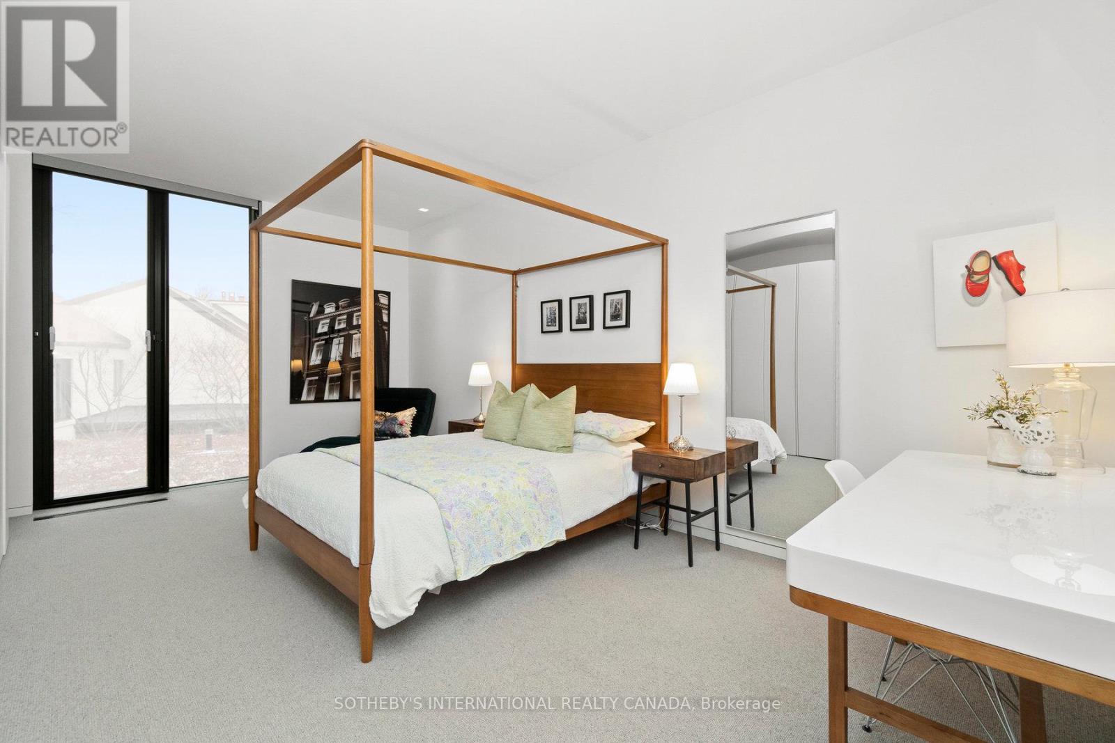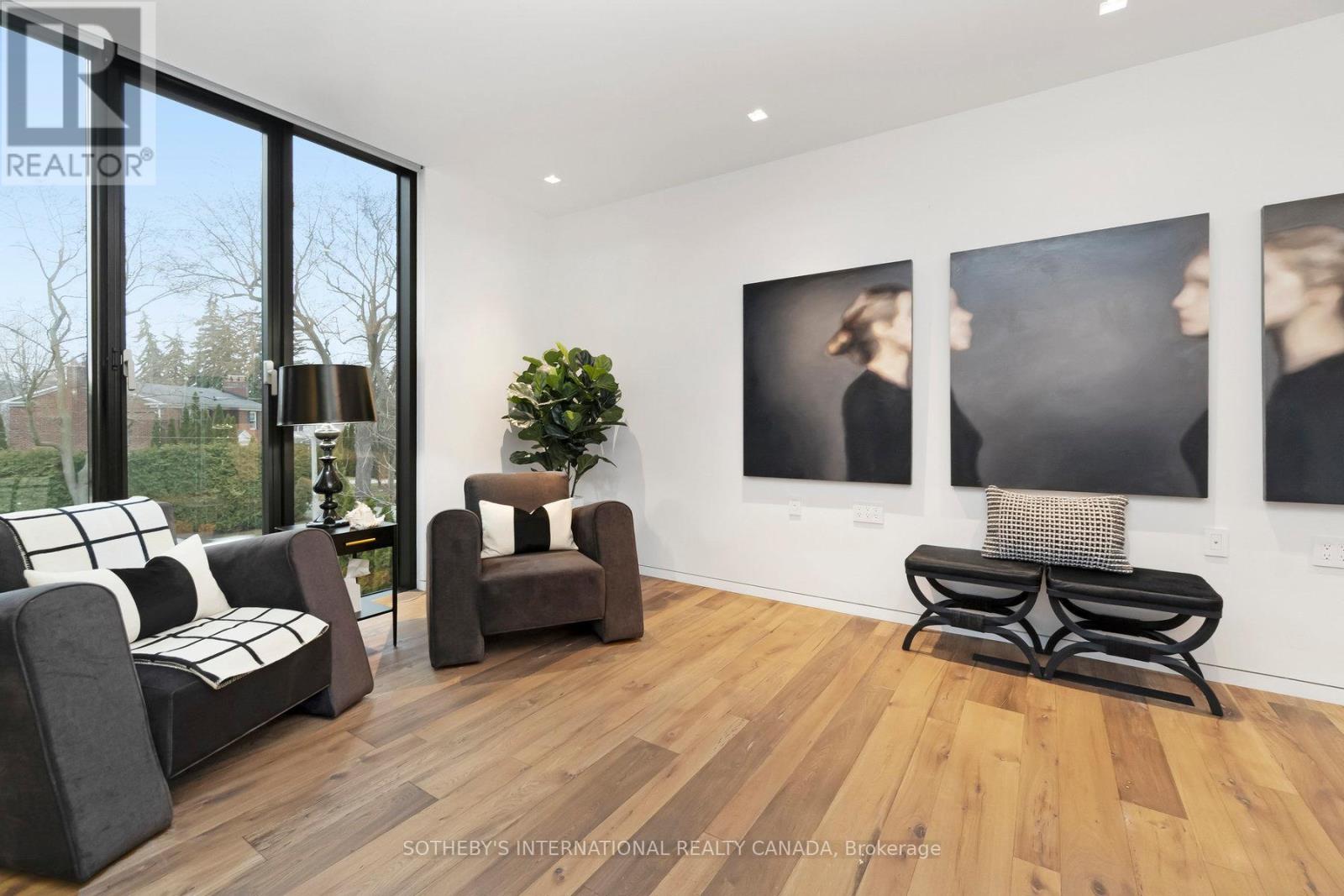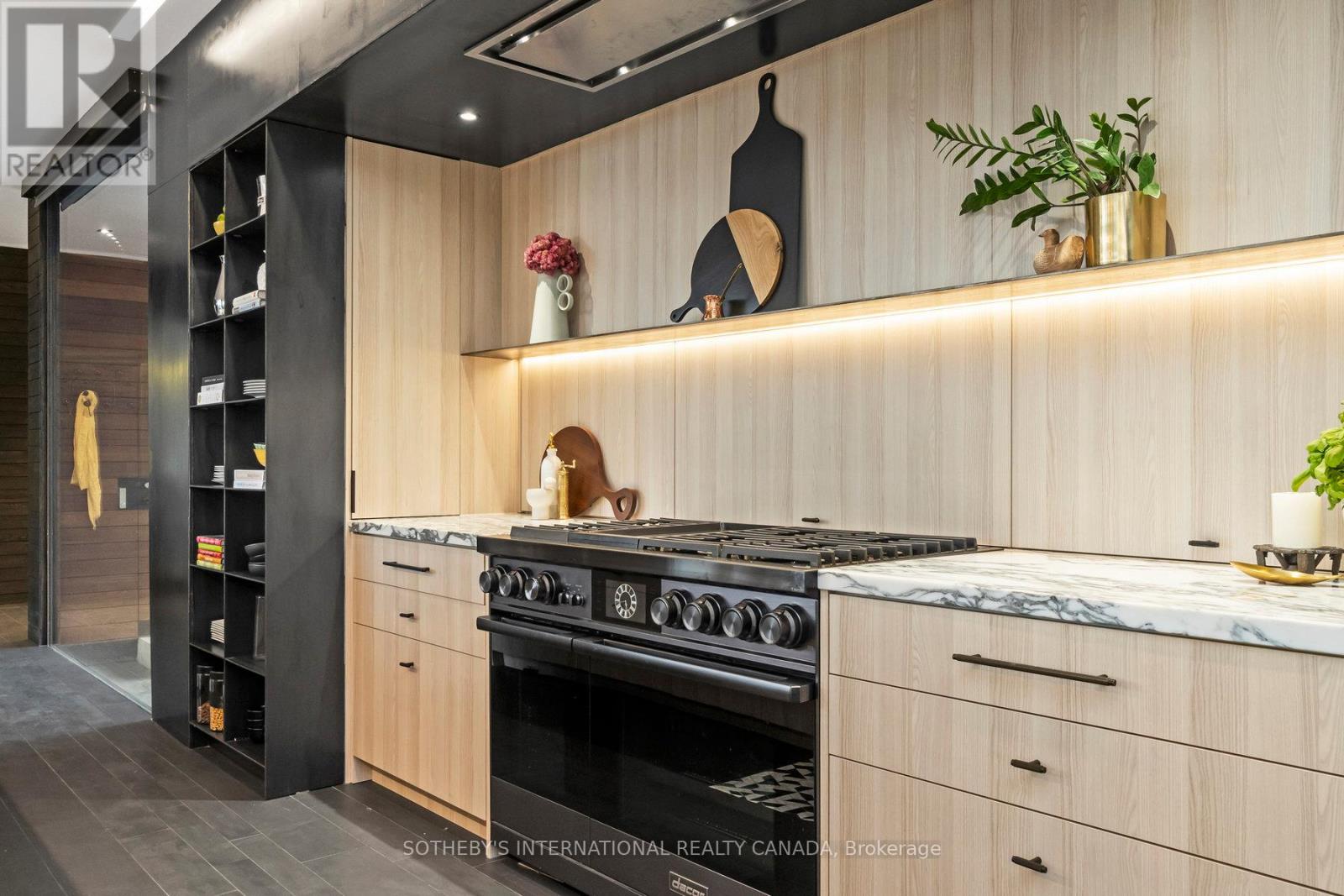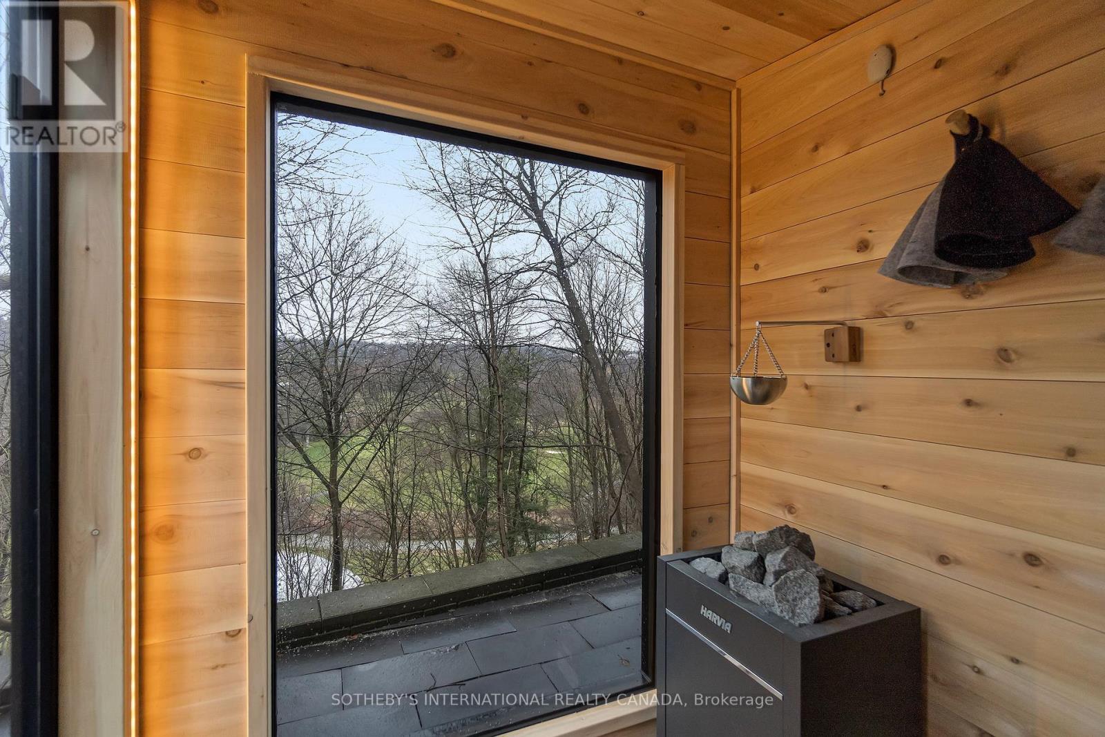 Riverview House is a rare architectural statement overlooking Rosedale Golf Club, quietly positioned within the exclusive enclave of Teddington Park. Designed by Bruce Kuwabara, the residence embodies a seamless dialogue between modern design and its ravine setting, where architecture and nature exist in perfect balance. Expansive glass curtain walls dissolve the boundary between indoors and out, inviting light to move freely through the home while framing uninterrupted views of the surrounding landscape. Reclaimed elm flooring, milled from historic factory beams, and refined ipe wood detailing introduce warmth and texture to the clean, contemporary lines.The main living spaces unfold effortlessly, anchored by a chef's kitchen with an oversized marble island, designed for both intimate daily living and elegant entertaining. A sculptural, single-piece steel staircase-illuminated by a striking skylight-leads to the upper level, where the primary suite floats above the ravine, offering a sense of calm reminiscent of a private treehouse. The spa-inspired marble ensuite completes this serene retreat.Two additional bedrooms, an open den, and a gallery-style corridor define the upper level, while a discreet main-floor guest suite ensures privacy for visitors. The lower level with heated concrete floors provides versatile living space tailored for comfort and function.Outdoors, the ravine setting is elevated into a private wellness retreat, complete with a hot tub, outdoor sauna, and cold plunge-offering a spa-like experience immersed in nature. The landscape transforms beautifully with the seasons, from lush summer privacy to a serene winter backdrop. Sustainable by design, the home incorporates green roofs, a permeable driveway, and high-efficiency zoned systems. Moments from Toronto's top private schools, including Havergal, Crescent, and Toronto French School Riverview House is a residence of rare distinction-where thoughtful design, craftsmanship, and setting converge. (id:65552)